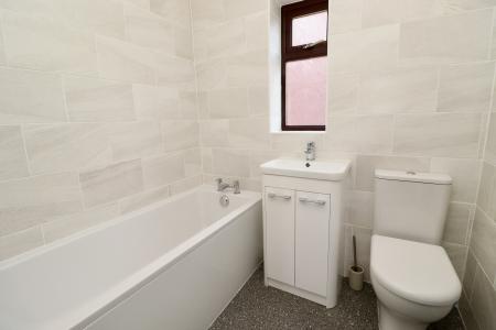 BATHROOM Fitted with a three piece suite comprising of panelled bath, close coupled WC and wash hand basin in a vanity style unit, tiled walls, chrome towel radiator and double glazed window to the side aspect.