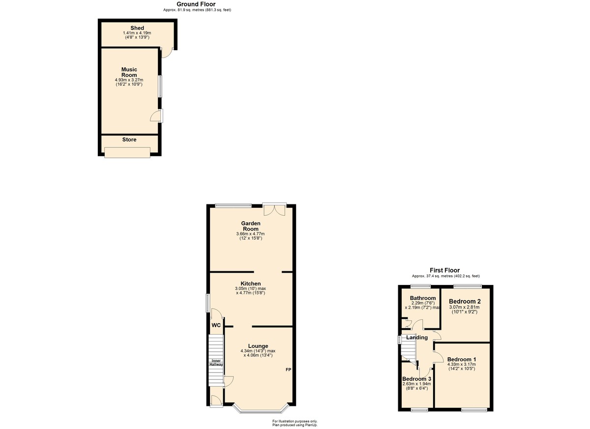 MUSIC ROOM 13' 1" x 10' 8" (4.*93m x 3.27m)