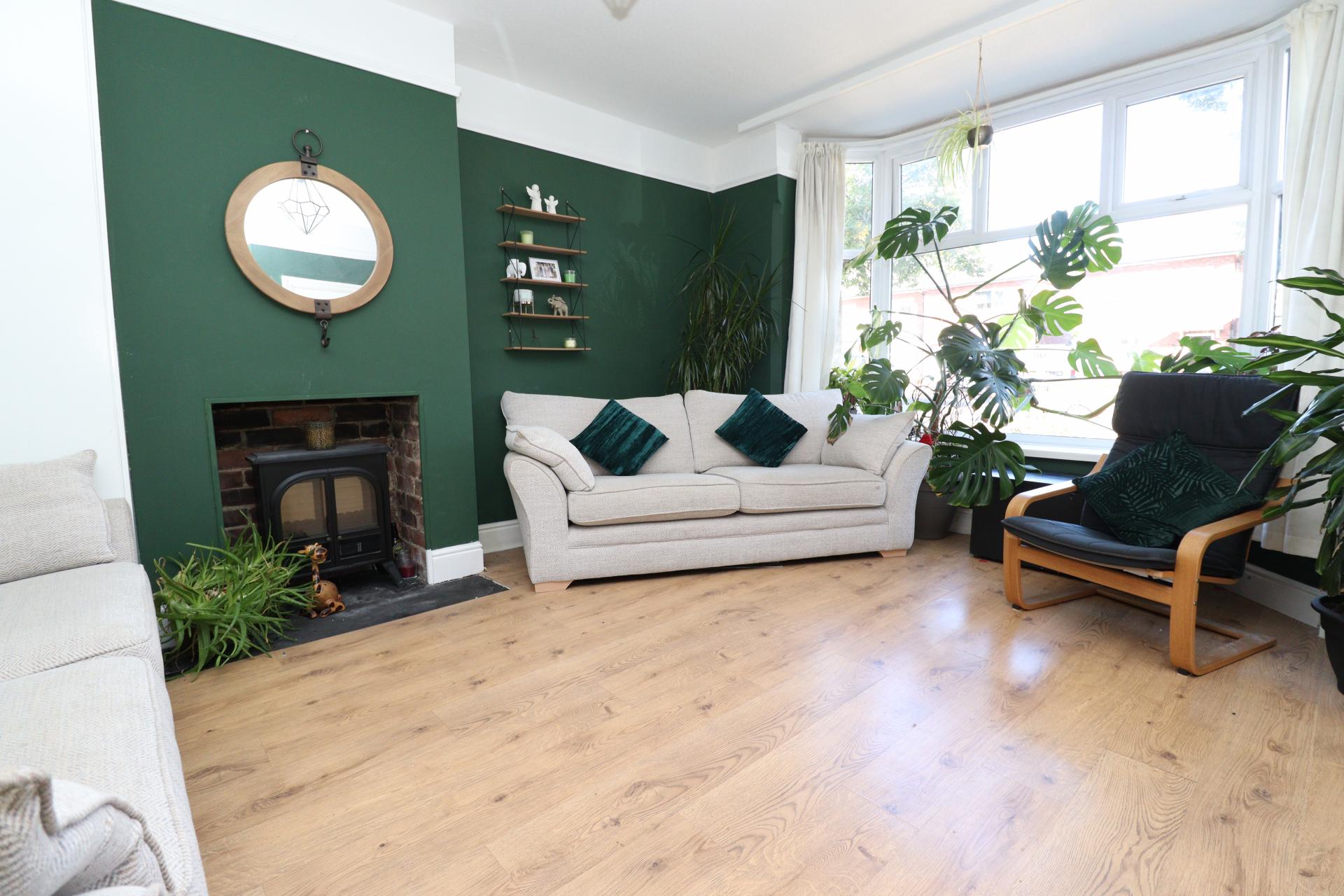 LOUNGE 14' 2" x 13' 3" (4.34m x 4.06m) With walk-in uPVC bay window to the front, inset fireplace, fitted cupboard, laminate flooring and doorway leading to the Dining Kitchen.