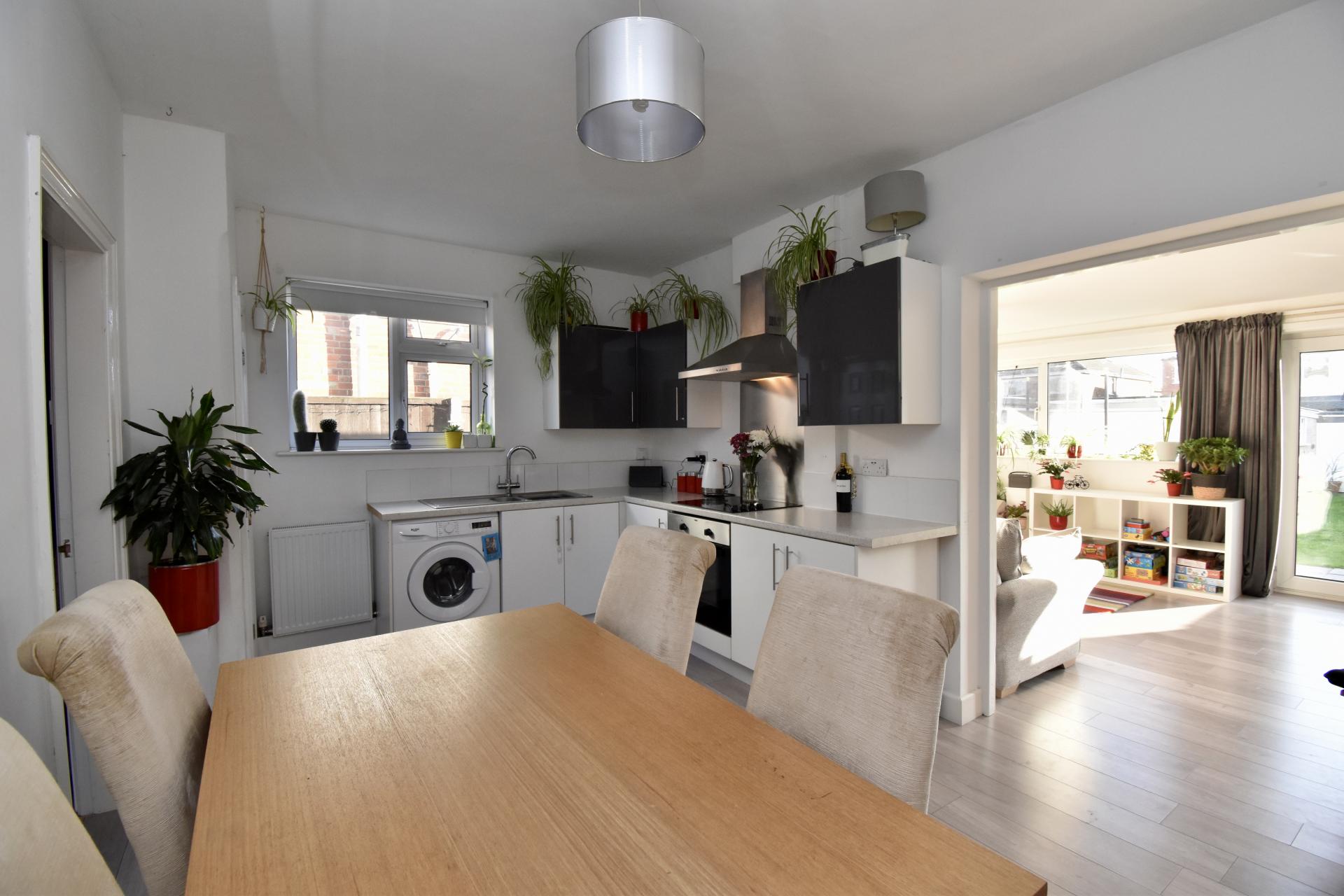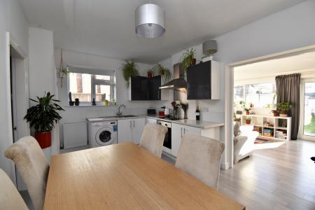DINING KITCHEN 15' 7" x 11' 7" (4.77m x 3.54m) With uPVC windows to the side, laminate flooring, fitted with a range of modern wall, base units and drawers with work surfaces over and complementary tiling below, stainless steel sink unit and drainer, integral electric oven and four ring electric hob with extractor fan over, spaces for a washing machine, fridge and freezer, decorative fireplace, radiators, under stairs WC and leading into the Garden Room.