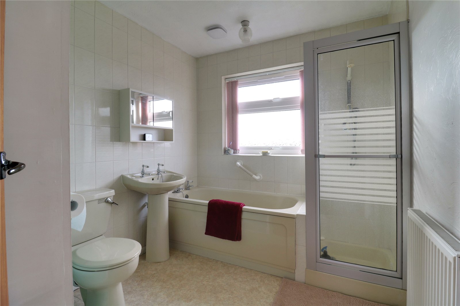 Main Family Bathroom 7'5" x 8'4" (2.26m x 2.54m). With a rear uPVC double glazed window providing a 4 piece suite comprising a low flush WC, pedestal wash hand basin, panelled bath and a walk-in shower cubicle with overhead mains shower, built-in airing cupboard which houses a modern Ideal Logic gas combi boiler, cushioned flooring and tiling to the walls.