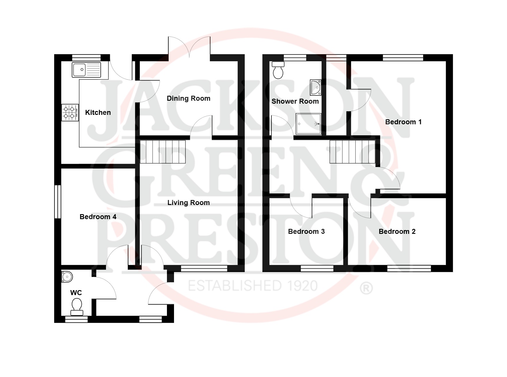 The ground floor includes an entrance hallway with access to a separate living room and a separate dining room. The kitchen is positioned to the rear with views over the garden. One bedroom is located on the ground floor, making it suitable for guests, home working, or multi-generational living. A ground floor cloakroom completes this level.