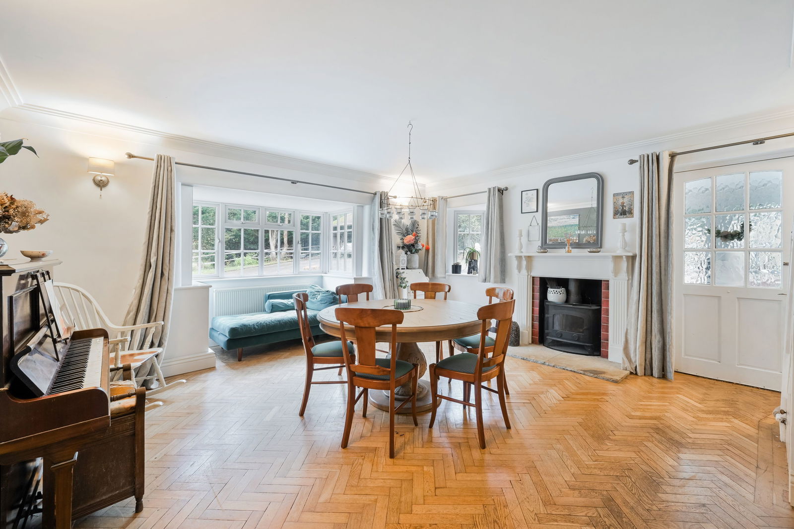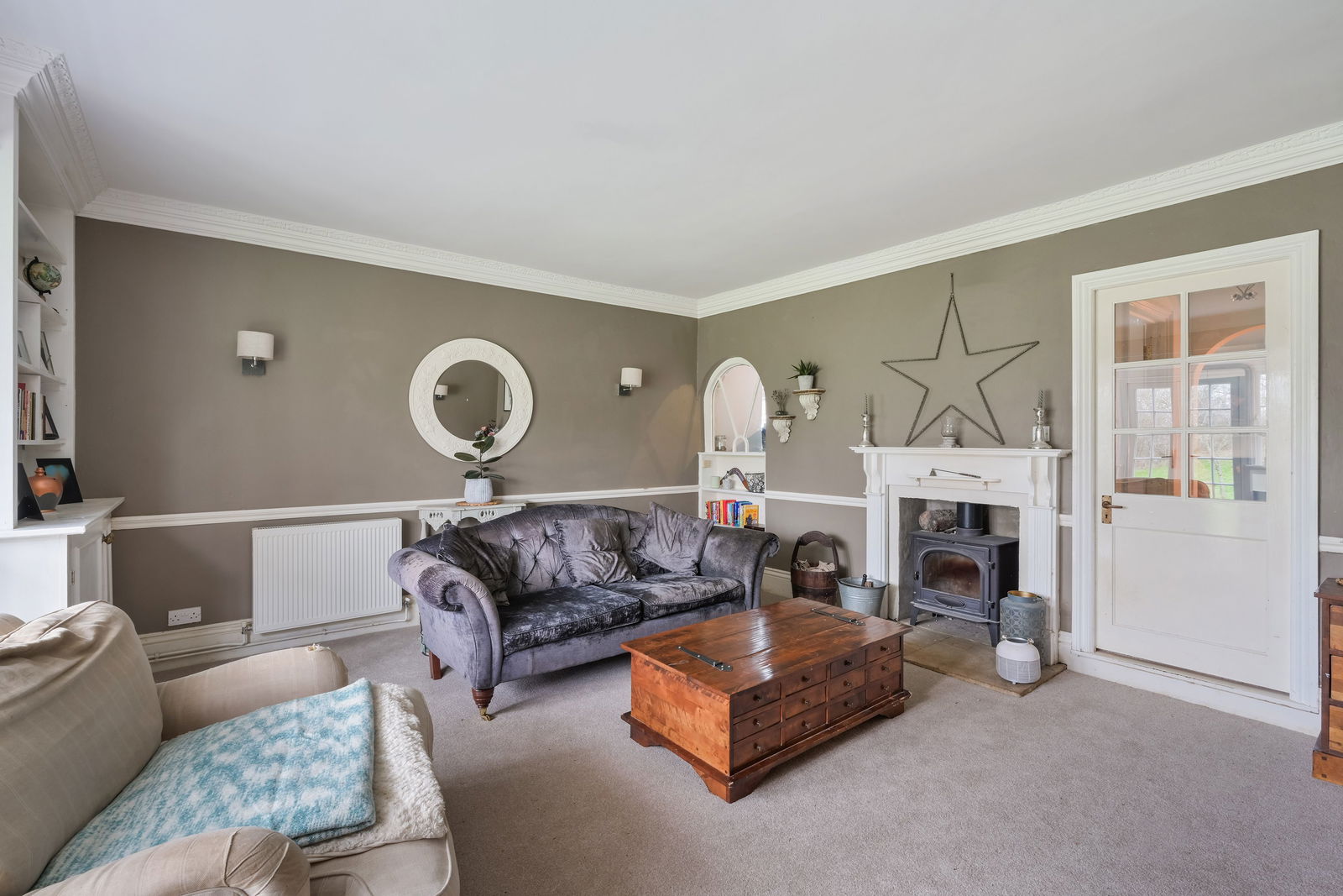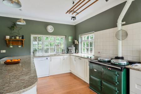 The house is approached via a long sweeping driveway leading to a turning circle and car port, immediately setting the tone for the sense of privacy and space on offer. Internally, the accommodation is well balanced and ideal for modern family living. The welcoming entrance porch opens into a dual-aspect dining room with an attractive bay window, perfect for entertaining. There is a downstairs cloakroom, a separate study ideal for home working, and a comfortable living room centred around a log burner. The heart of the home is the fitted kitchen/breakfast room, featuring a central island, an oil-fired Aga and a comprehensive range of units, complemented by a utility room and a separate boot room, both providing excellent practical space.