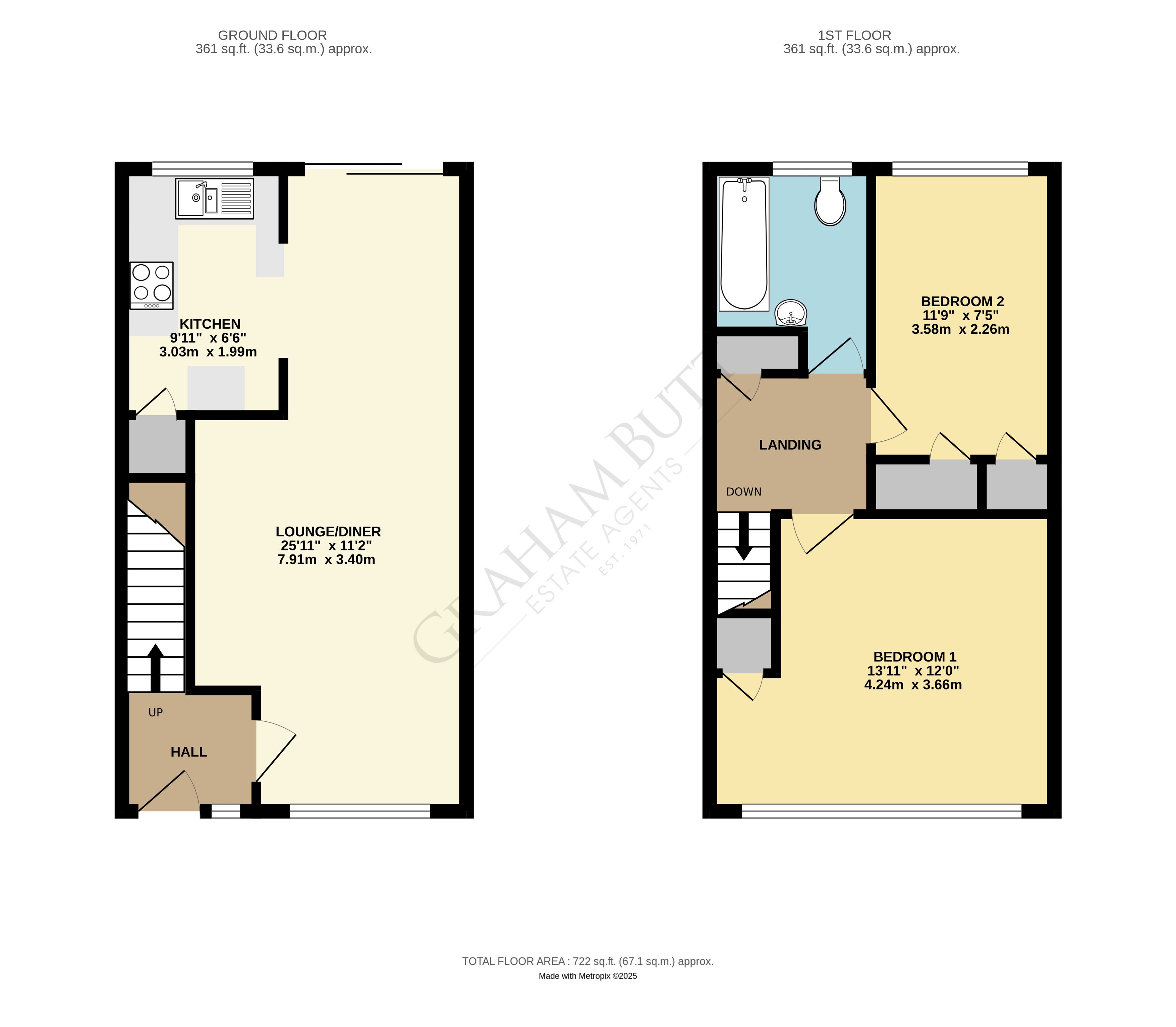Upstairs, the first floor has access to loft space, the two bedrooms are generously sized, and the family bathroom/WC.