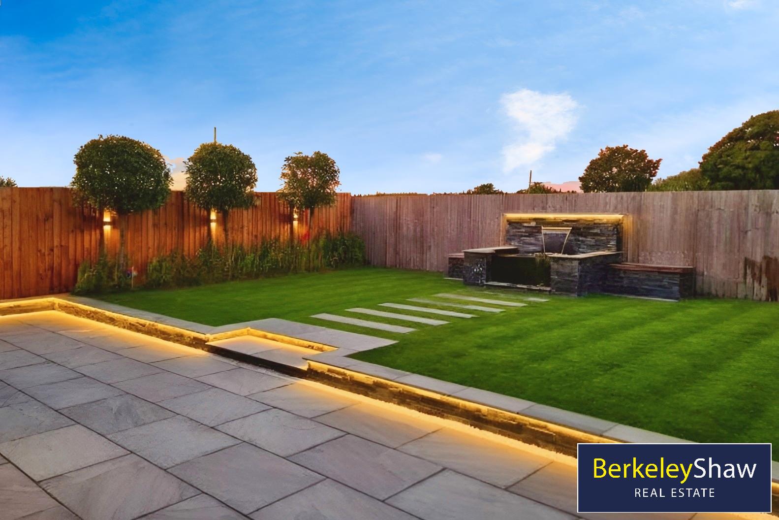 The rear garden has been professionally landscaped with Indian sandstone, Welsh slate cladding, a lawn, koi pond with waterfall lighting and a secure lean-to shed.