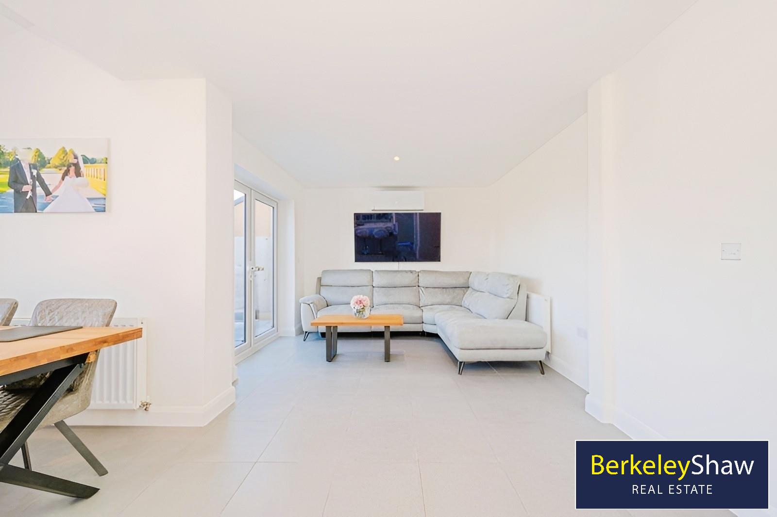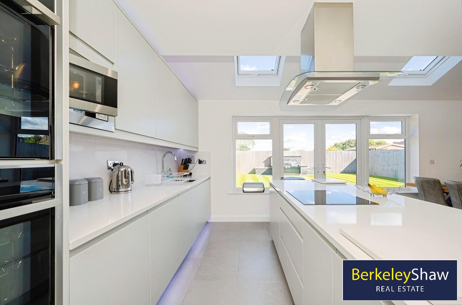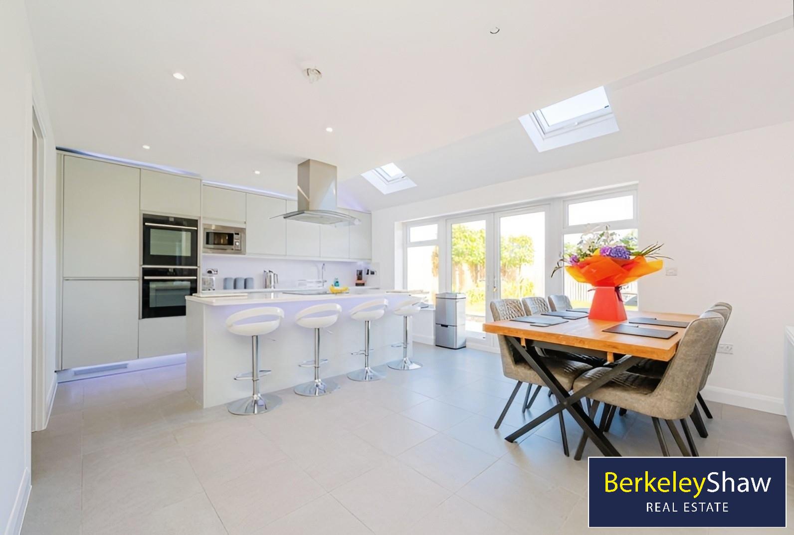 The rear of the property boasts a stunning open-plan kitchen/dining/living area with NEFF 'slide and hide' ovens, quartz worktops, integrated appliances, a central island and ambient LED lighting. French doors and skylights provide natural light, while a utility room and luxury WC complete the ground floor.