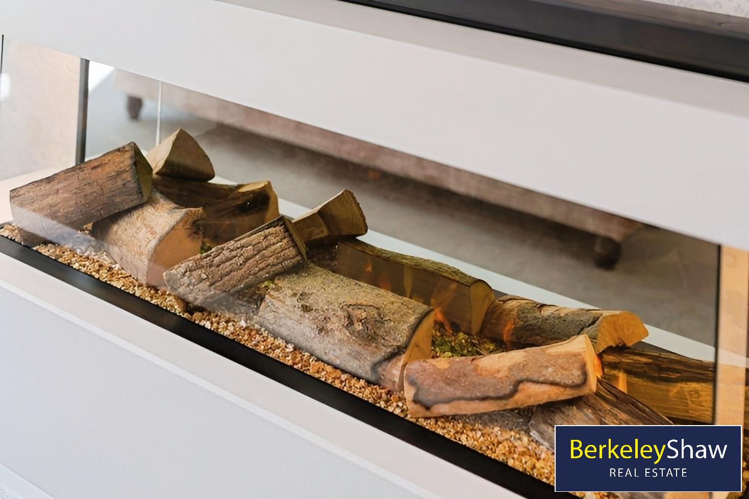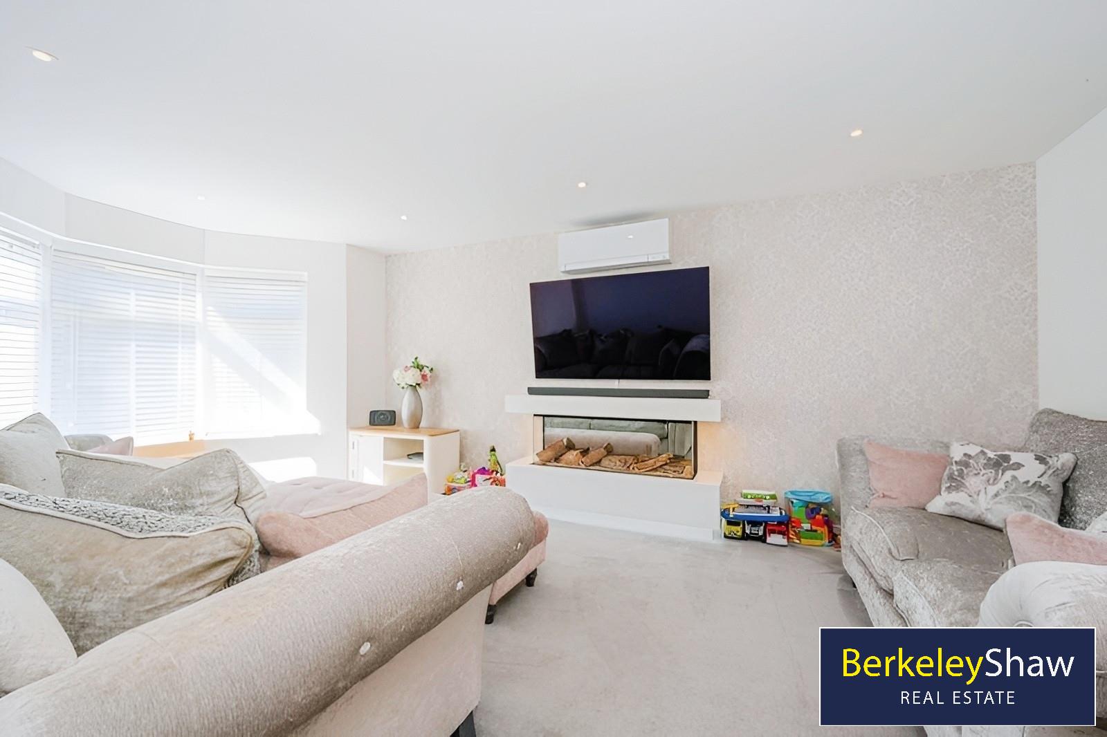 A private driveway offers off-road parking for two vehicles. Inside, a spacious hallway features premium tiled flooring and oak finishes. To the front, the main lounge is bay-fronted with an LED-lit quartz feature fireplace. To the right, a second reception with en-suite is ideal for use as a guest room, home gym or study.