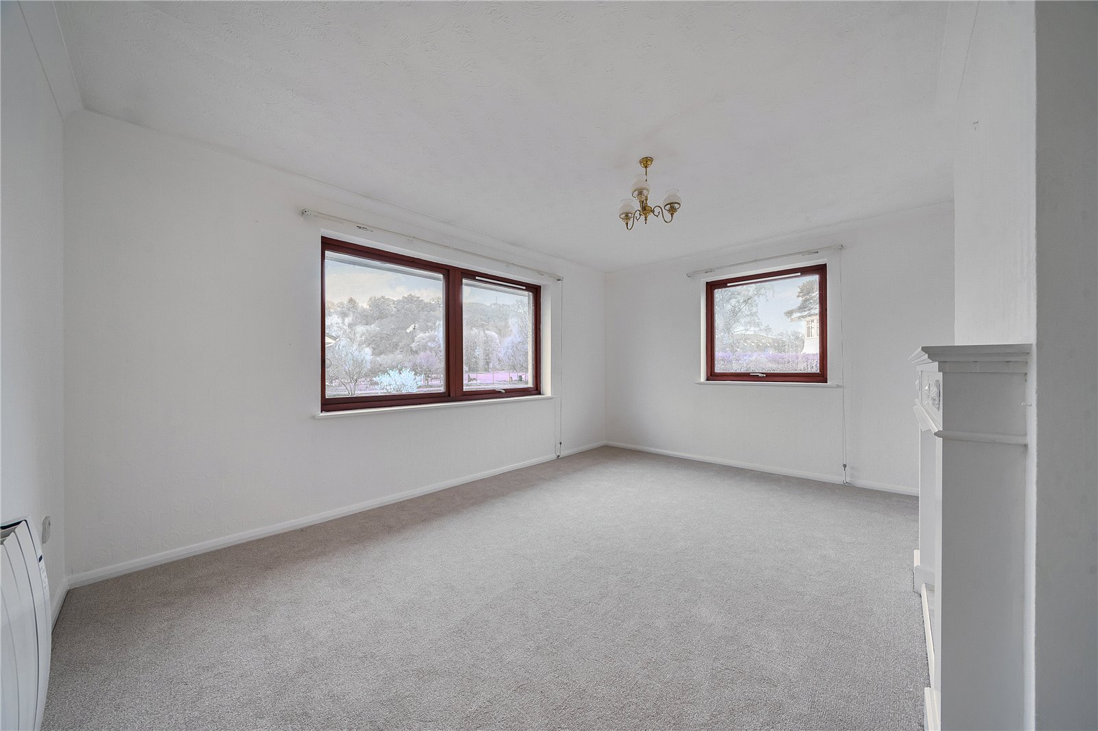 Lounge with feature fireplace with a painted wood surround, electric heater, telephone points and dual aspect windows to South and West.