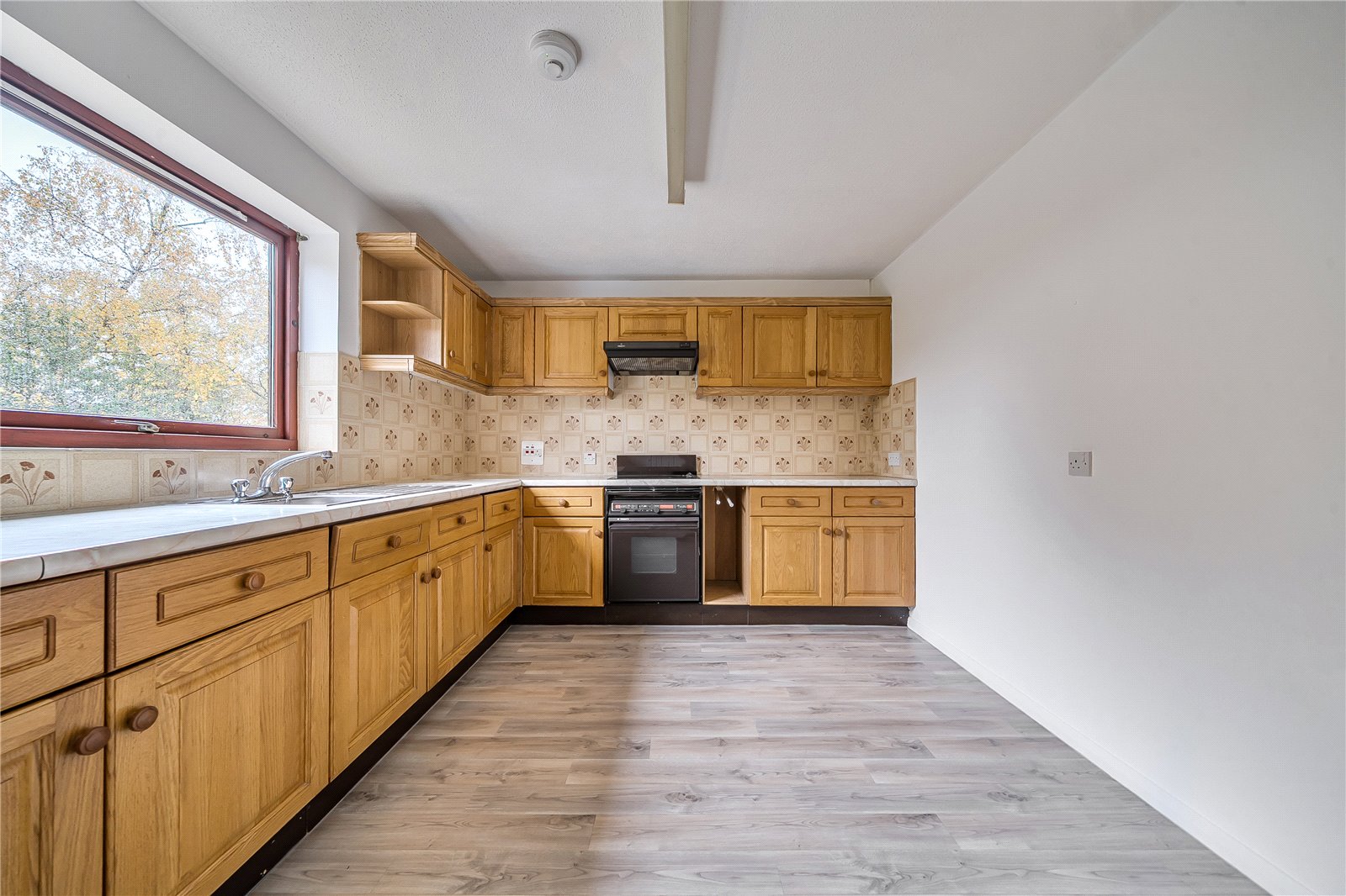 Kitchen with light oak fronted cabinets stainless steel sink, cooker hood, work tops with tiled surrounds, integrated induction hob and cooker hood. In addition there is space for fridge.