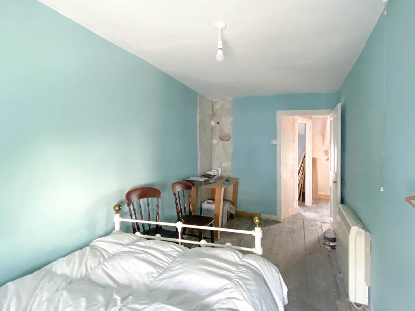 On the first floor is a landing which leads to the shower room, with modern low flush WC installed, and plumbing in place for a shower cubicle and wash hand basin, as well as two large bedrooms, measuring 4.63 x 2.06m and 4.62 x 1.98m. The guest bedroom has a hatch to the roof void, with timber ladder, leading to a boarded loft-space, which has enough headroom to make a useful home office, if required.