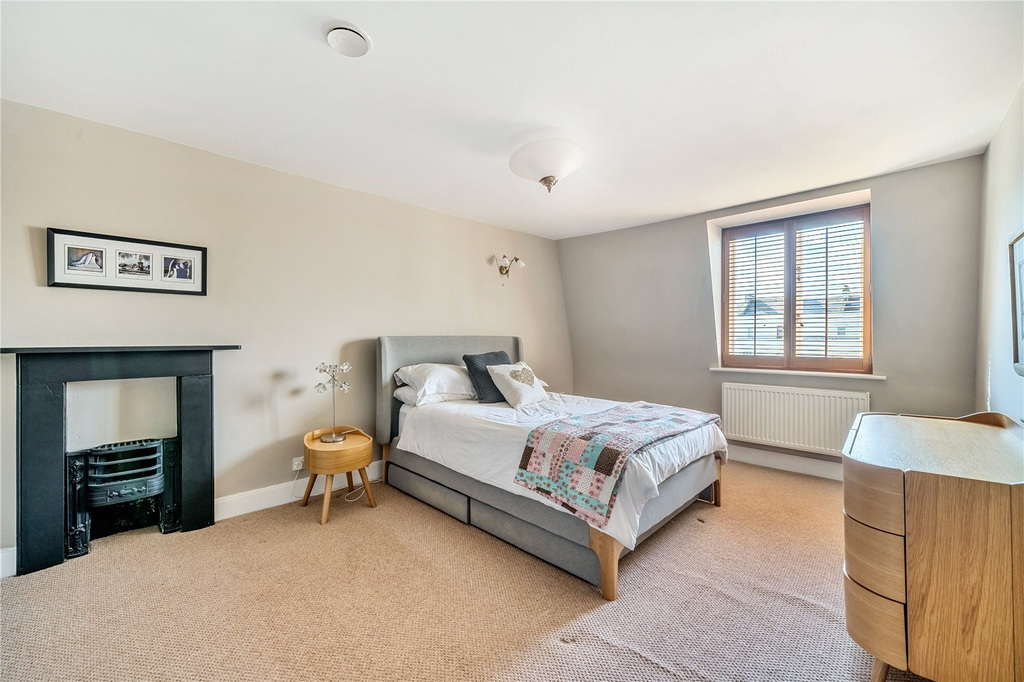The open-plan kitchen and dining area, which spans the full length of the property, is bathed in natural light from both the front and rear. The dining area, featuring a magnificent square bay window with shutters, offers views over the bowling green and the surrounding greenery. The high ceilings and grand Victorian fireplace, with Gazco stove, adds an air of sophistication, while the bespoke, well-appointed contemporary kitchen with a central island and a window overlooking the charming rear courtyard brings a modern touch to this expansive space. Also on this level is a spacious boot room with built-in storage, ideally located at the rear of the property for easy access from the double garage, which has dual openings from the lane and into the beautiful rear courtyard—perfect for family life and the practicality it demands, from coats and wellies to pushchairs. A cloakroom completes this level.
