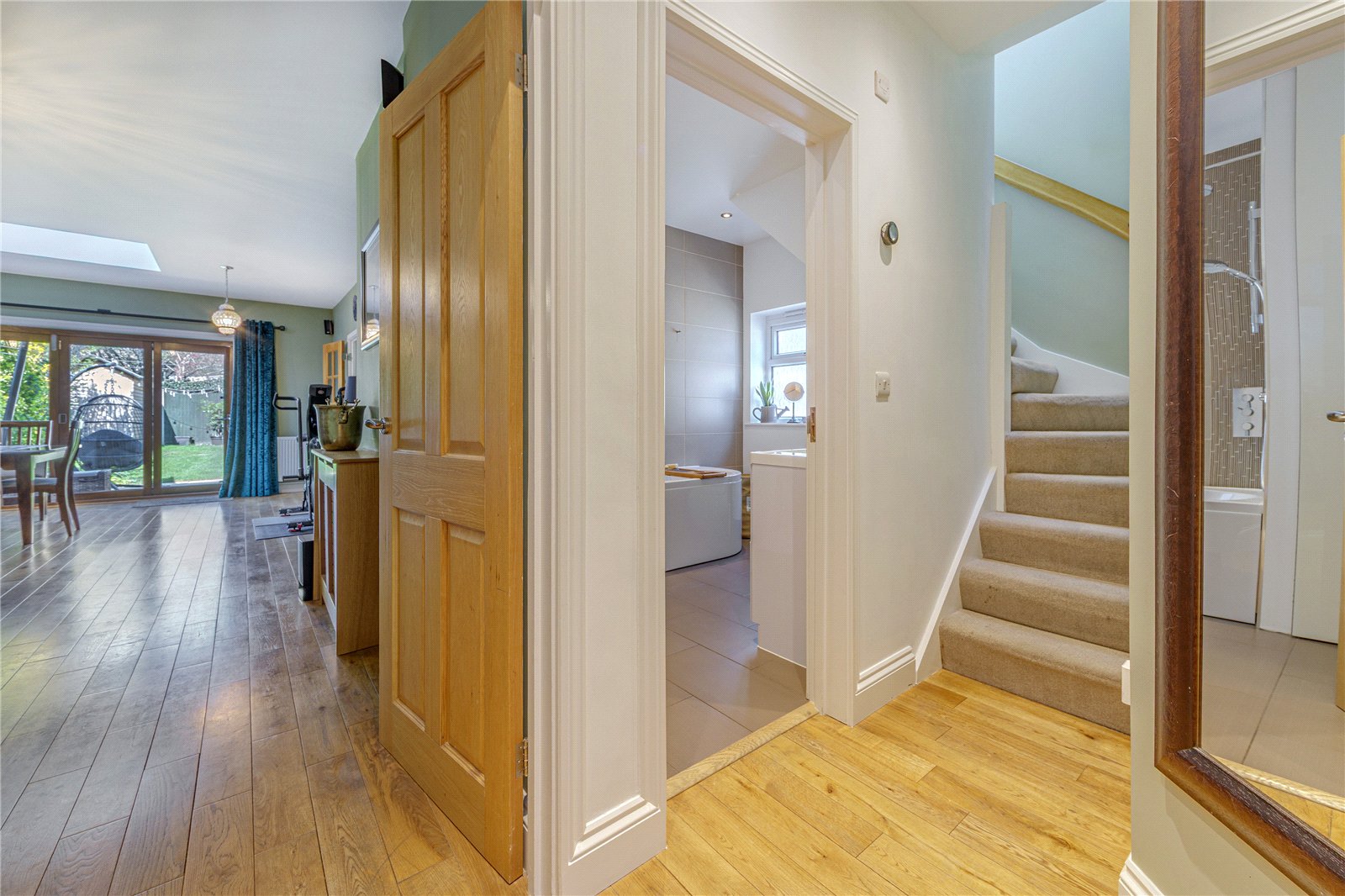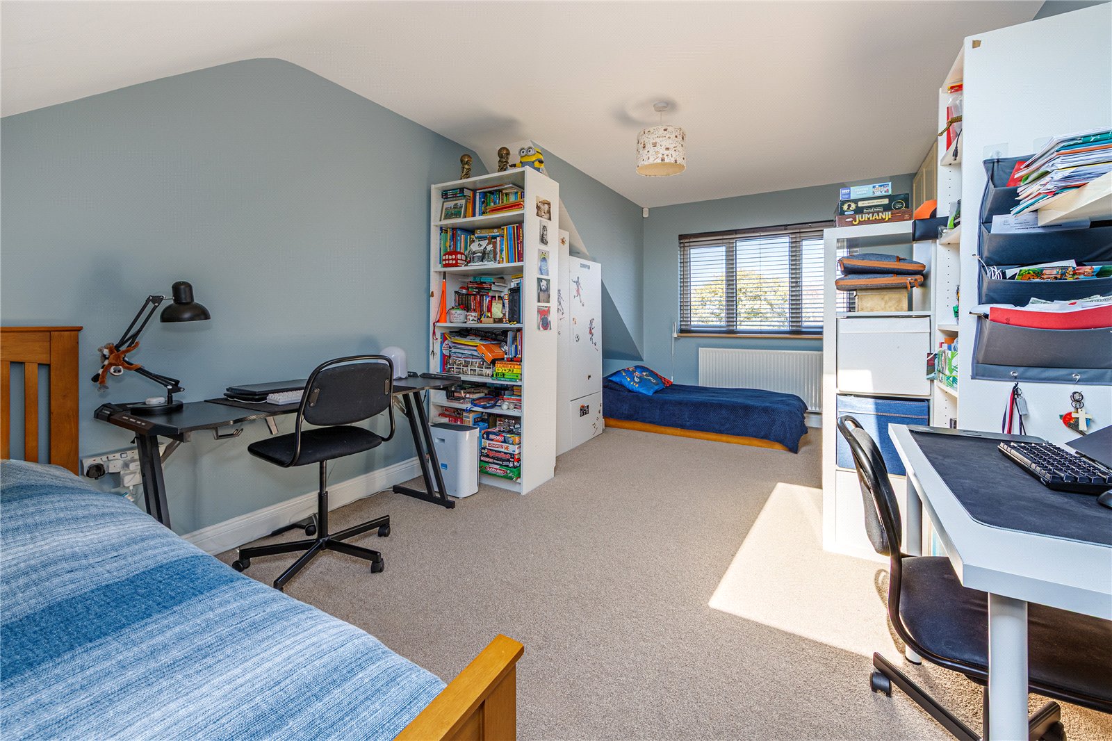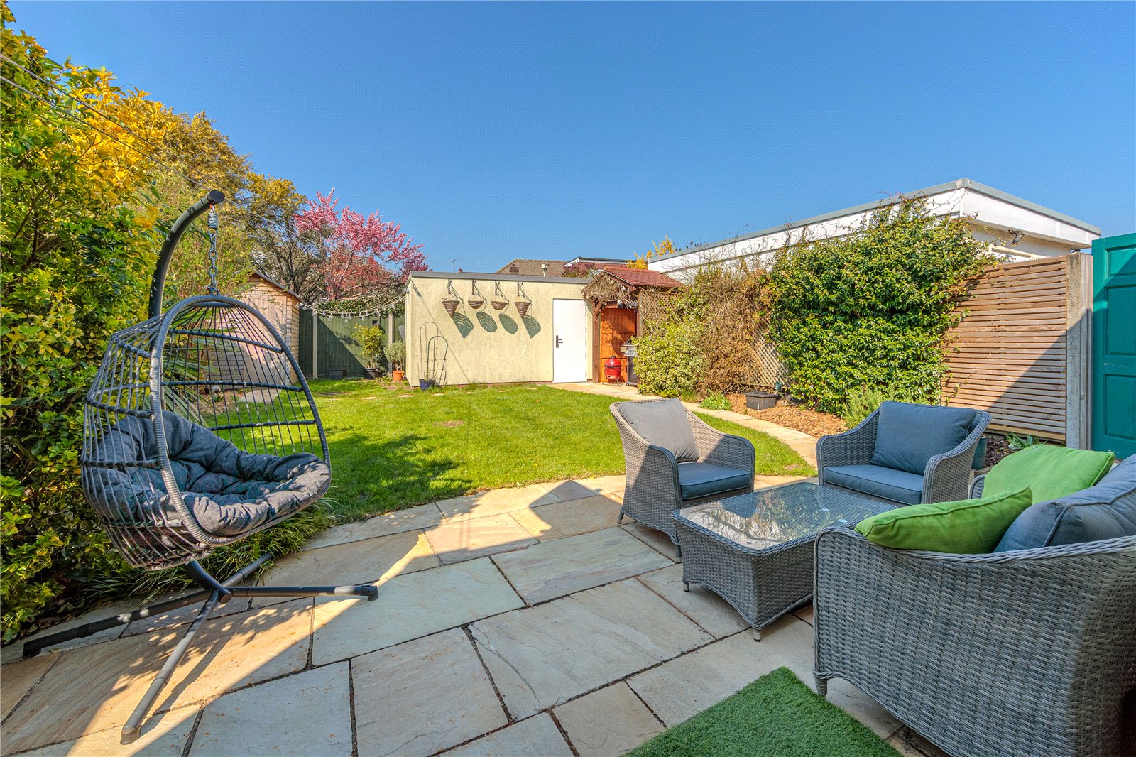The rear garden is a generously sized outdoor space, ideal for both leisure and entertaining. It benefits from convenient side access, making it easy to reach without passing through the main house. At the far end of the garden, a practical outbuilding provides ample storage, perfect for garden tools, bikes, or seasonal items.