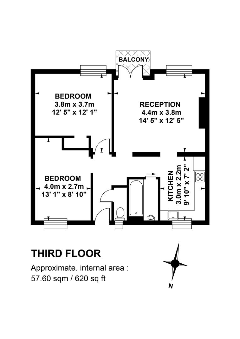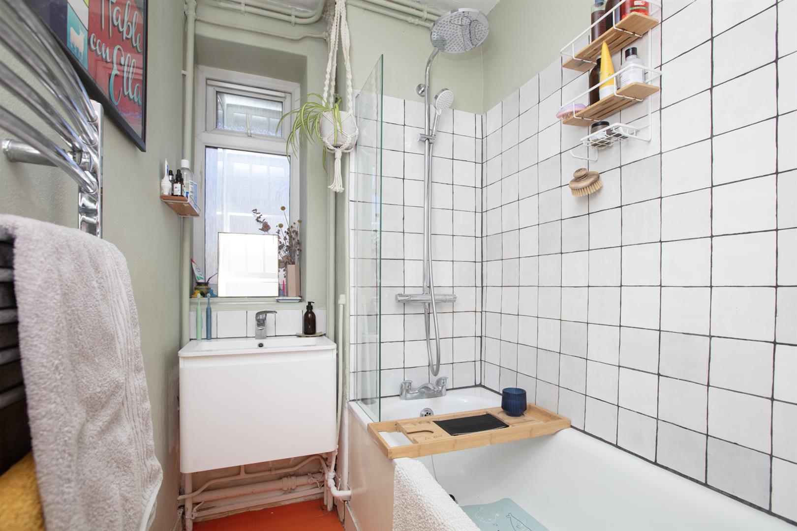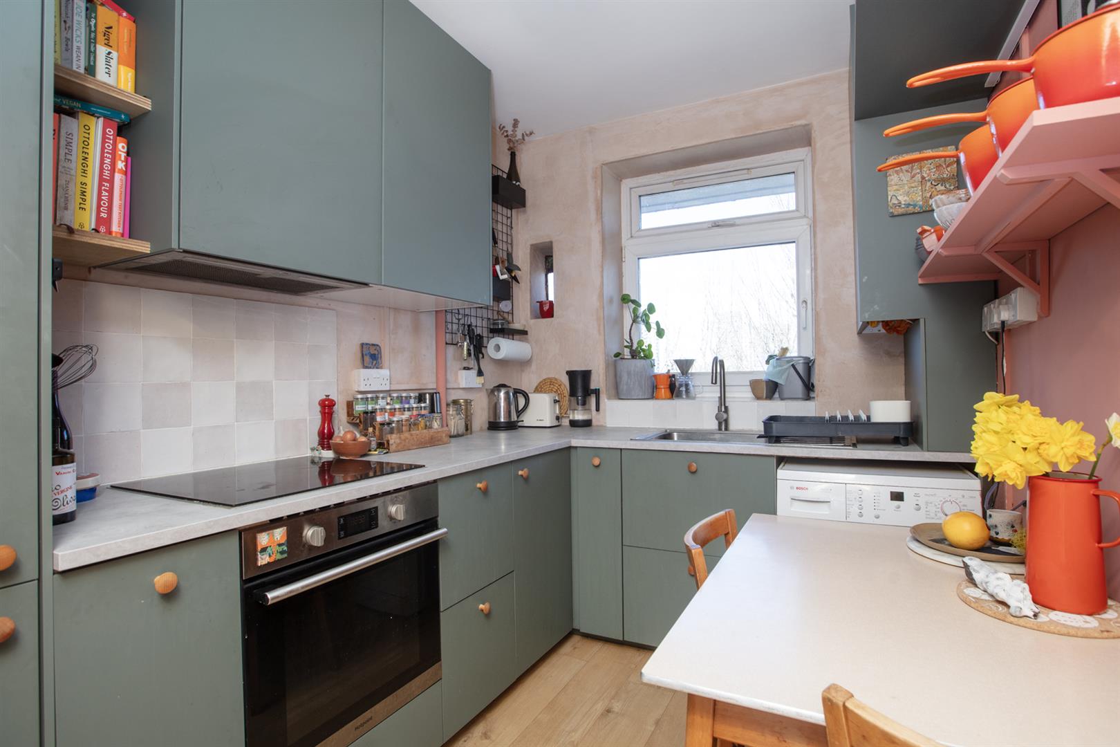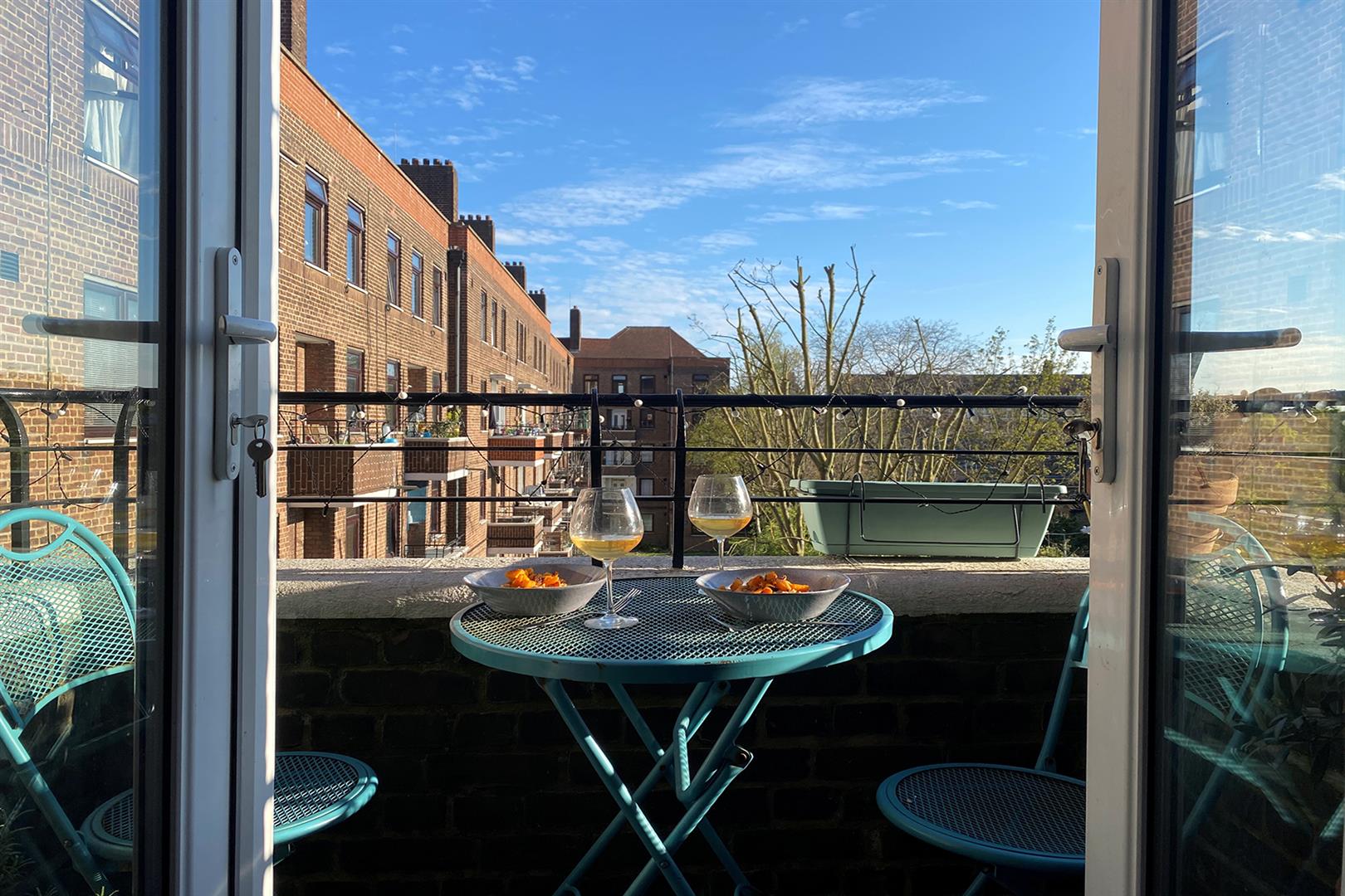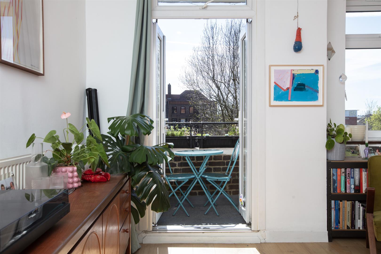 The handsome exterior invites you upward via well maintained communal stairwell. The open walkway offers views towards the Shard. Inside you find an L shaped hallway with some delightful plaster finish on the walls. There's coat hanging space and a neat wc with moody wall tones and a period cistern on your right. Dead ahead you meet the bright and airy reception which opens onto the balcony. The leafy vista below supplies the perfect spot for dining and unwinding. A nicely presented kitchen adjoins the living area to the rear and hosts contemporary cabinetry, four ring induction hob, oven and an integrated fridge/freezer. There's plenty of space for a neat dining table. Bedroom one is a nicely sized space with recessed storage, feature wall and plenty of room for slumber and study. Bedroom two is a larger double which will comfortably fit a king size bed. Recessed storage and leafy views add to the charm. The bathroom is a neat affair with modern wash hand basin and tiling over the bath.
