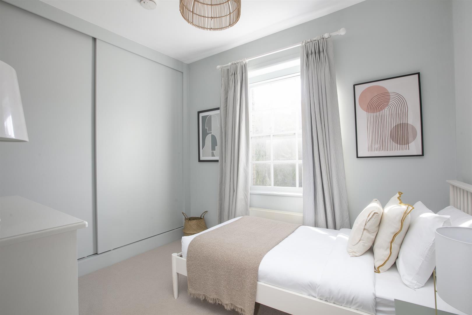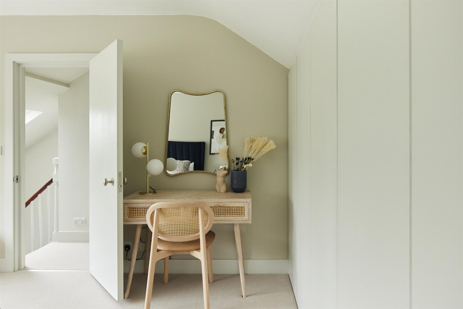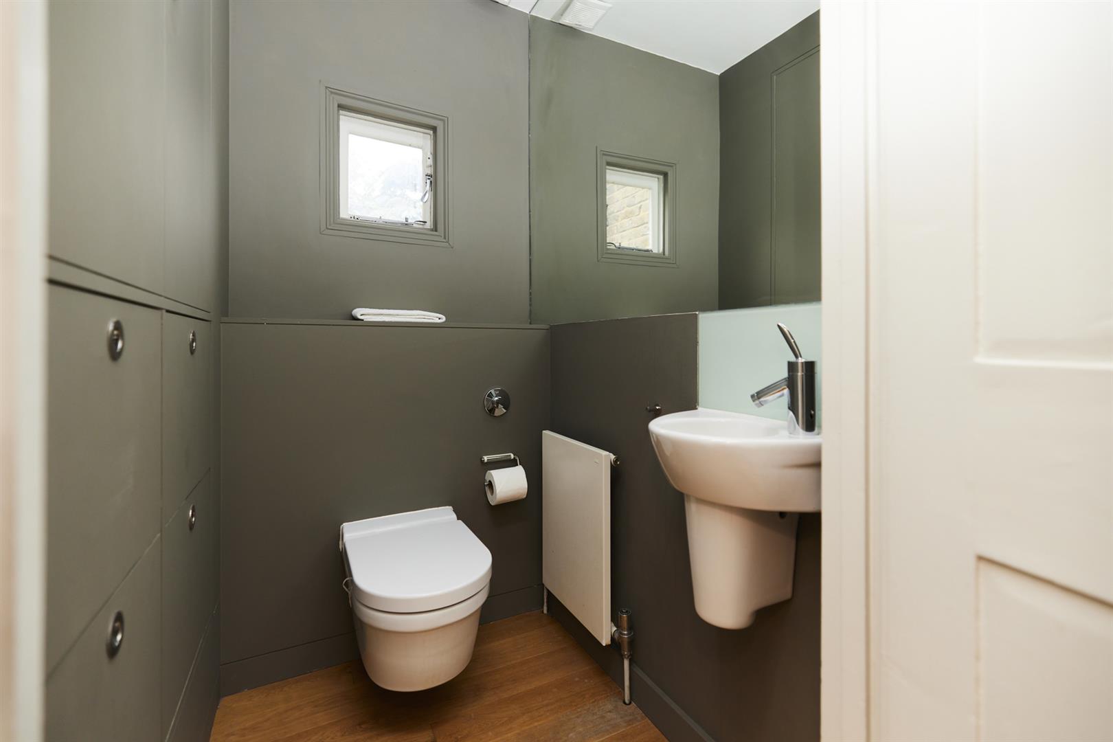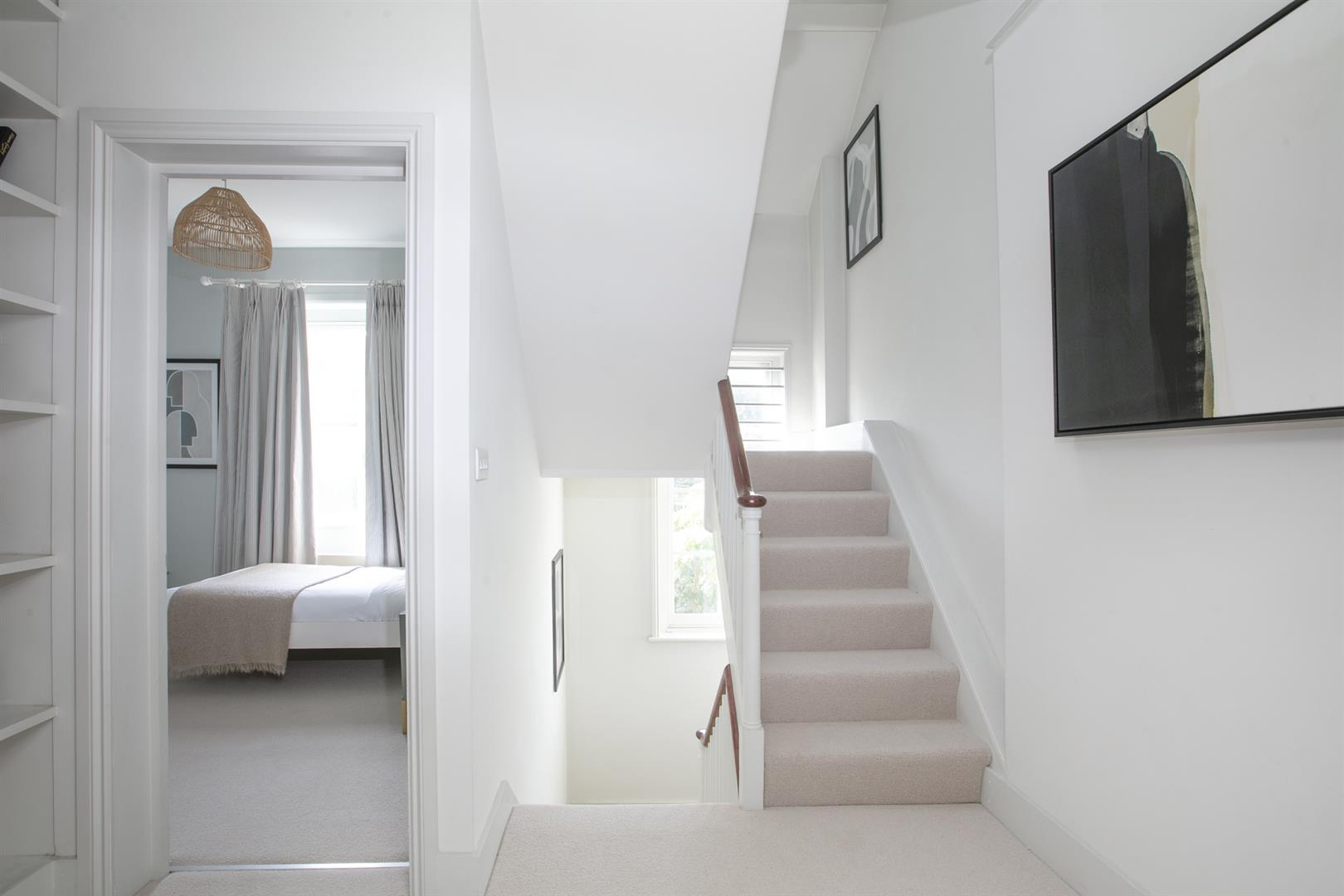 Heading upward you find a bright, well appointed landing with integrated shelving. The master bedroom fronts the street through two large original sash windows. There's an eye-catching feature fireplace and an adjoining en suite shower room. Bedroom two faces rear with another illuminating sash window and pretty blue walls. A final climb to the second floor supplies another large double bedroom. This enjoys a fantastic full-width double glazed window and a wall of bespoke wardrobes. Last but not least comes a handsome shower room with black matt fittings, walk-in shower, semi-circular wash hand basin and loo.