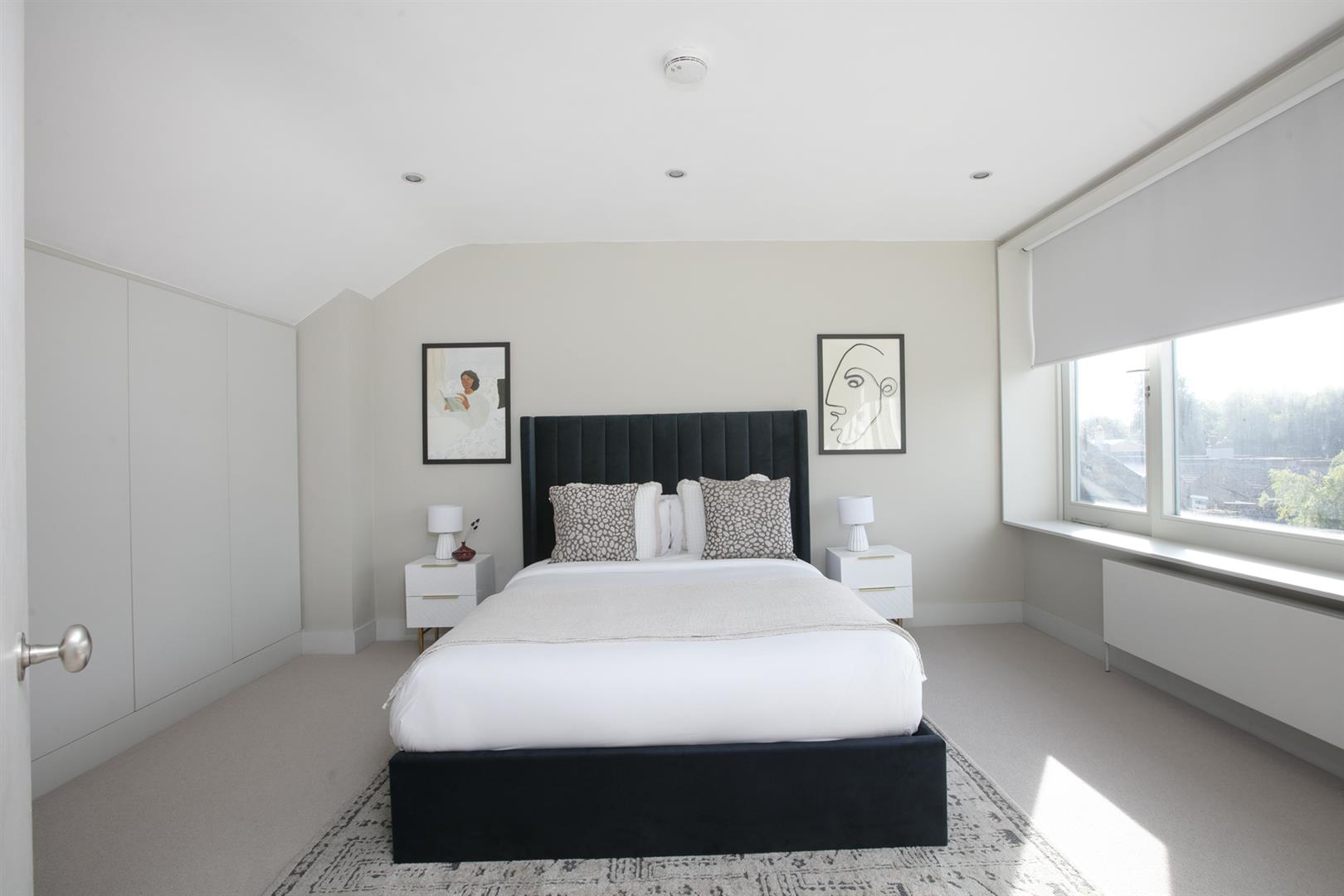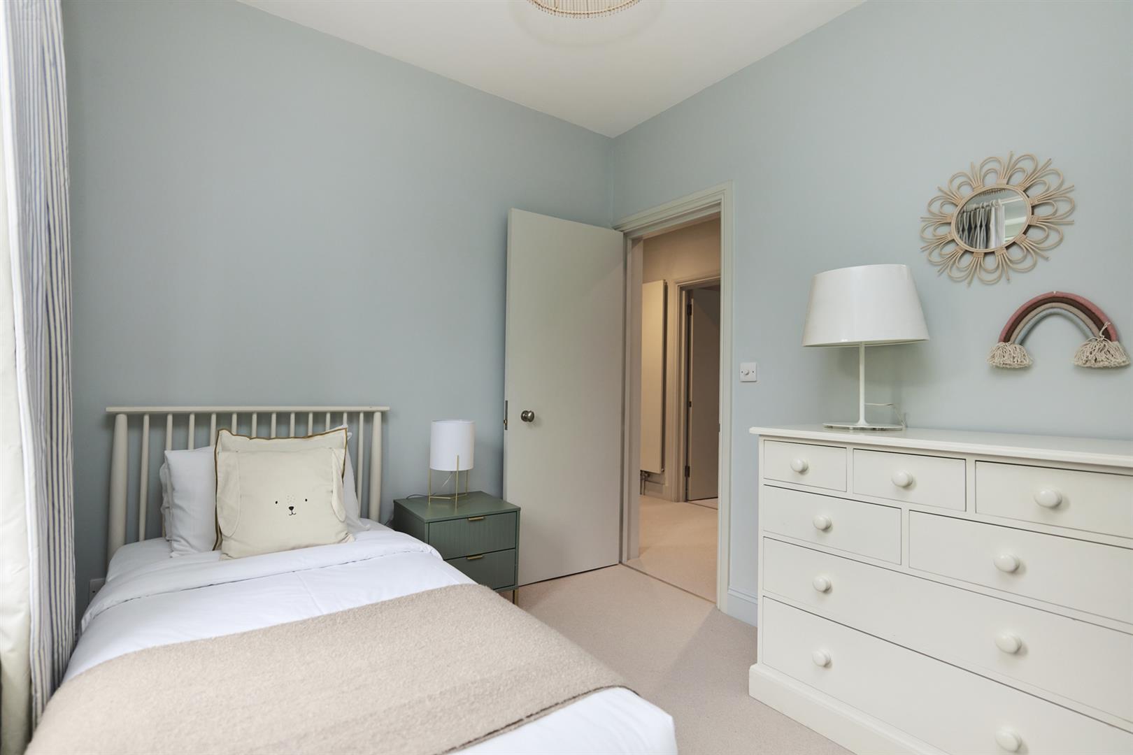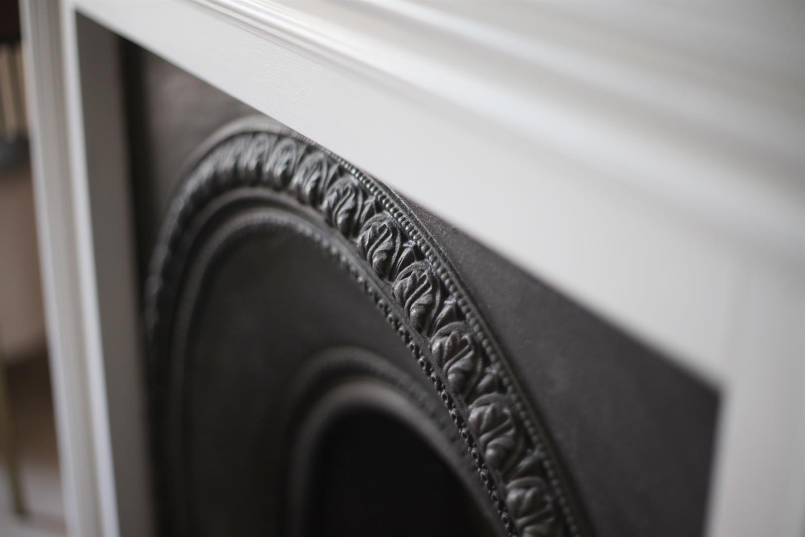 Heading upward you find a bright, well appointed landing with integrated shelving. The master bedroom fronts the street through two large original sash windows. There's an eye-catching feature fireplace and an adjoining en suite shower room. Bedroom two faces rear with another illuminating sash window and pretty blue walls. A final climb to the second floor supplies another large double bedroom. This enjoys a fantastic full-width double glazed window and a wall of bespoke wardrobes. Last but not least comes a handsome shower room with black matt fittings, walk-in shower, semi-circular wash hand basin and loo.
