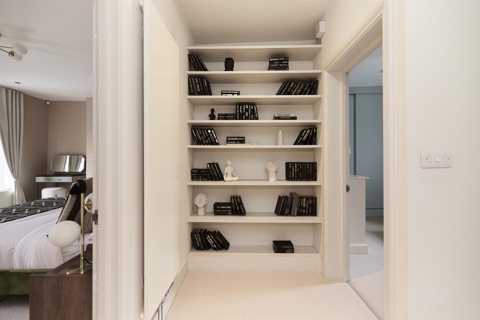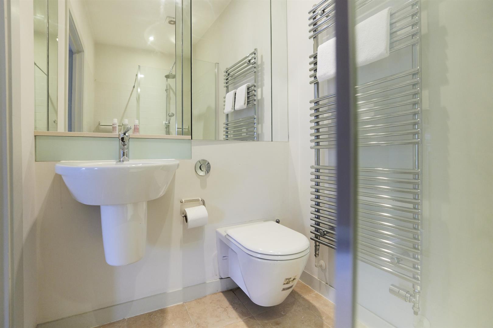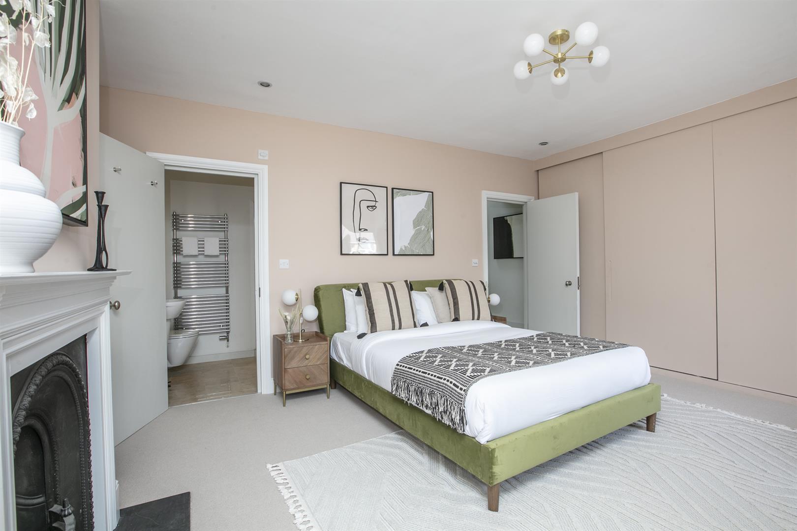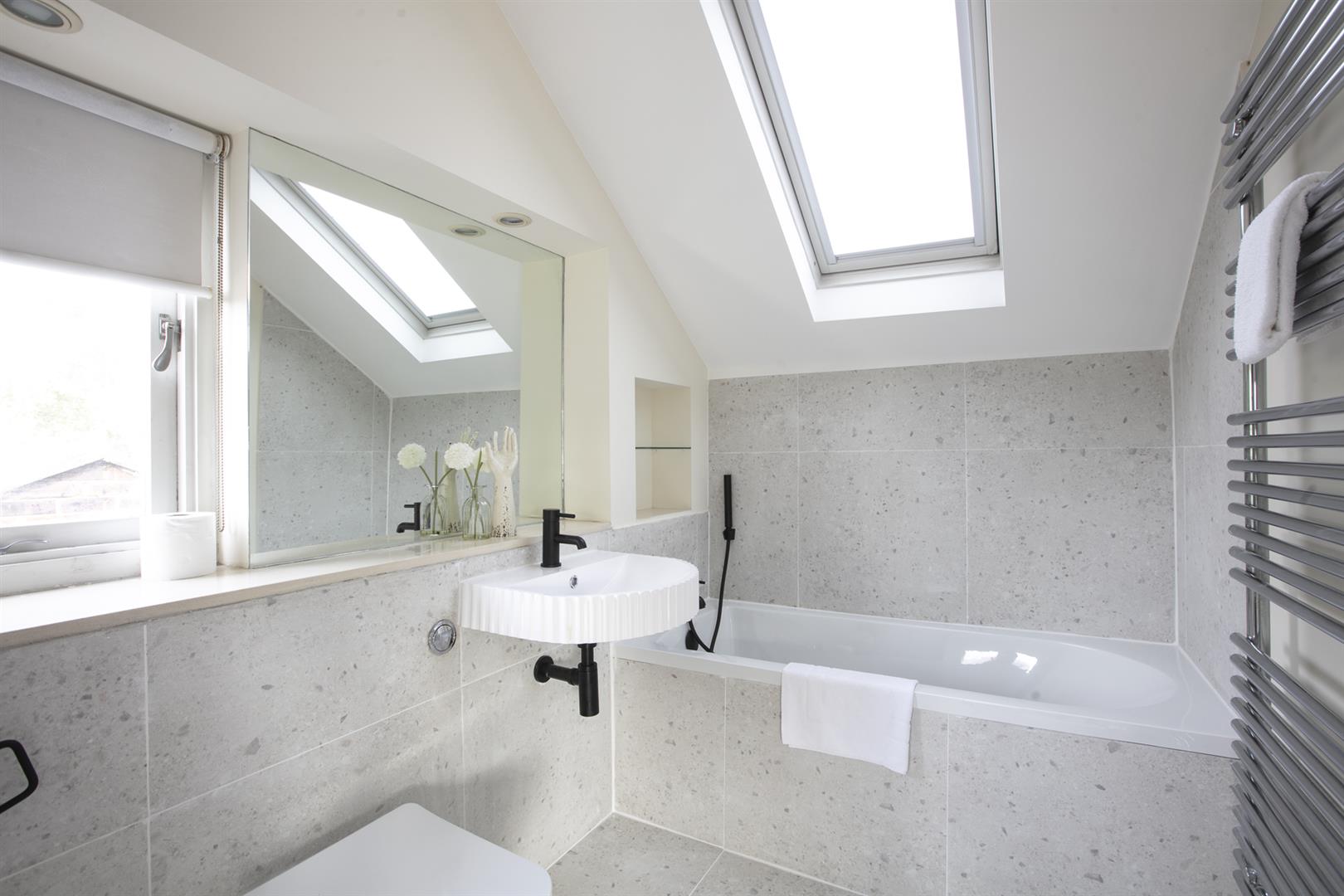 Heading upward you find a bright, well appointed landing with integrated shelving. The master bedroom fronts the street through two large original sash windows. There's an eye-catching feature fireplace and an adjoining en suite shower room. Bedroom two faces rear with another illuminating sash window and pretty blue walls. A final climb to the second floor supplies another large double bedroom. This enjoys a fantastic full-width double glazed window and a wall of bespoke wardrobes. Last but not least comes a handsome shower room with black matt fittings, walk-in shower, semi-circular wash hand basin and loo.