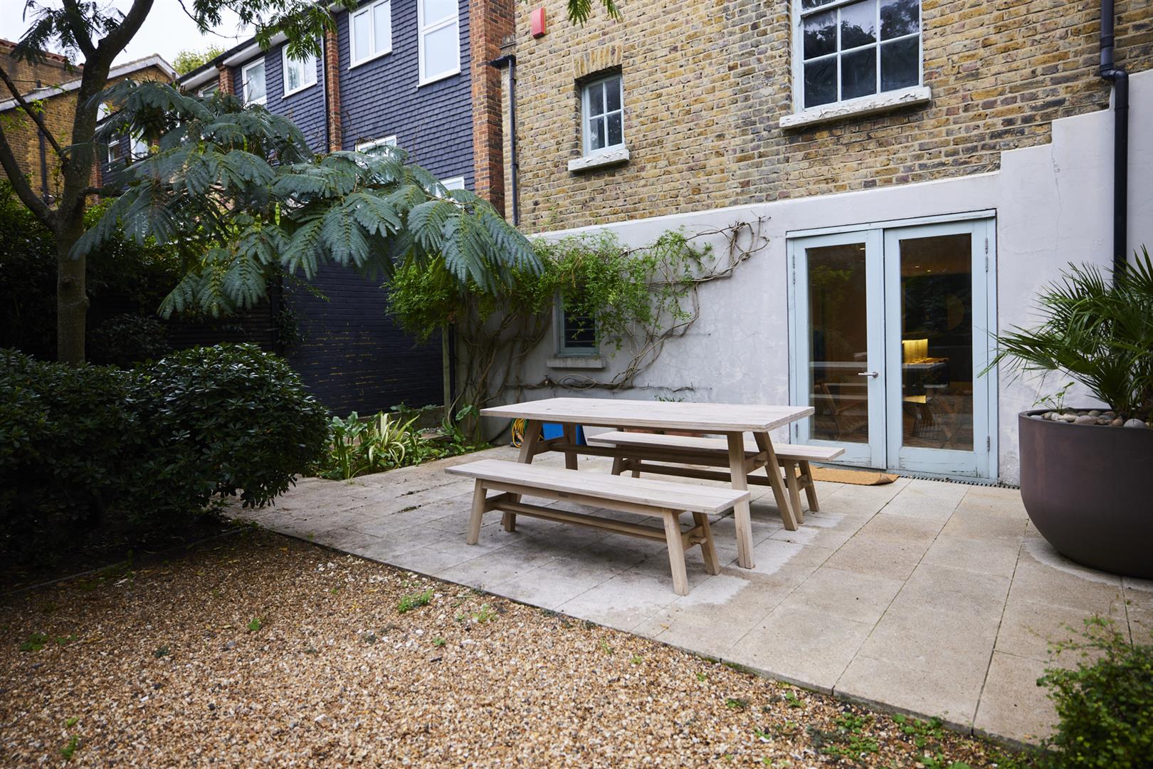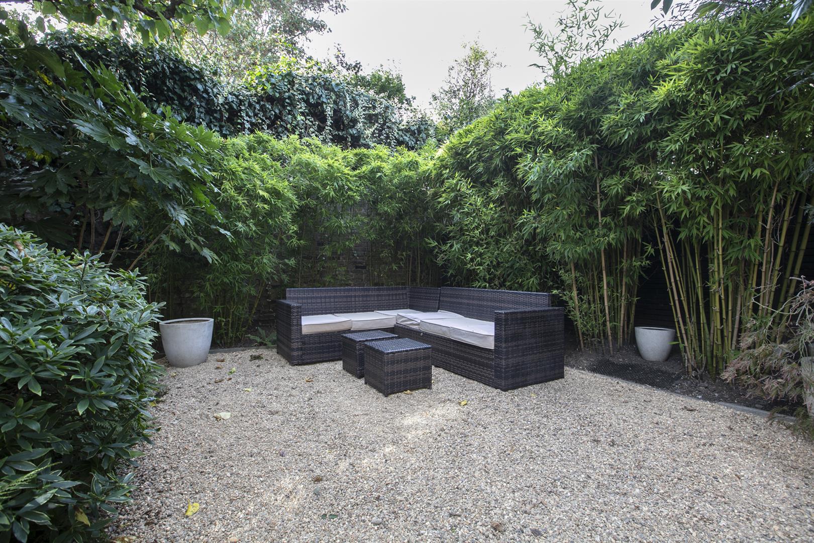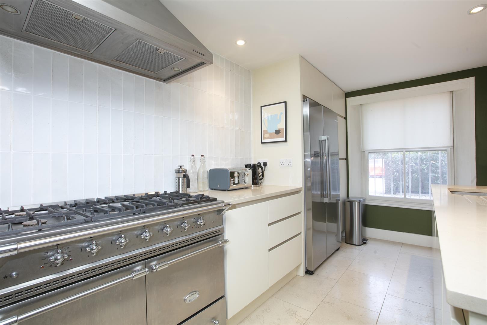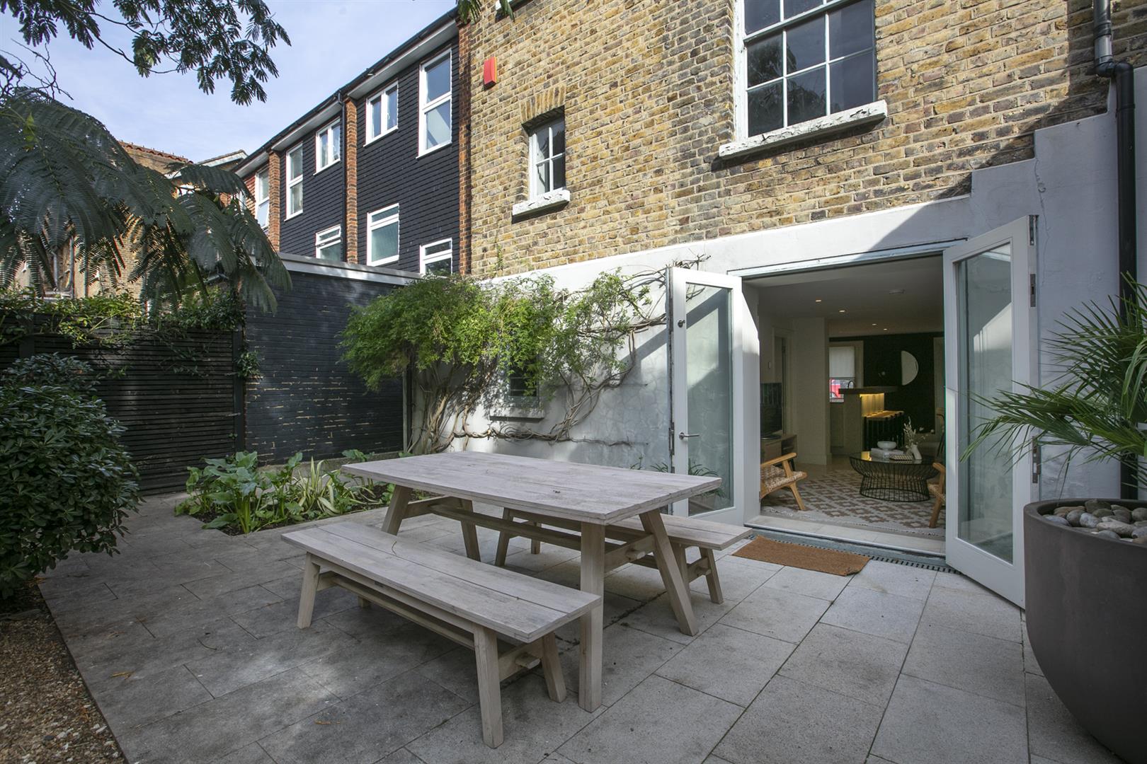 The lower ground floor enjoys two separate deep storage points including a fab walk-in larder. One could instate a wc easily and there's a super handy utility room. The kitchen/living area will impress with lovely tiled flooring and a contemporary breakfast bar that will comfortably host four people. Appliances include an American style fridge-freezer and a fab five ring gas range. A further seating space to the rear precedes double doors with yet more lovely shutters. These open to the wonderful rear garden which enjoys abundant mature greenery. A rear patio affords you the perfect spot for entertaining al-fresco and there's a well appointed garden shed for pottering. As the house is semi-detached it has a side alley and gate allowing easy access between front and back gardens.