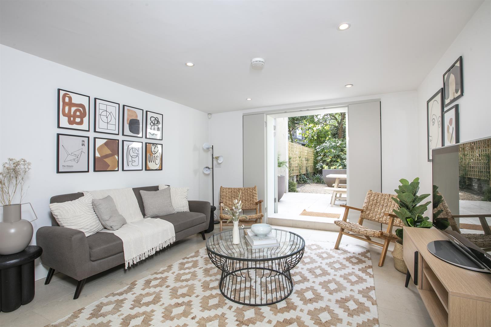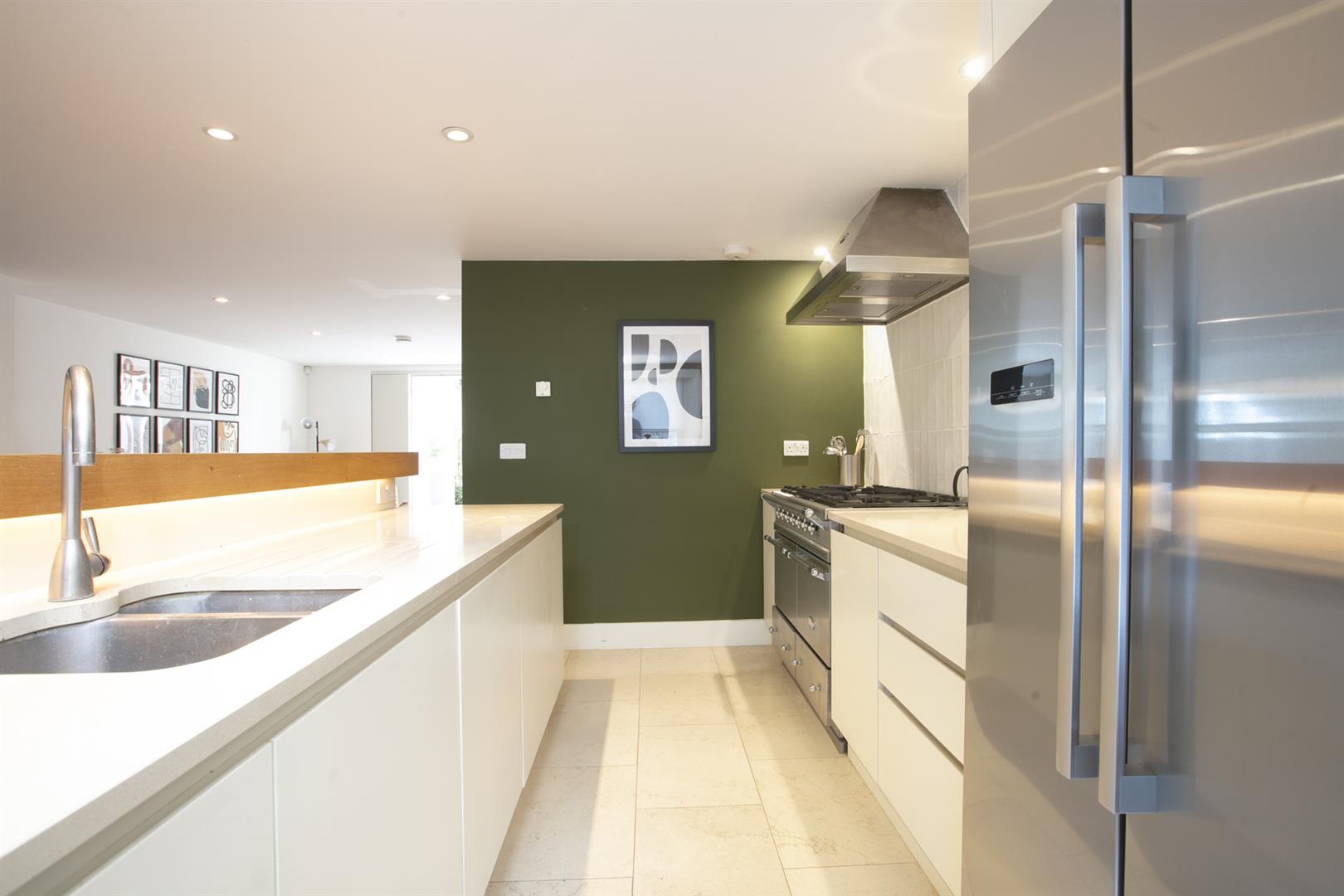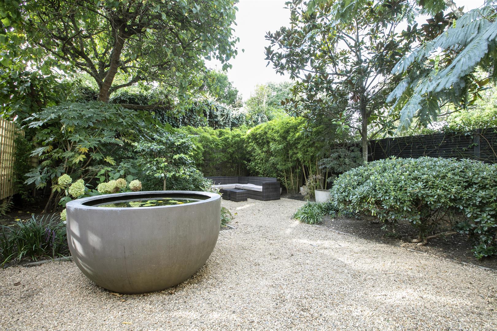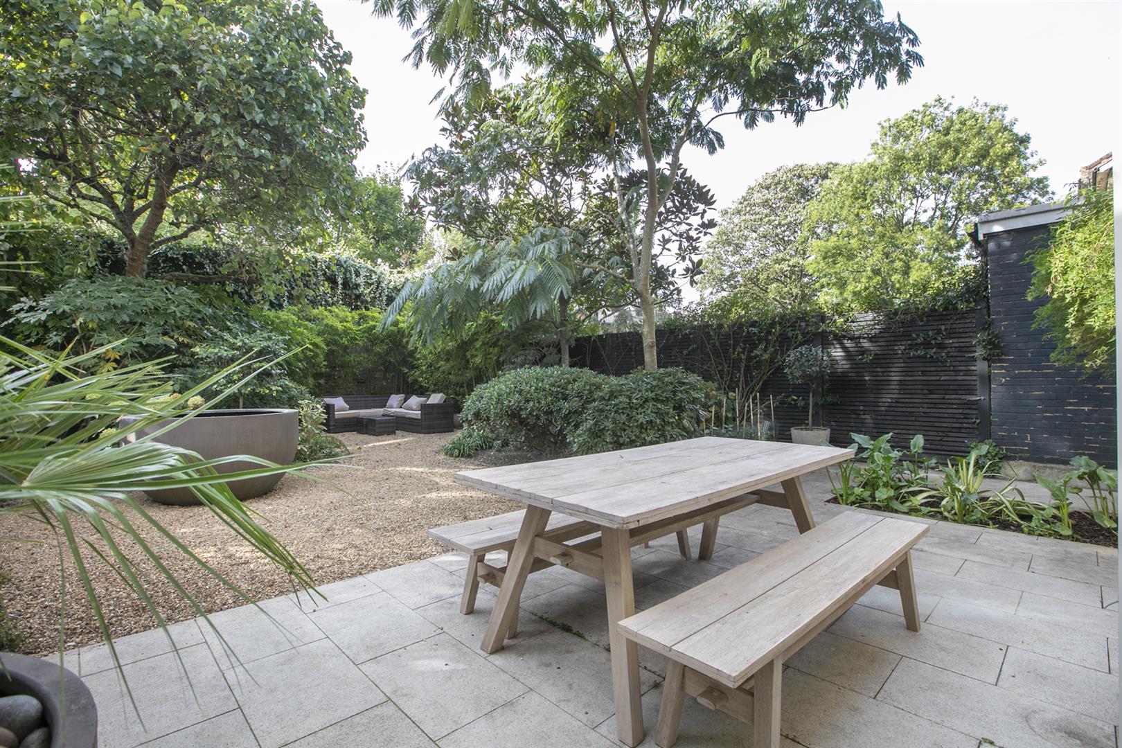 The lower ground floor enjoys two separate deep storage points including a fab walk-in larder. One could instate a wc easily and there's a super handy utility room. The kitchen/living area will impress with lovely tiled flooring and a contemporary breakfast bar that will comfortably host four people. Appliances include an American style fridge-freezer and a fab five ring gas range. A further seating space to the rear precedes double doors with yet more lovely shutters. These open to the wonderful rear garden which enjoys abundant mature greenery. A rear patio affords you the perfect spot for entertaining al-fresco and there's a well appointed garden shed for pottering. As the house is semi-detached it has a side alley and gate allowing easy access between front and back gardens.