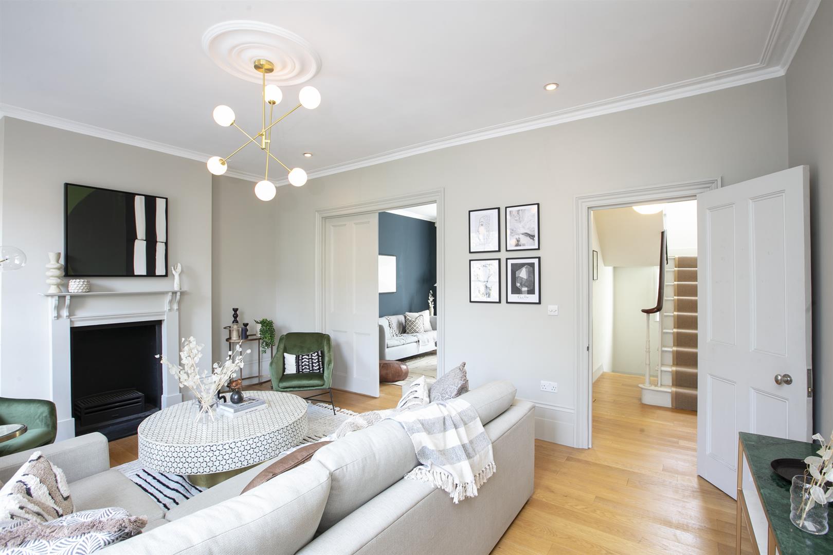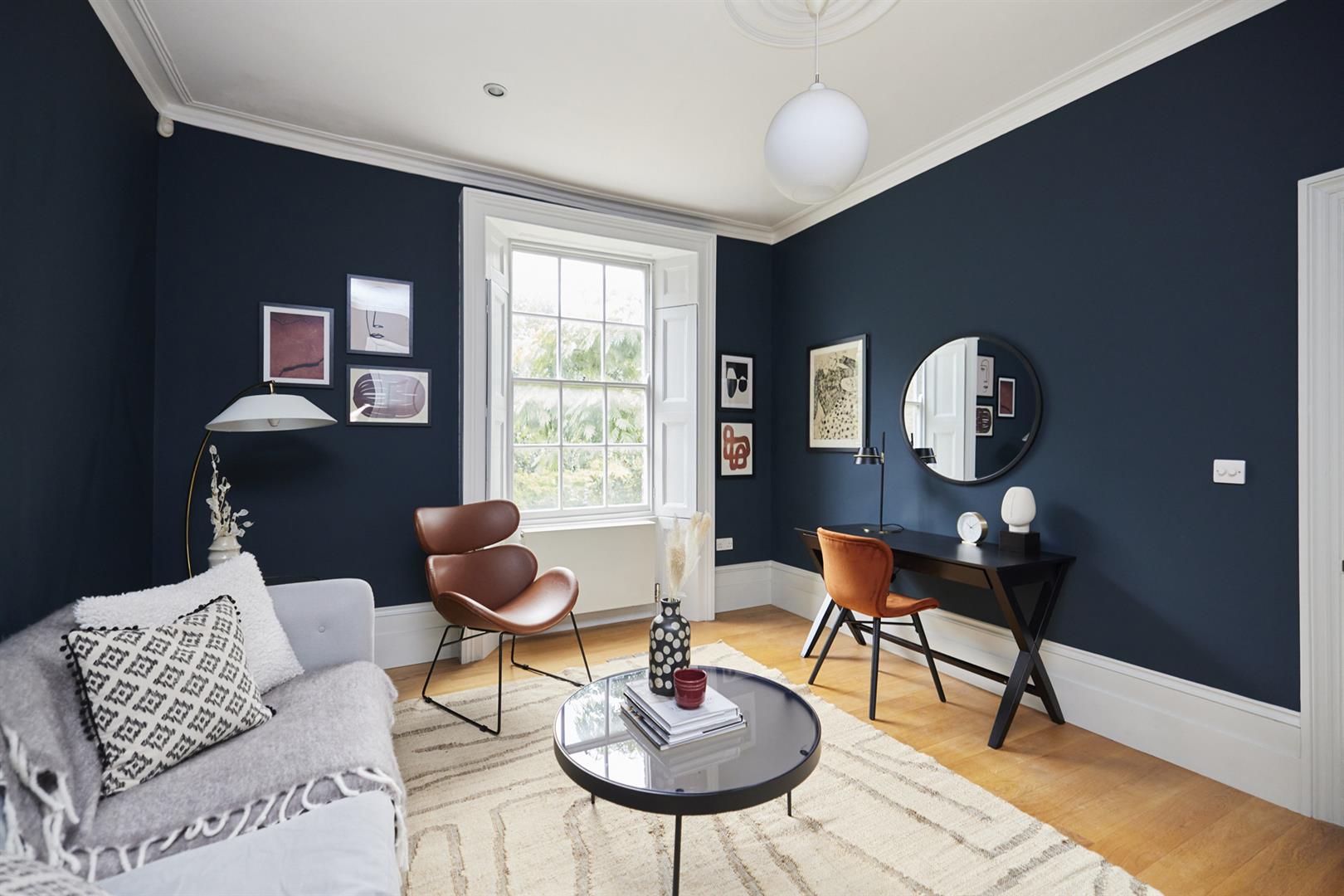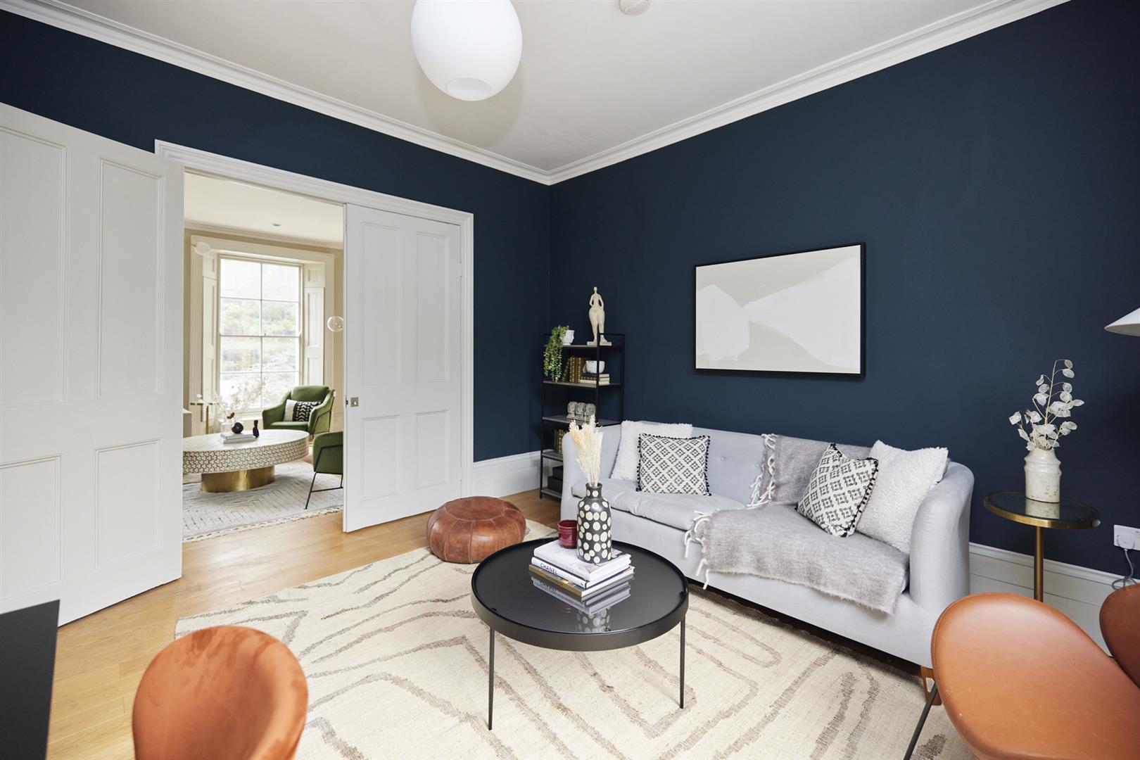 The house sits behind a generous front garden with space for two cars. A grand set of steps lead up to your original door, painted light sage green. The inner hall has solid wooden flooring and pleasant neutral walls. There's a loo dead ahead with rich dark grey walls and a modern suite. A vast L-shaped double reception comes next with a swanky fireplace, high ceilings and some wonderful original sash windows with shutters. Double doors separate the space. One could easily use the rear section as a bedroom. This space is presented in midnight blue and has more beautiful shutters.