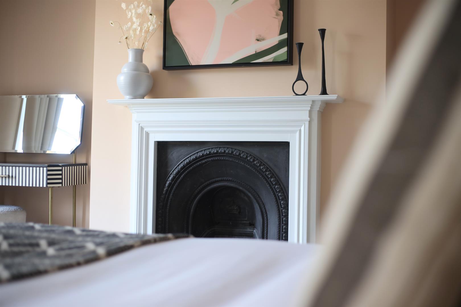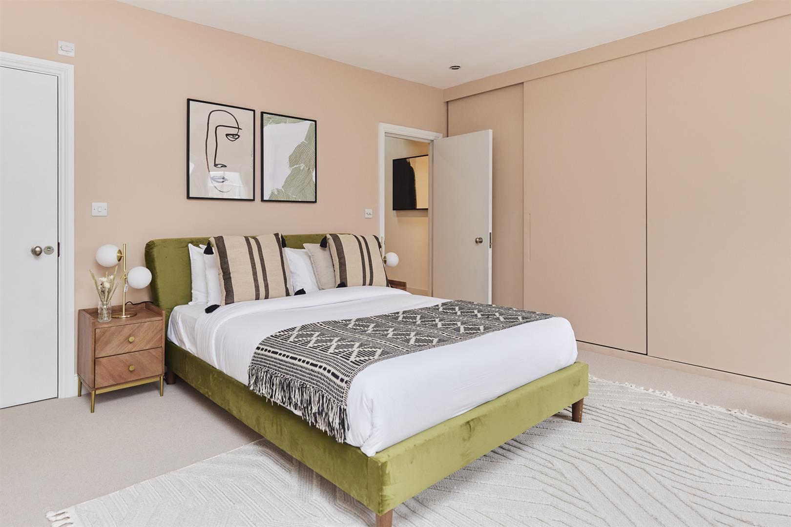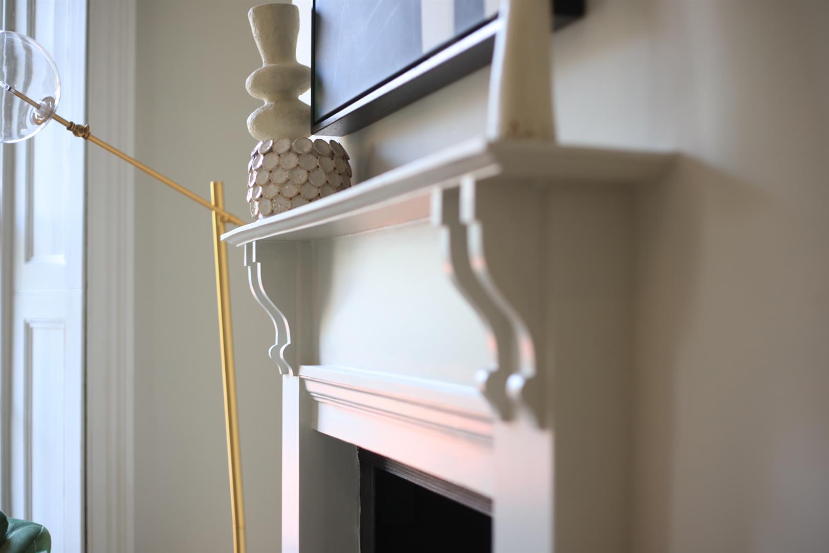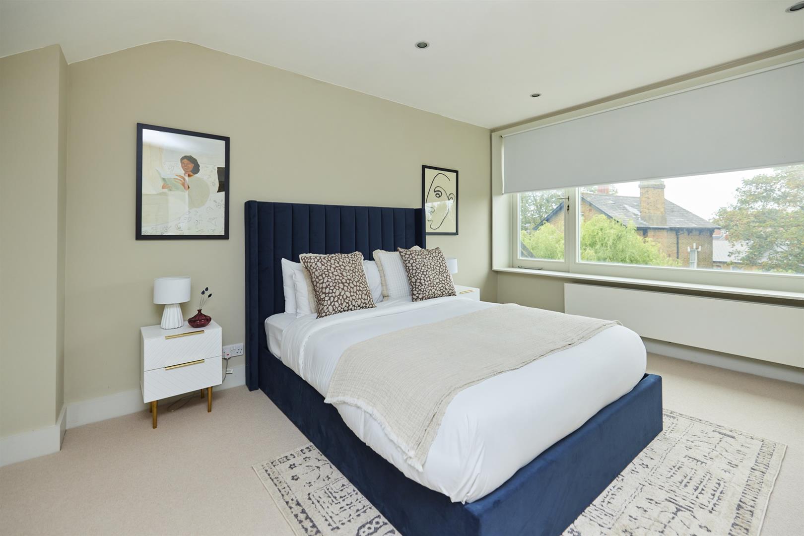 The house sits behind a generous front garden with space for two cars. A grand set of steps lead up to your original door, painted light sage green. The inner hall has solid wooden flooring and pleasant neutral walls. There's a loo dead ahead with rich dark grey walls and a modern suite. A vast L-shaped double reception comes next with a swanky fireplace, high ceilings and some wonderful original sash windows with shutters. Double doors separate the space. One could easily use the rear section as a bedroom. This space is presented in midnight blue and has more beautiful shutters.