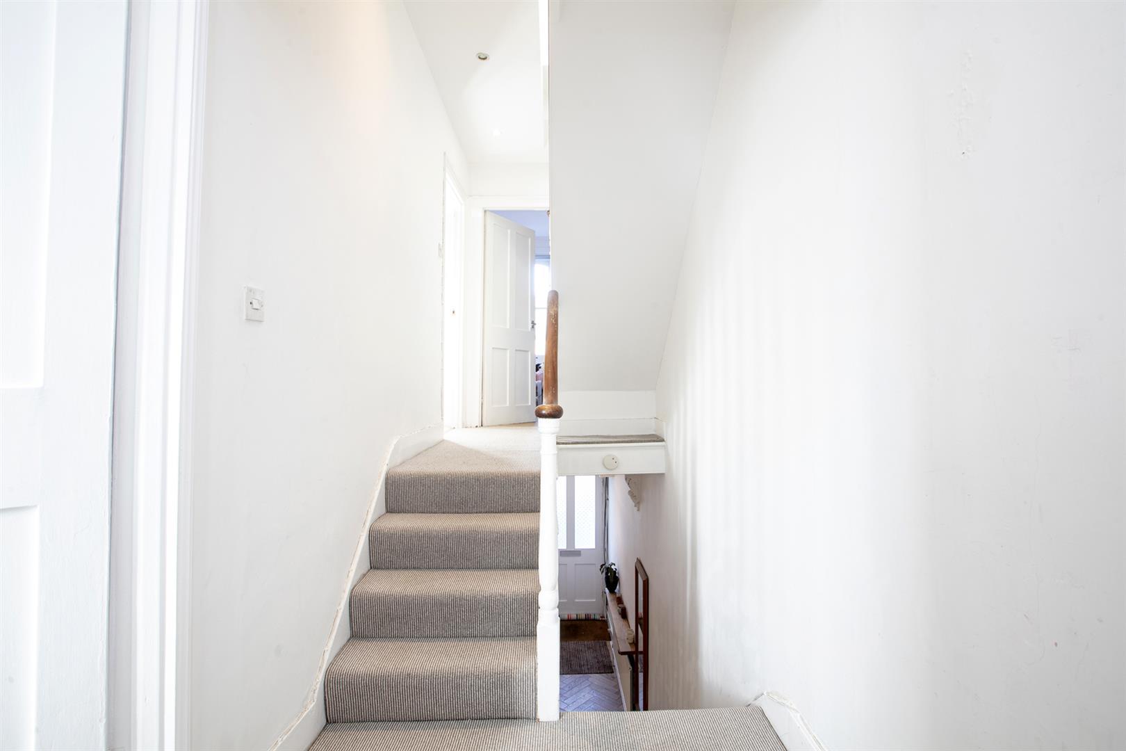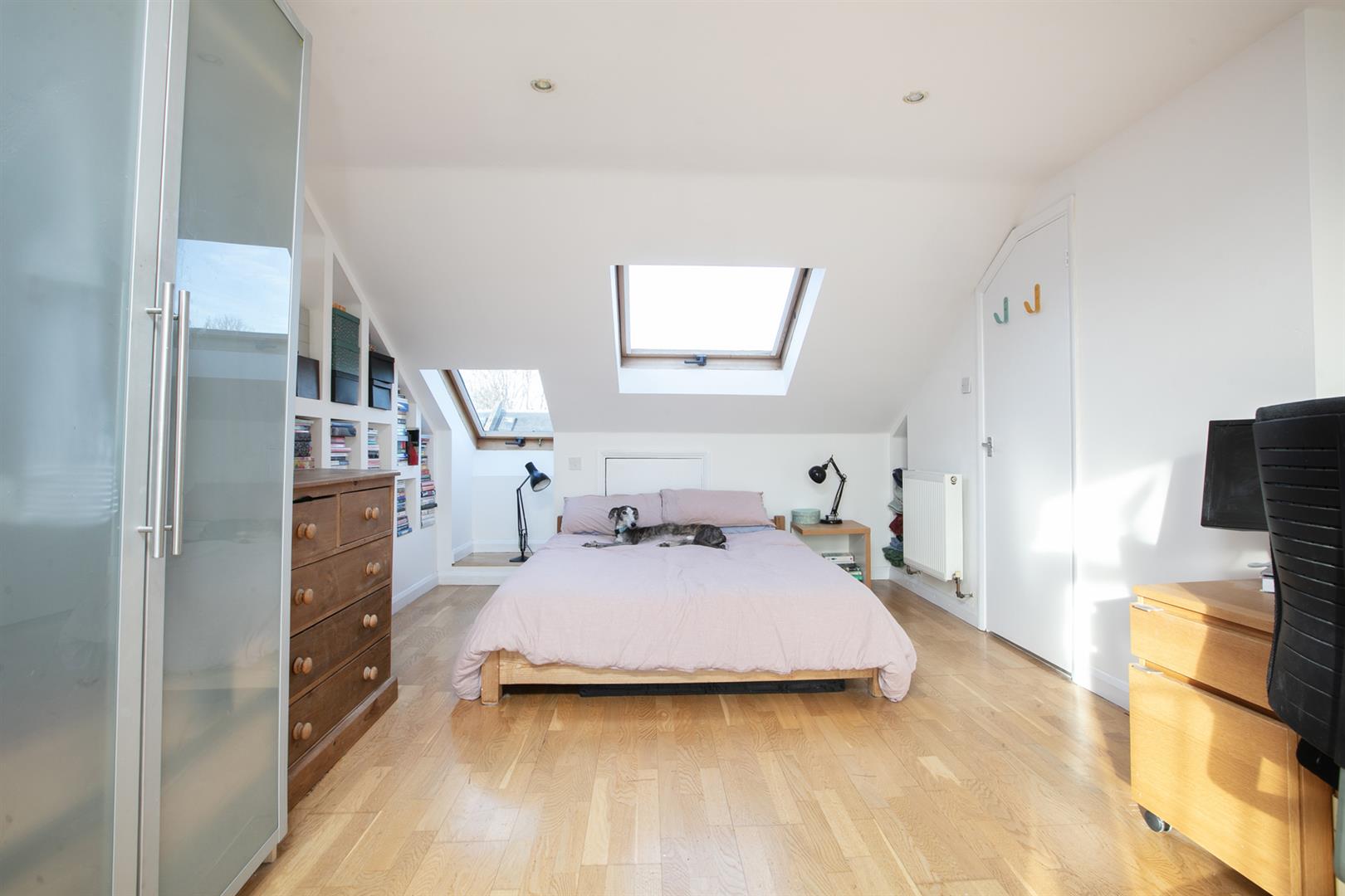 Back inside, head upward to the wide and generous rear return. Here you meet a proper double bedroom with rear-facing garden views. Next to this is a family bathroom with pretty tiling, white suite, heated towel rail and side aspect sash window. There's ample room on the landing for storage and also tonnes of hanging space for your signature art pieces. The first floor hosts a full-width double bedroom with twin sash windows, period feature fireplace and simple coving. Bedroom four, a fine bright double, has a feature fireplace and fitted shelving. Upward bound once again you find your masterfully converted loft which has a huge and wonderfully sunny double bedroom with recessed storage and a Juliette balcony with far-reaching rooftop views of your new neighbourhood. An adjoining en suite shower room (with Mira thermostatic dual rainfall and jet shower outlets) and large eaves storage cupboard completes the tour nicely. When converting the loft, the current owners obtained planning permission to increase the height of the house by 5 brick courses. The result is a master suite with significantly higher ceiling height than the average loft conversion.