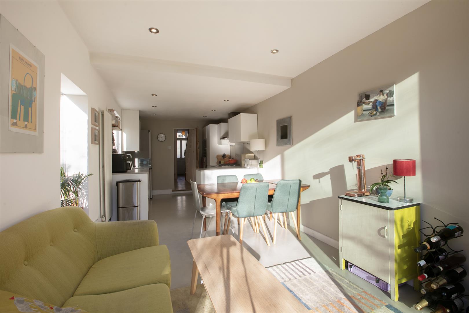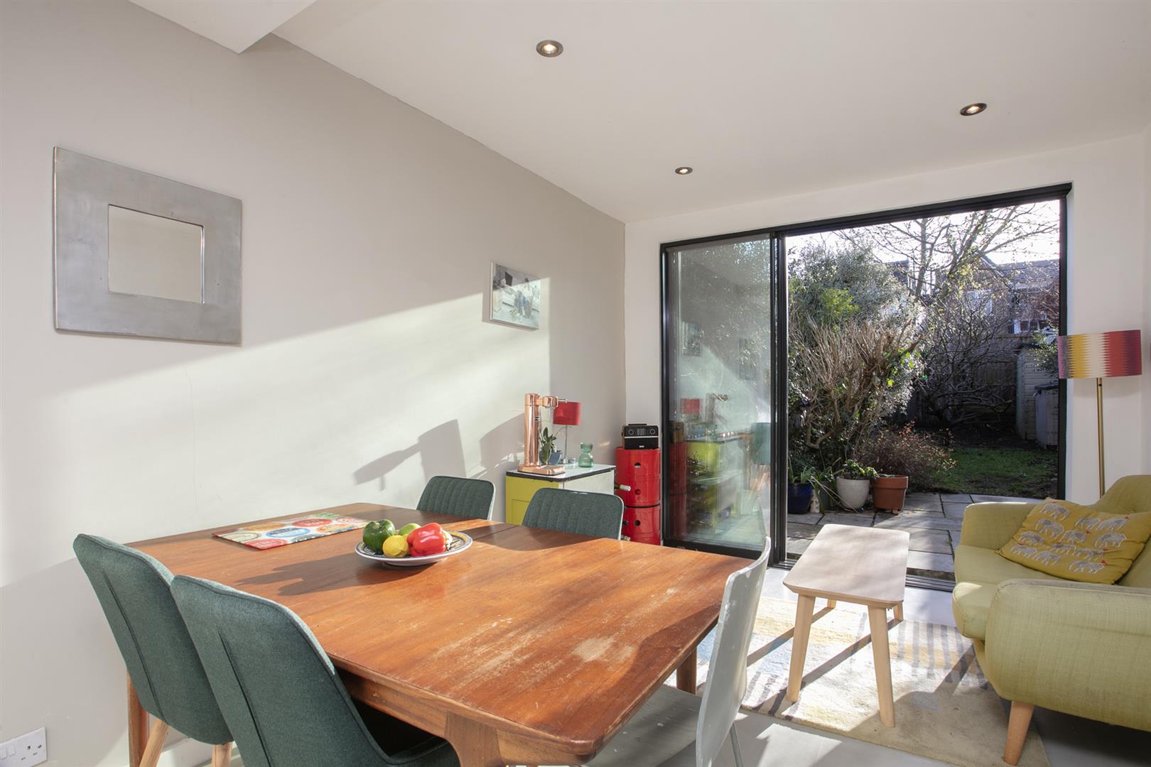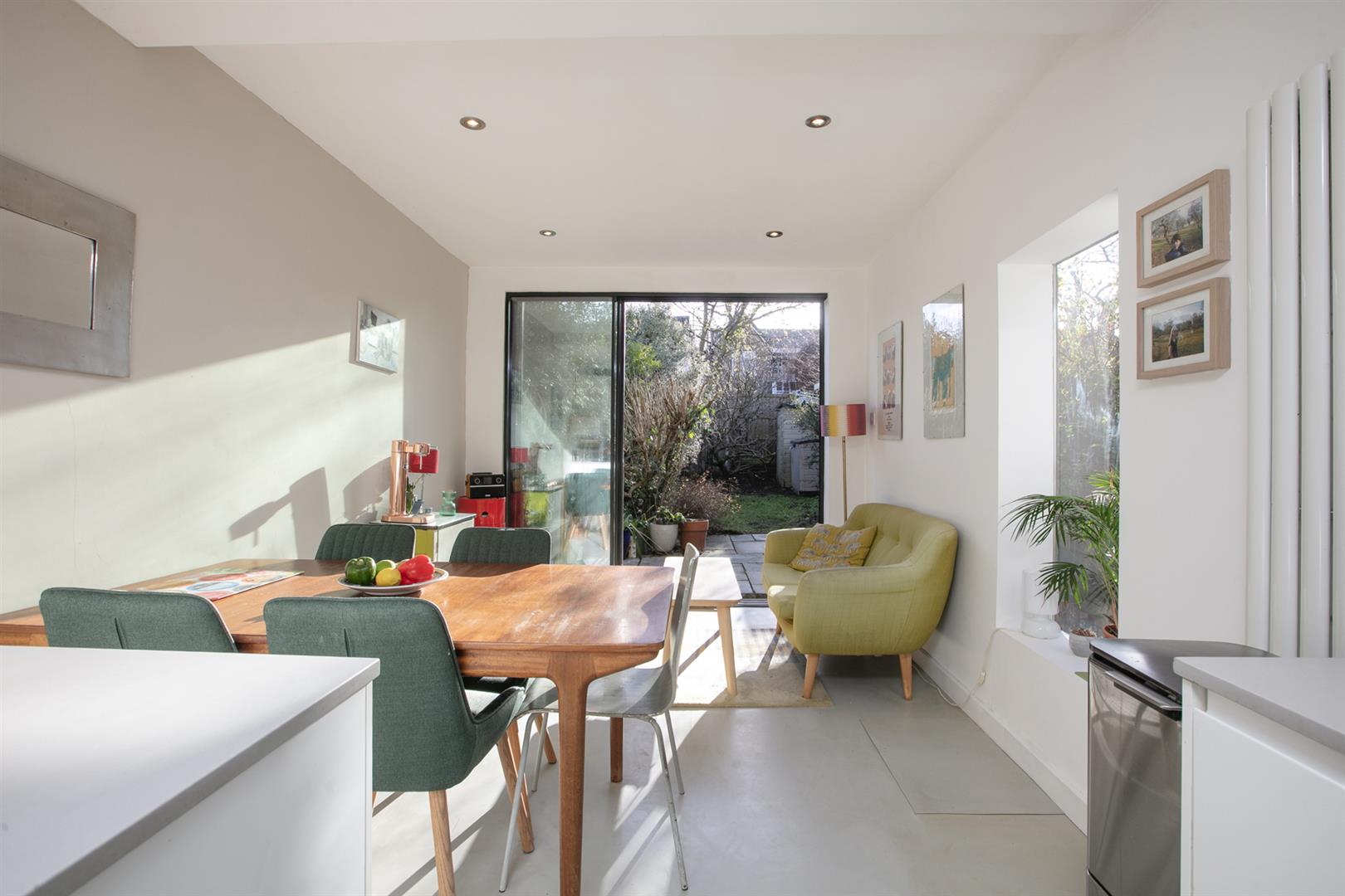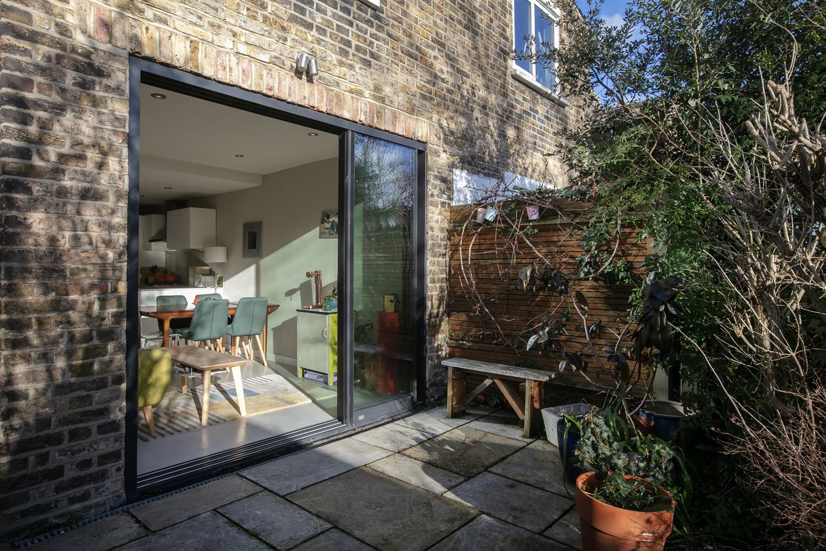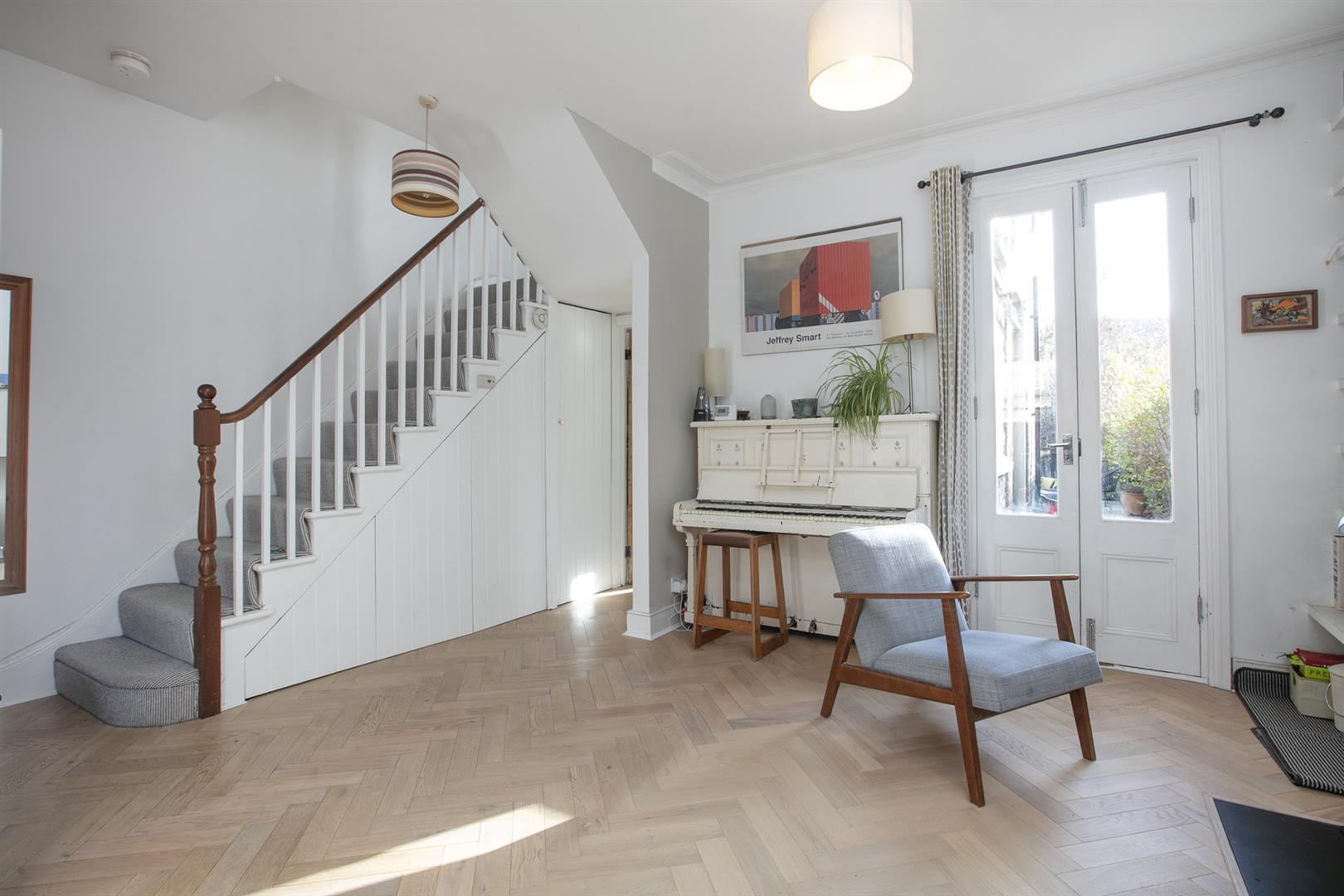 Enroute to the kitchen you'll pass bespoke storage which has been deftly tucked under the stairs - it hides a million sins and includes a handy laundry cupboard as well as space for shoes and coats! The dual aspect kitchen/diner is open-plan and wonderfully warm with a south-facing aspect. You'll easily fit a sofa in addition to formal dining meaning there is welcome space for adults and kids. The worktops are a stylish grey quartz with a one-and-half bowl undermount sink and appliances include AEG oven, four ring gas hob and integrated microwave and dishwasher. Funky industrial-grade Noraplan rubber flooring graces the whole space and you'll note Maxlight floor to ceiling aluminium ultra-slim sliding doors which open from either side onto a sunny patio. From here you enjoy a leafy south-facing garden which stretches to over 40ft, with a large sitting area, an apple tree and many mature shrubs including fragrant lilac, jasmine and honeysuckle.