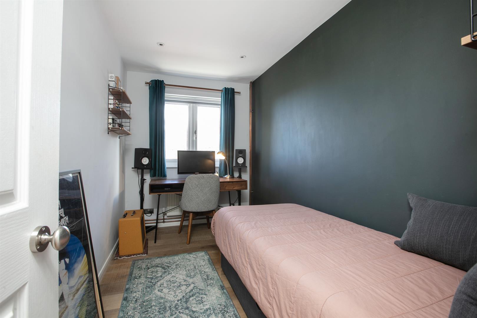 The handsome exterior enjoys views over a wooded green space. The communal entrance and areas are well kept and lead upward, via stairs, to the flat's second floor doorway. A spacious inner hall supplies recessed storage and plenty of room for coats and brollies. The larger of your two lovely bedrooms sits first on the left with a bright disposition. There's some great recessed storage to help keep things neat and tidy. The second bedroom is next door with the same bright appointment and a dusky Farrow and Ball feature wall. The living room runs uninterrupted from the hall to offer a wide, stylish open-plan space. It incorporates spacious cooking, lounging and dining areas. There's a modern kitchen to the right with loads of cabinet and counter space, four ring hob, oven, dishwasher and fridge/freezer. A breakfast bar offers natural separation to the lounge area which faces the far side of the room.