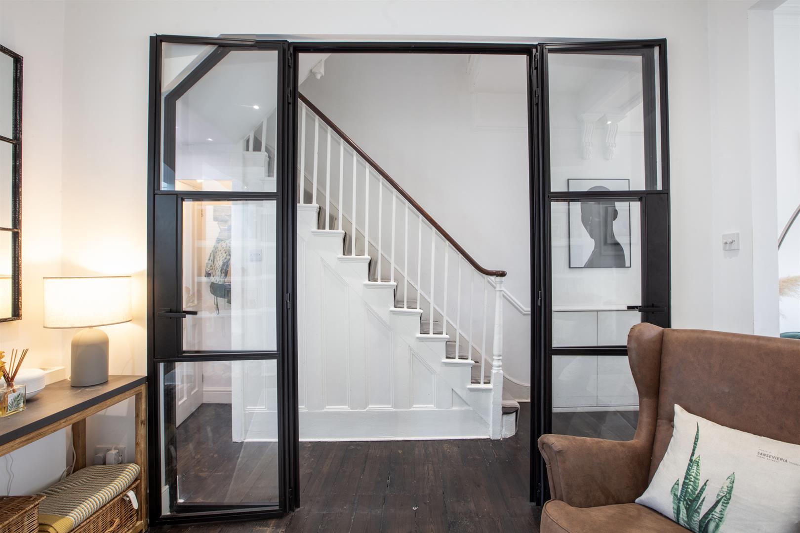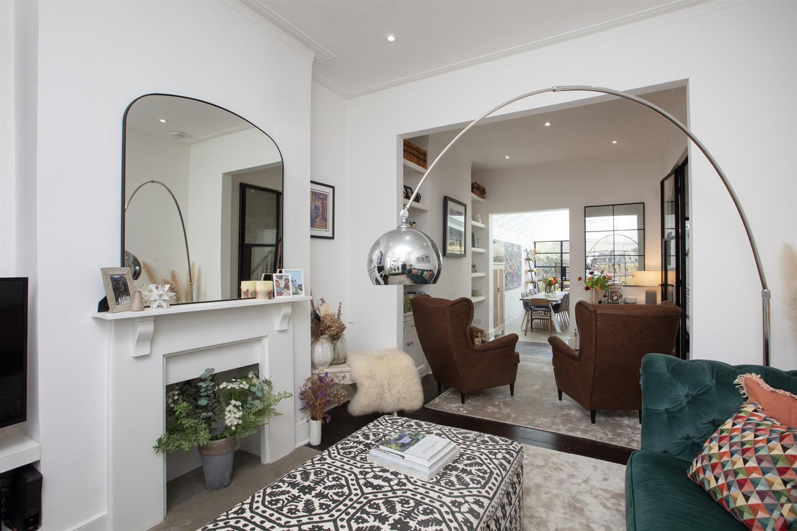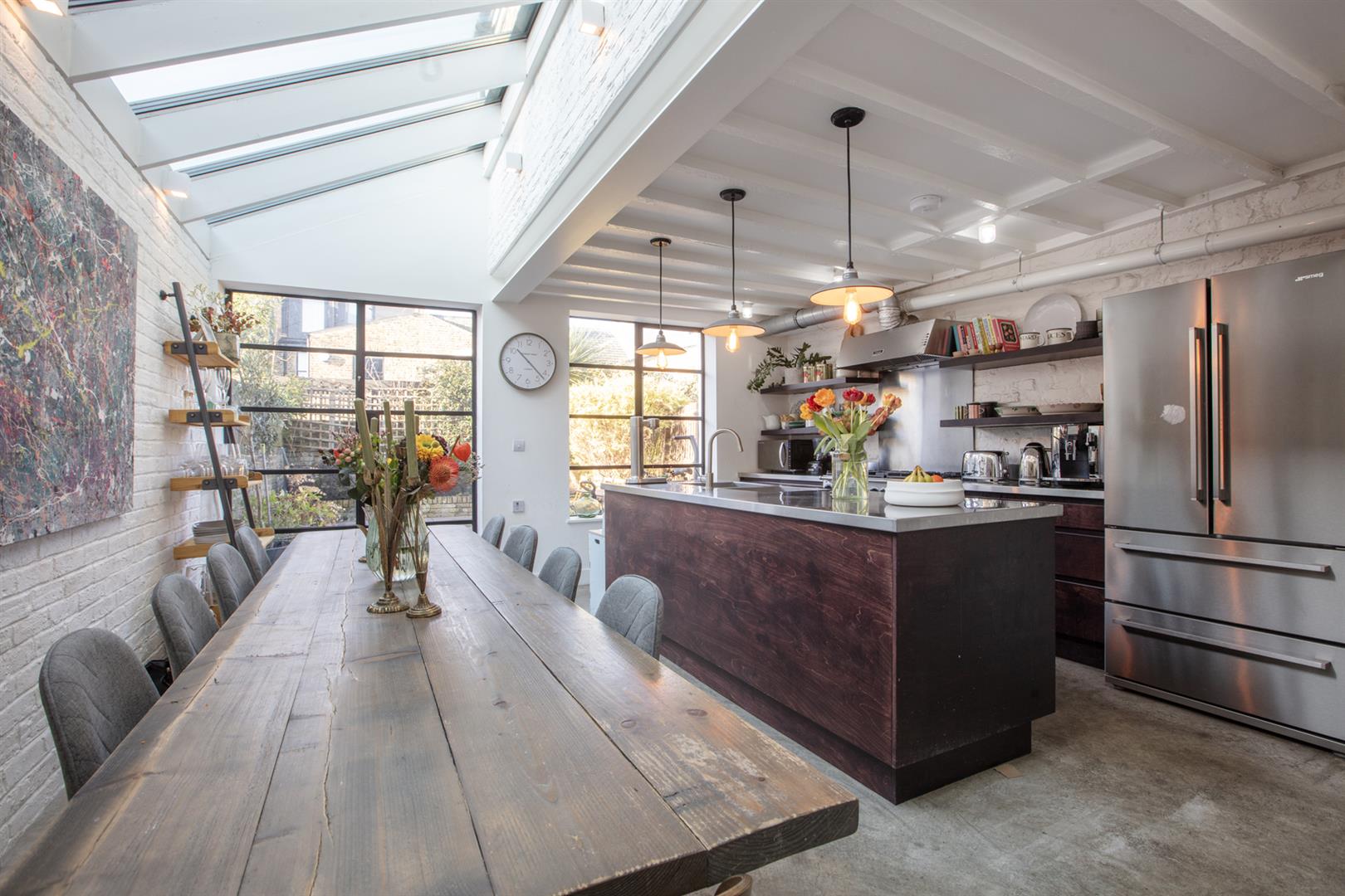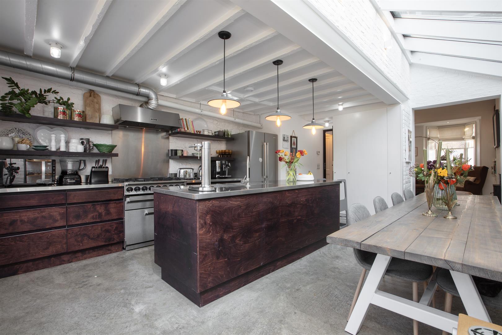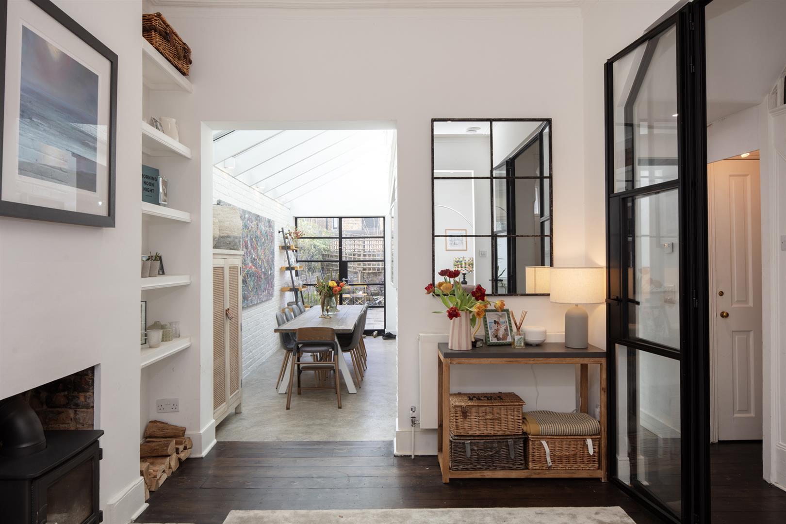 Regal black railings lead inward off the street which is graciously populated with similarly handsome period properties. The front garden will house bikes and bins. A recessed portico with decorative stucco work leads inward to the inner hall which has notably high ceilings, picture rails and original corbels. The original floorboards are beautifully stained and the walls are crisp and neutral. As the hall widens you meet splendid double metal-framed crittall-style glass doors that open wide to the double reception. This space runs generously from the front bay window to include two comfortable seating areas. There's a wood burner for year-round cosy vibes, some integrated shelving for the family pics and bespoke low-level storage. A wide arch invites you to that glorious full-width kitchen/diner which dons polished concrete flooring, white-wash exposed brick and a ceiling of vaulted glass for superb light. A stainless steel-topped island hosts a double sink, integrated dishwasher and tonnes of storage. There's further storage on the opposite side as well as a Falcon 5-ring gas range. A handy laundry cupboard will house the washing machine and dryer. Further crittall-style doors open rear to the garden.