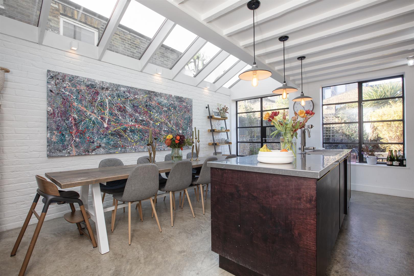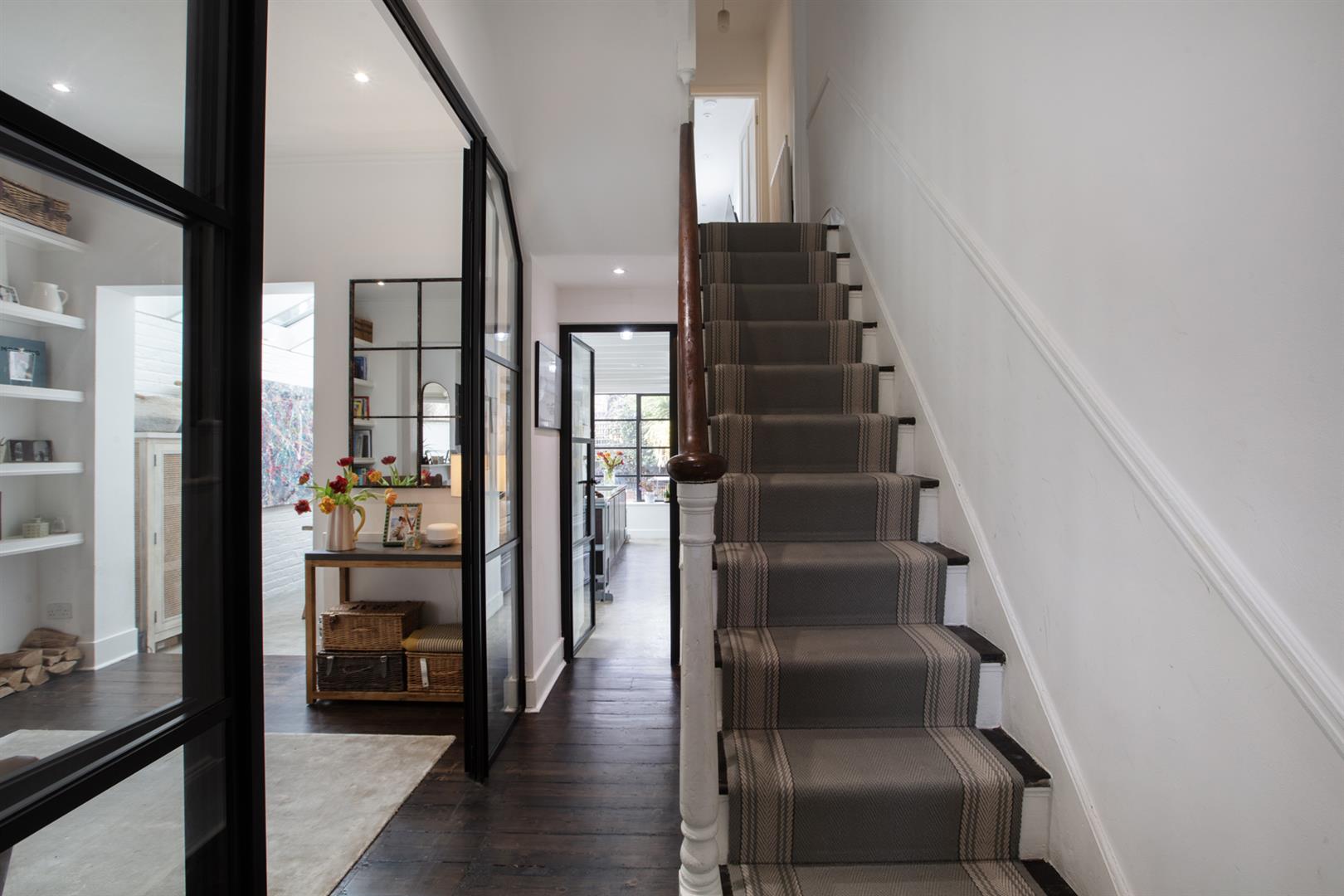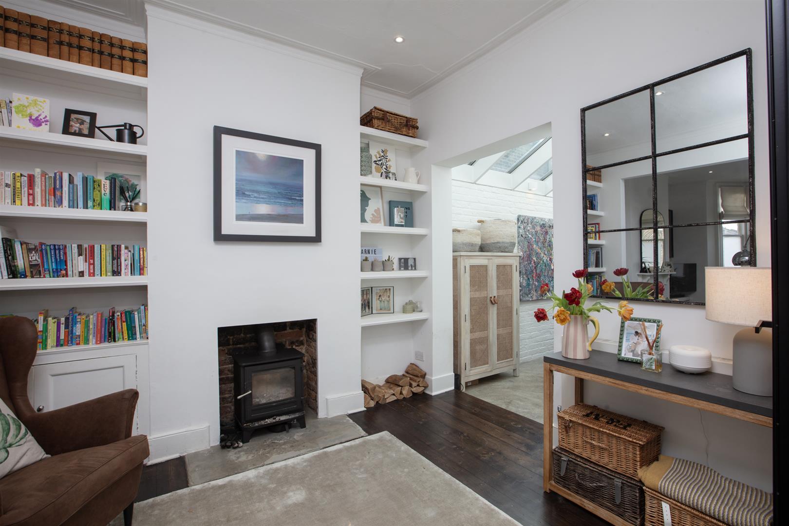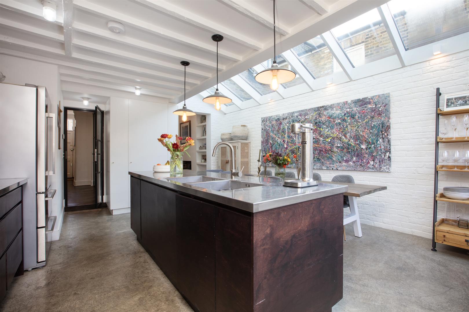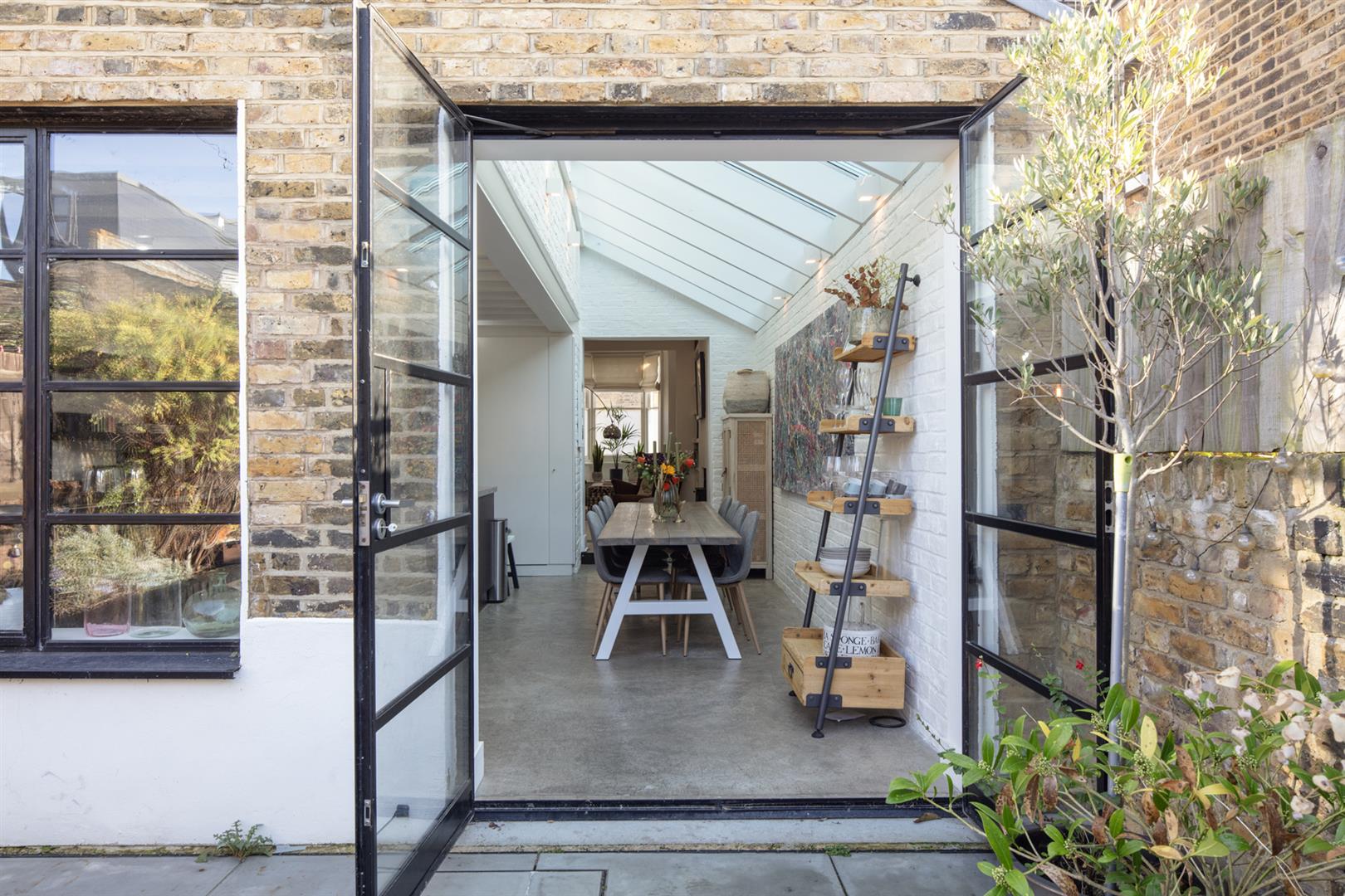Regal black railings lead inward off the street which is graciously populated with similarly handsome period properties. The front garden will house bikes and bins. A recessed portico with decorative stucco work leads inward to the inner hall which has notably high ceilings, picture rails and original corbels. The original floorboards are beautifully stained and the walls are crisp and neutral. As the hall widens you meet splendid double metal-framed crittall-style glass doors that open wide to the double reception. This space runs generously from the front bay window to include two comfortable seating areas. There's a wood burner for year-round cosy vibes, some integrated shelving for the family pics and bespoke low-level storage. A wide arch invites you to that glorious full-width kitchen/diner which dons polished concrete flooring, white-wash exposed brick and a ceiling of vaulted glass for superb light. A stainless steel-topped island hosts a double sink, integrated dishwasher and tonnes of storage. There's further storage on the opposite side as well as a Falcon 5-ring gas range. A handy laundry cupboard will house the washing machine and dryer. Further crittall-style doors open rear to the garden.