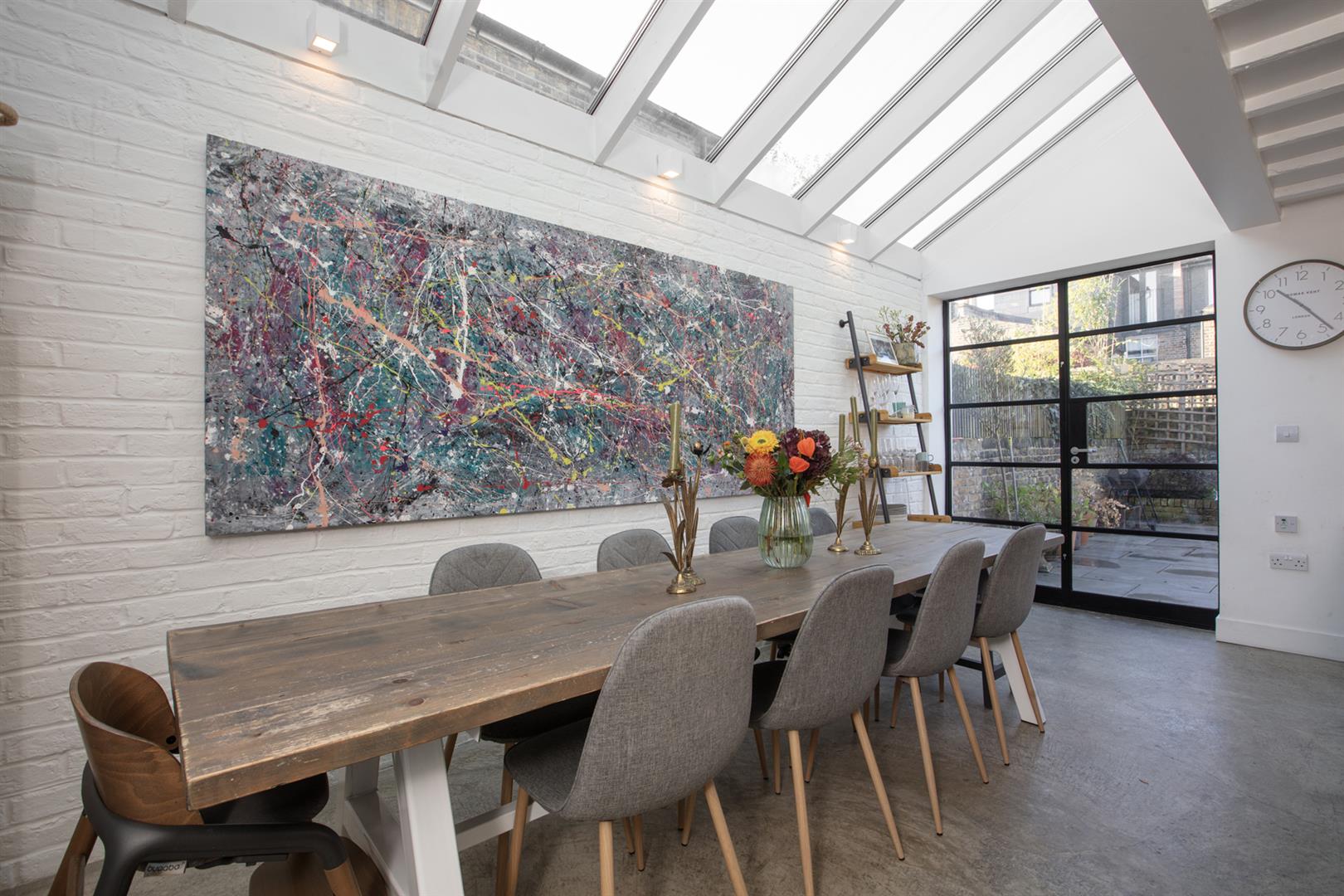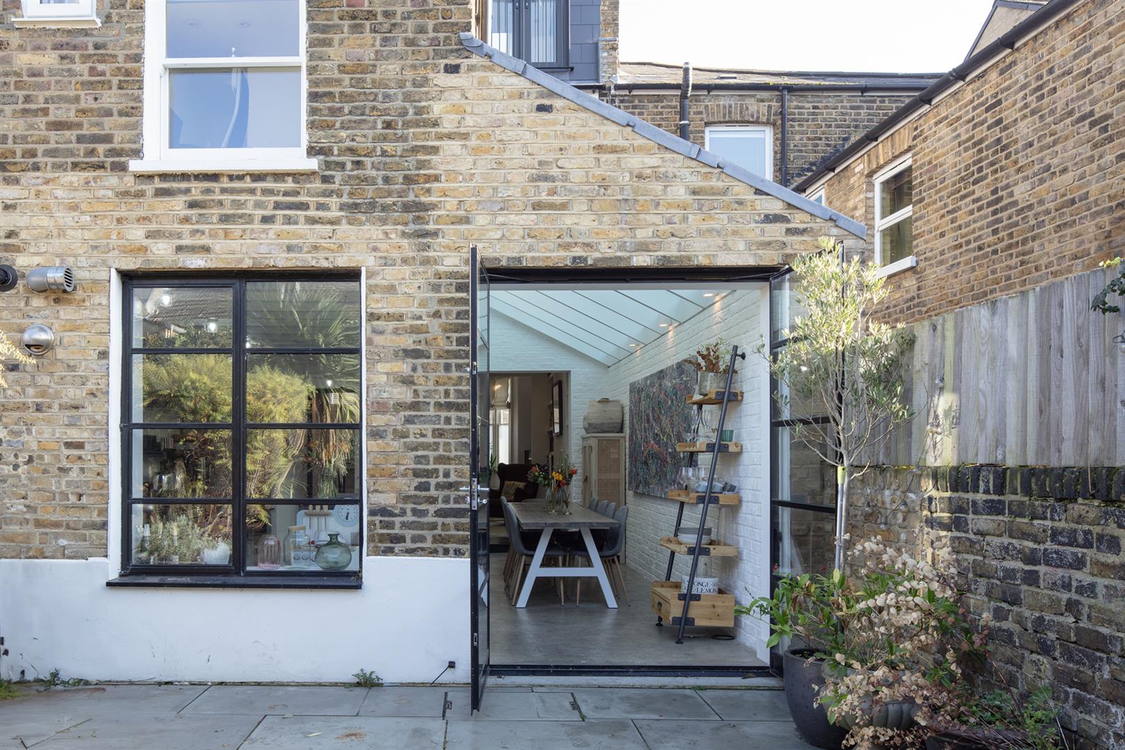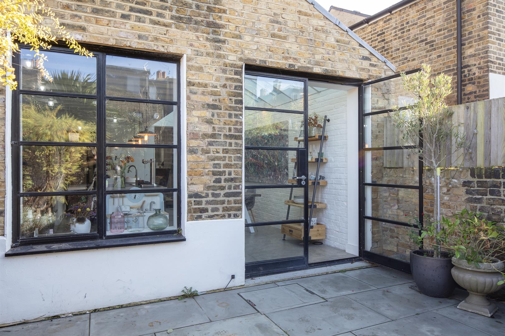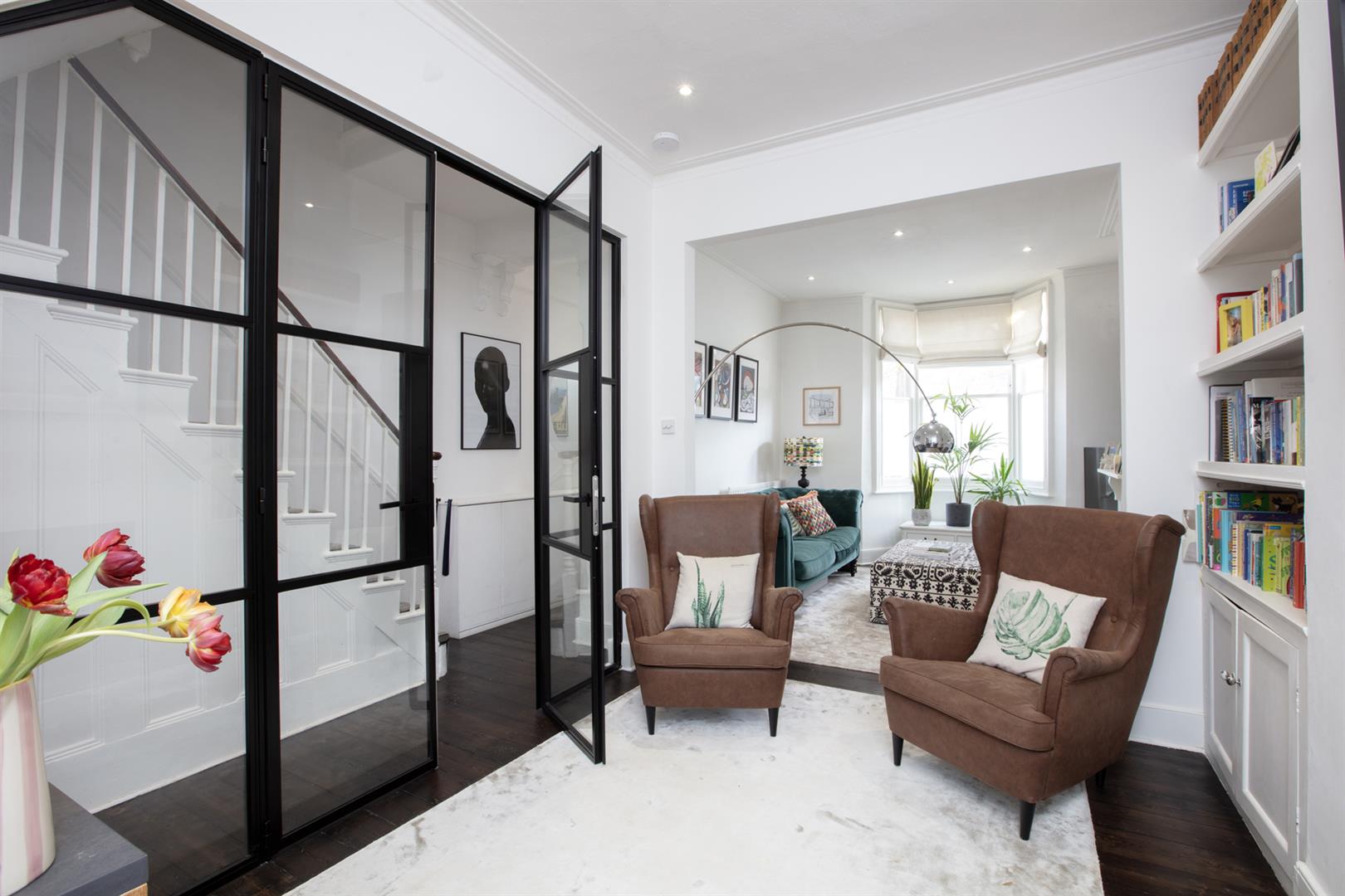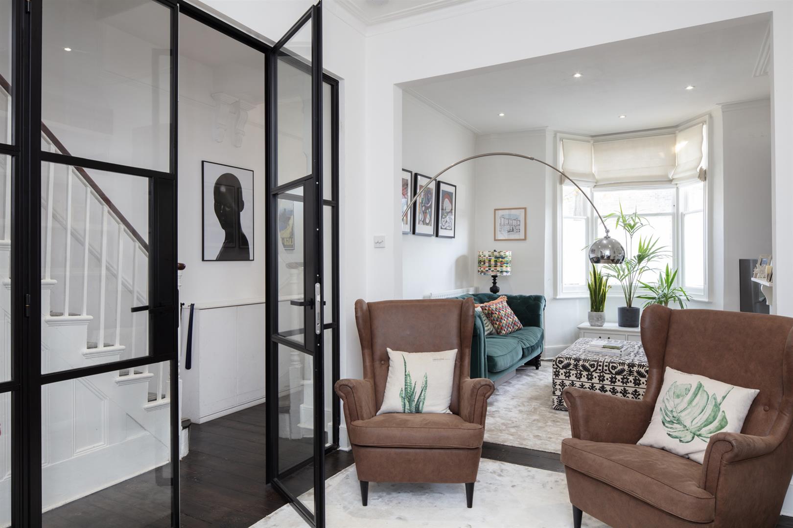 Regal black railings lead inward off the street which is graciously populated with similarly handsome period properties. The front garden will house bikes and bins. A recessed portico with decorative stucco work leads inward to the inner hall which has notably high ceilings, picture rails and original corbels. The original floorboards are beautifully stained and the walls are crisp and neutral. As the hall widens you meet splendid double metal-framed crittall-style glass doors that open wide to the double reception. This space runs generously from the front bay window to include two comfortable seating areas. There's a wood burner for year-round cosy vibes, some integrated shelving for the family pics and bespoke low-level storage. A wide arch invites you to that glorious full-width kitchen/diner which dons polished concrete flooring, white-wash exposed brick and a ceiling of vaulted glass for superb light. A stainless steel-topped island hosts a double sink, integrated dishwasher and tonnes of storage. There's further storage on the opposite side as well as a Falcon 5-ring gas range. A handy laundry cupboard will house the washing machine and dryer. Further crittall-style doors open rear to the garden.