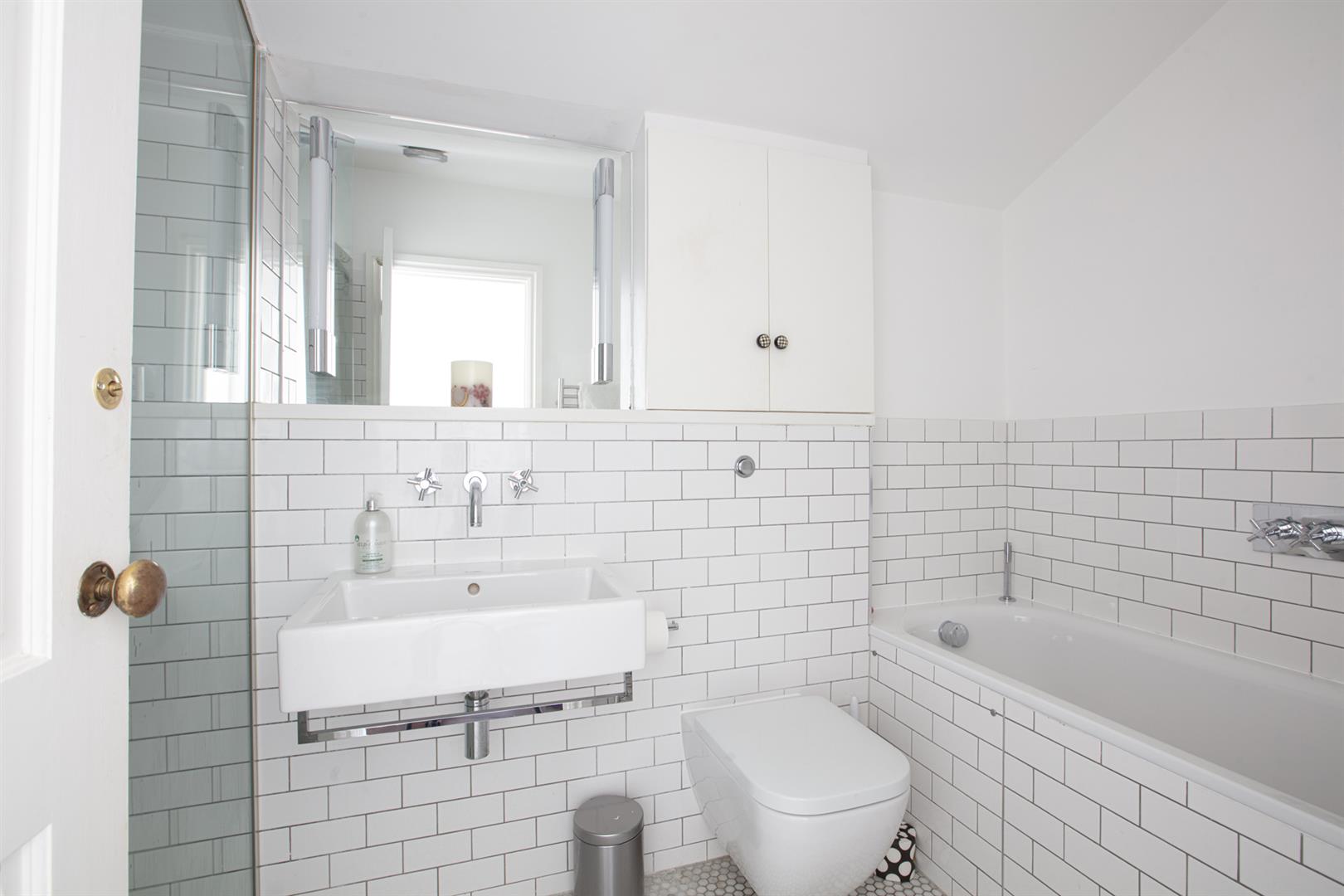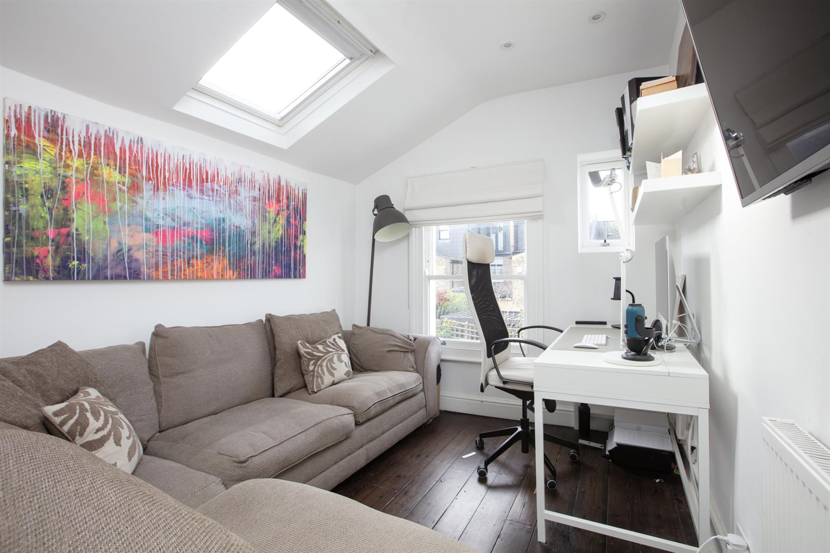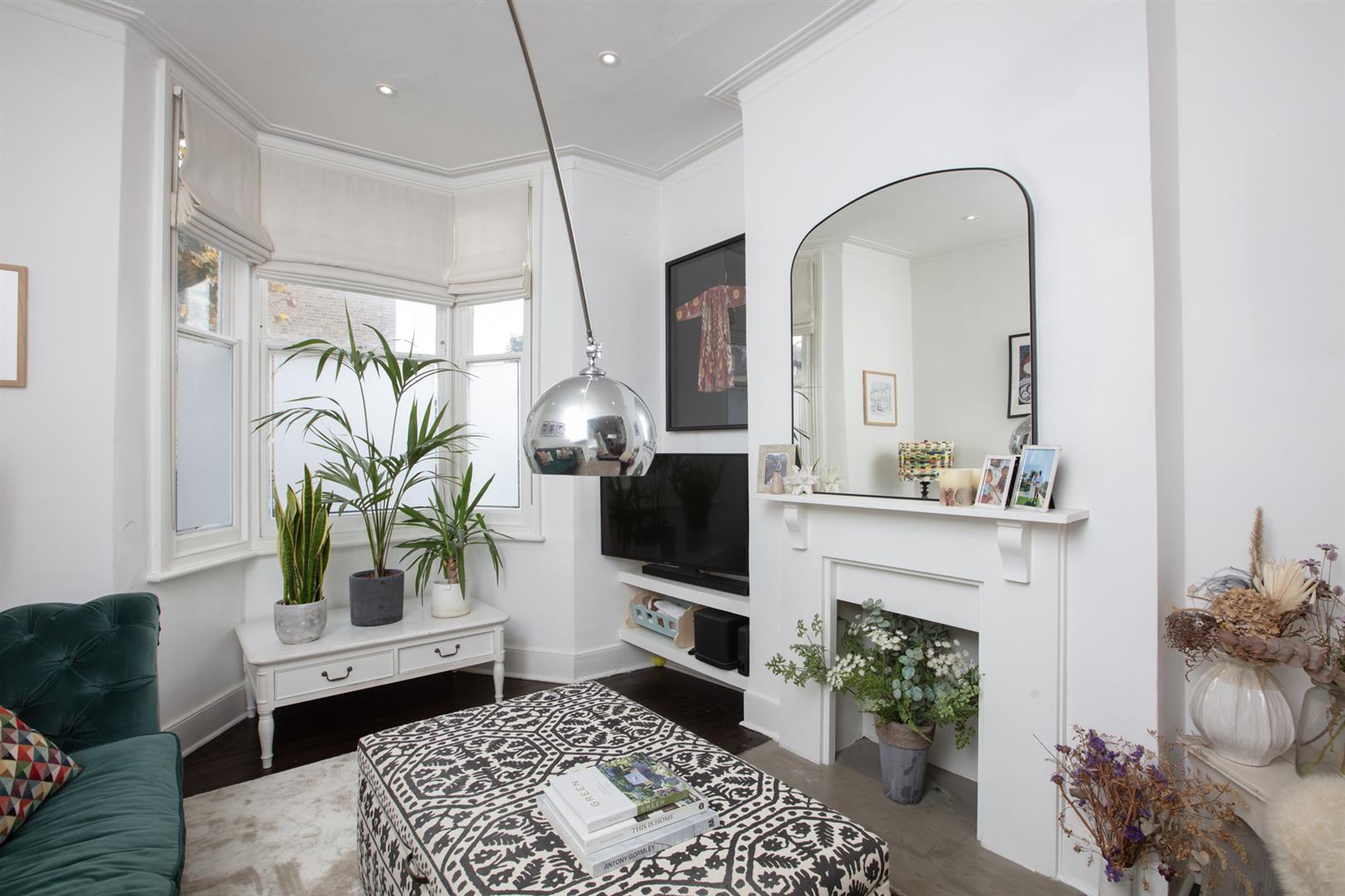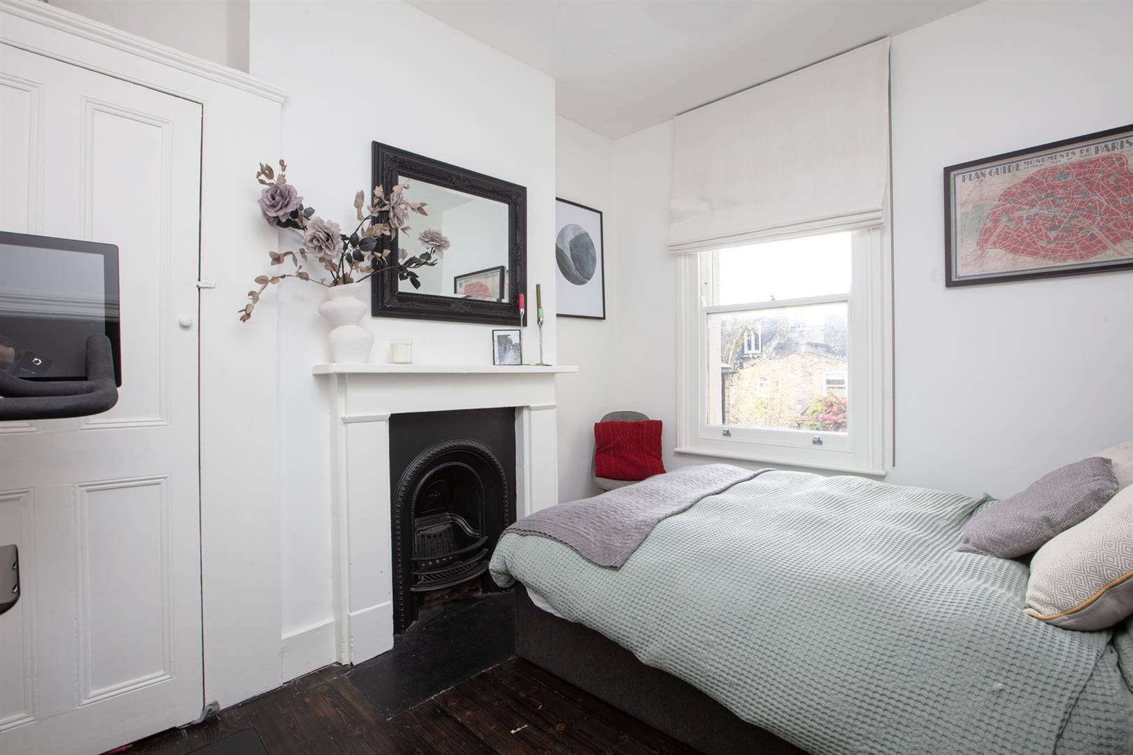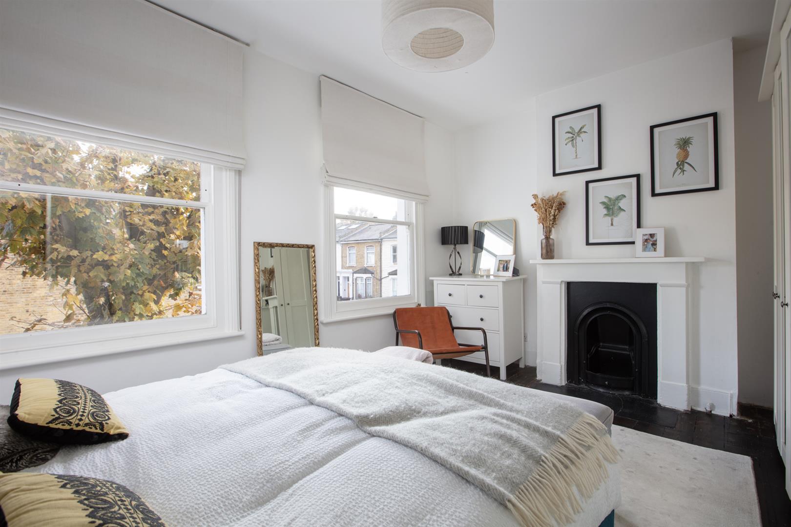 The first return enjoys more wonderful original floorboards and the first of your bedrooms, a rear-facing number with garden views and additional Velux window. Currently arranged as a study it will easily house a double bed. Next to this is a beautiful shower room with bath, walk-in shower, heated towel rail and modern honeycomb floor tiling. Upward to the first floor you find a gorgeous front-facing double bedroom two sash windows framing a most inviting leafy streetscape. A period feature fireplace adds to the ambiance. The third bedroom sits next door with the same simple finish, original storage and feature fireplace. Your final upward climb is rewarded richly! The master suite is simply delightful! A light, airy and generous double bedroom enjoys plenty of fitted storage, two huge velux AND a rear facing Juliette balcony. Adjoining this is a swanky ensuite shower room with crittall-style shower screen and matching matt black fixtures. A versatile study