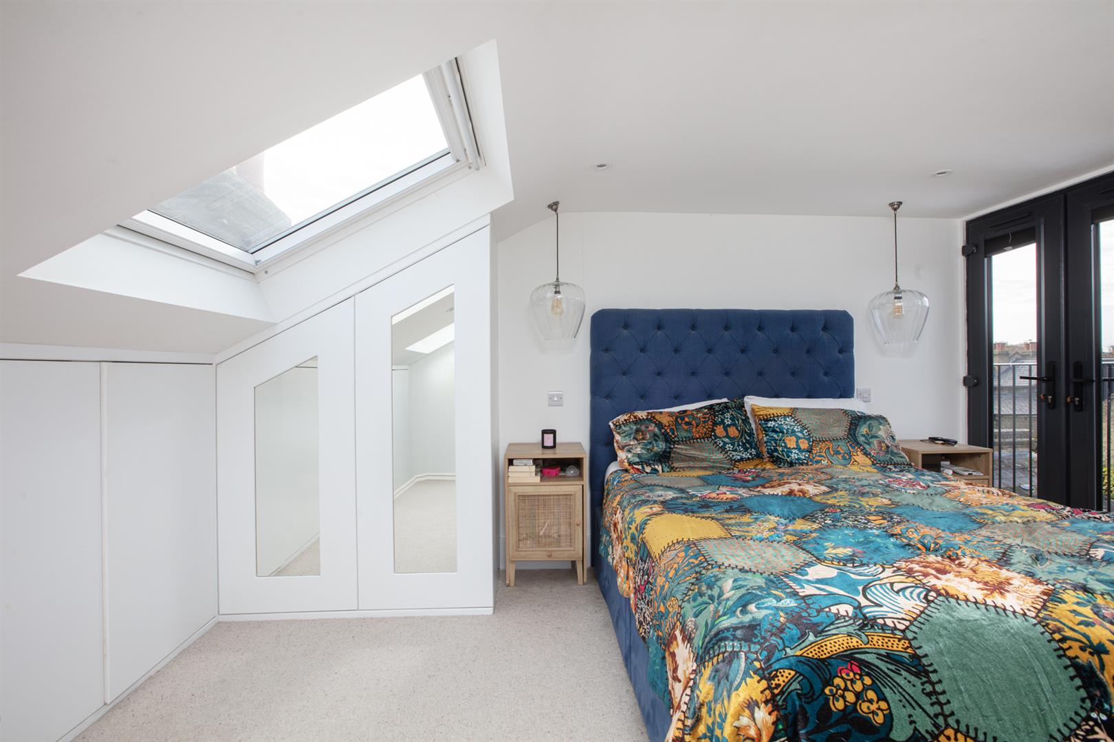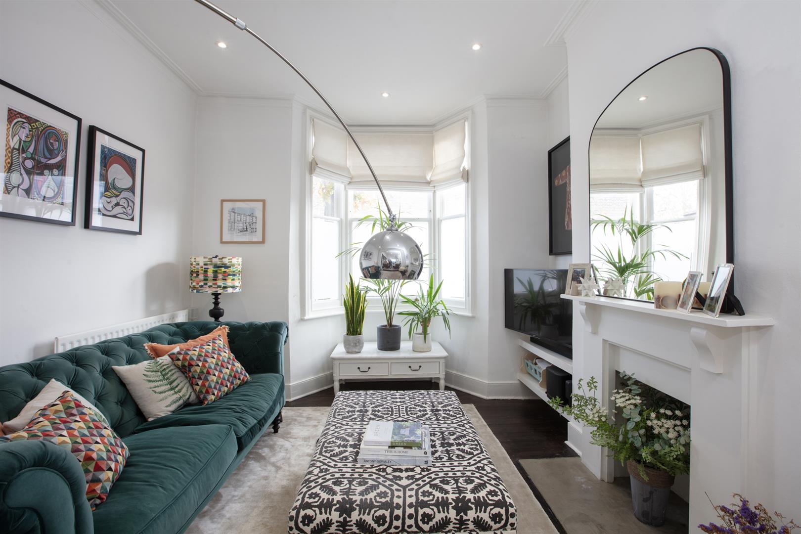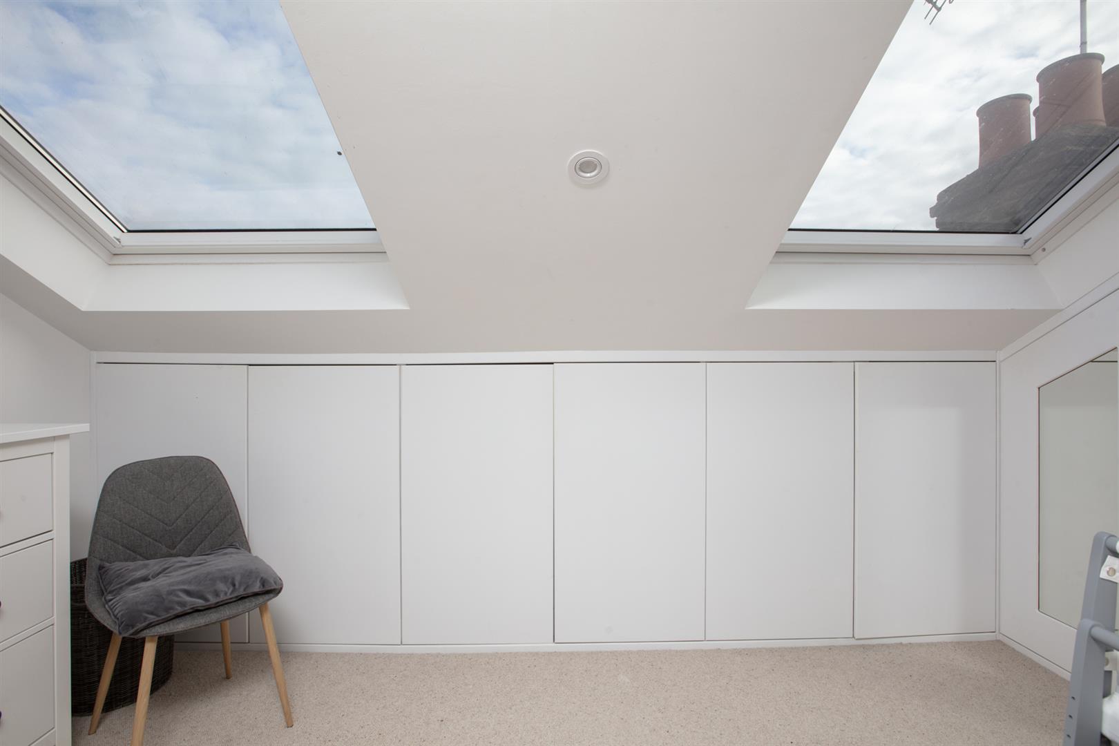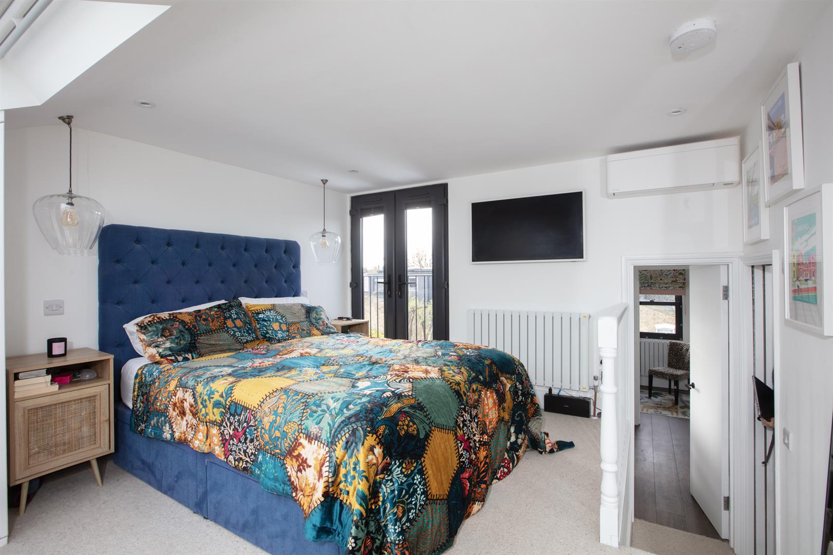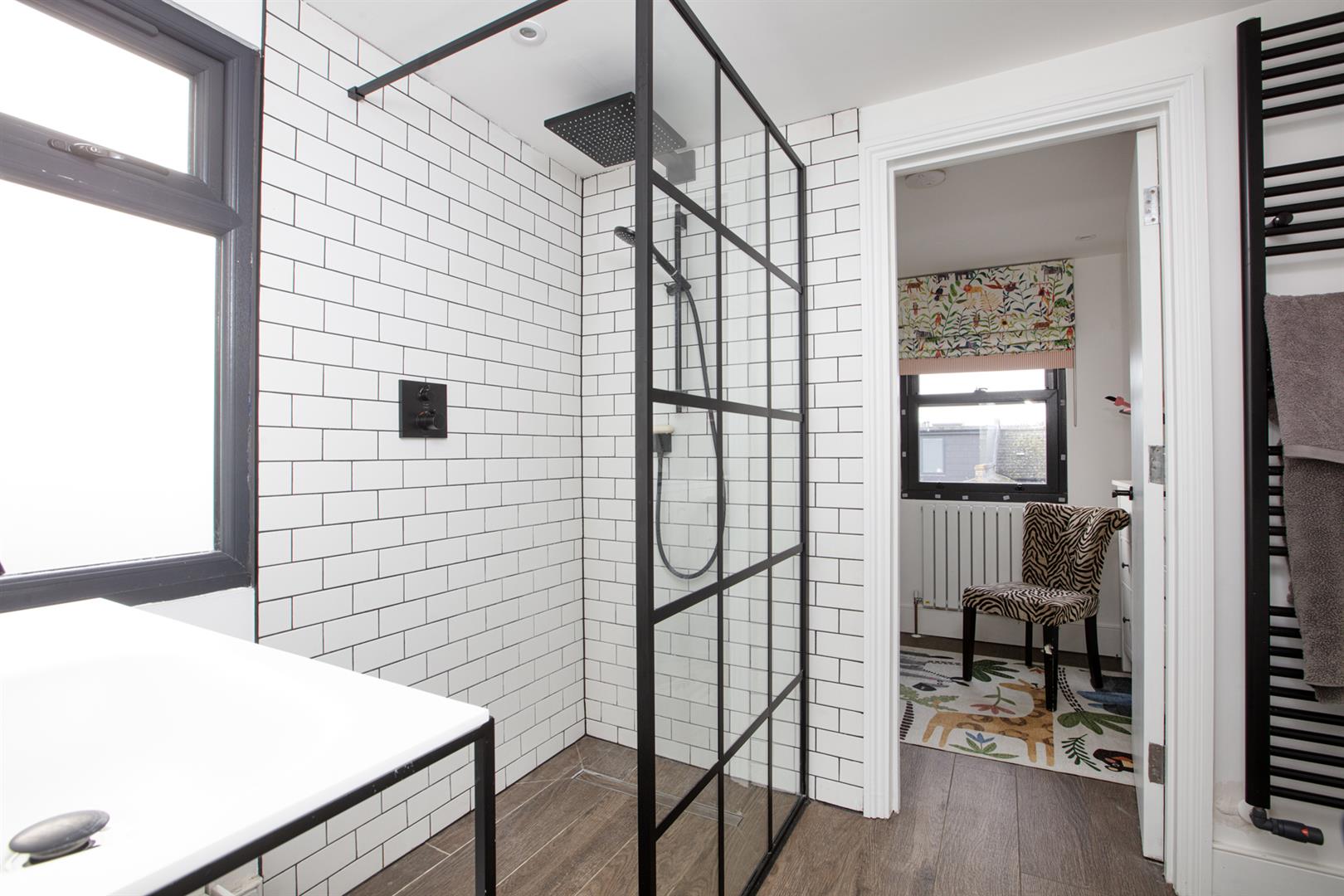 The first return enjoys more wonderful original floorboards and the first of your bedrooms, a rear-facing number with garden views and additional Velux window. Currently arranged as a study it will easily house a double bed. Next to this is a beautiful shower room with bath, walk-in shower, heated towel rail and modern honeycomb floor tiling. Upward to the first floor you find a gorgeous front-facing double bedroom two sash windows framing a most inviting leafy streetscape. A period feature fireplace adds to the ambiance. The third bedroom sits next door with the same simple finish, original storage and feature fireplace. Your final upward climb is rewarded richly! The master suite is simply delightful! A light, airy and generous double bedroom enjoys plenty of fitted storage, two huge velux AND a rear facing Juliette balcony. Adjoining this is a swanky ensuite shower room with crittall-style shower screen and matching matt black fixtures. A versatile study