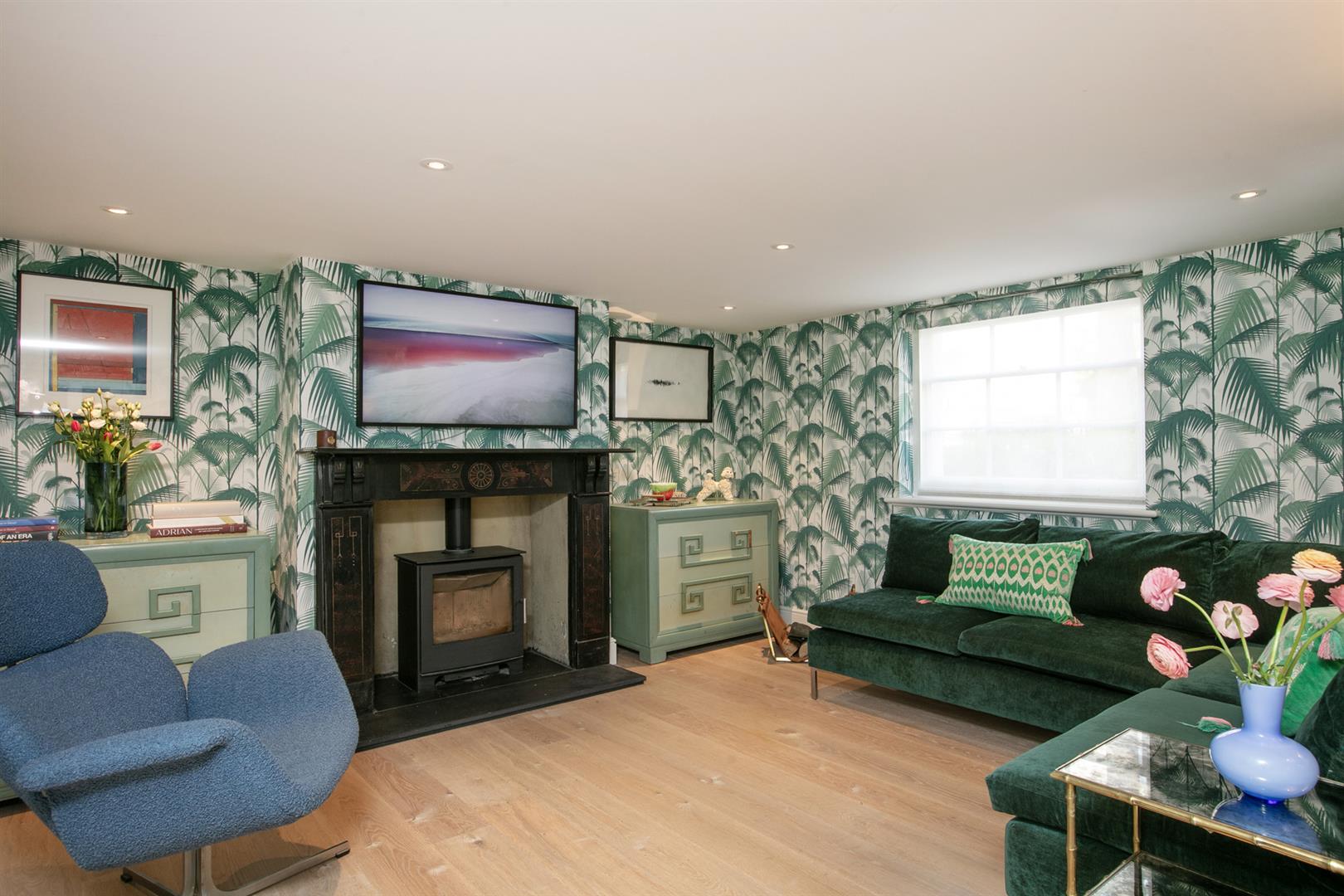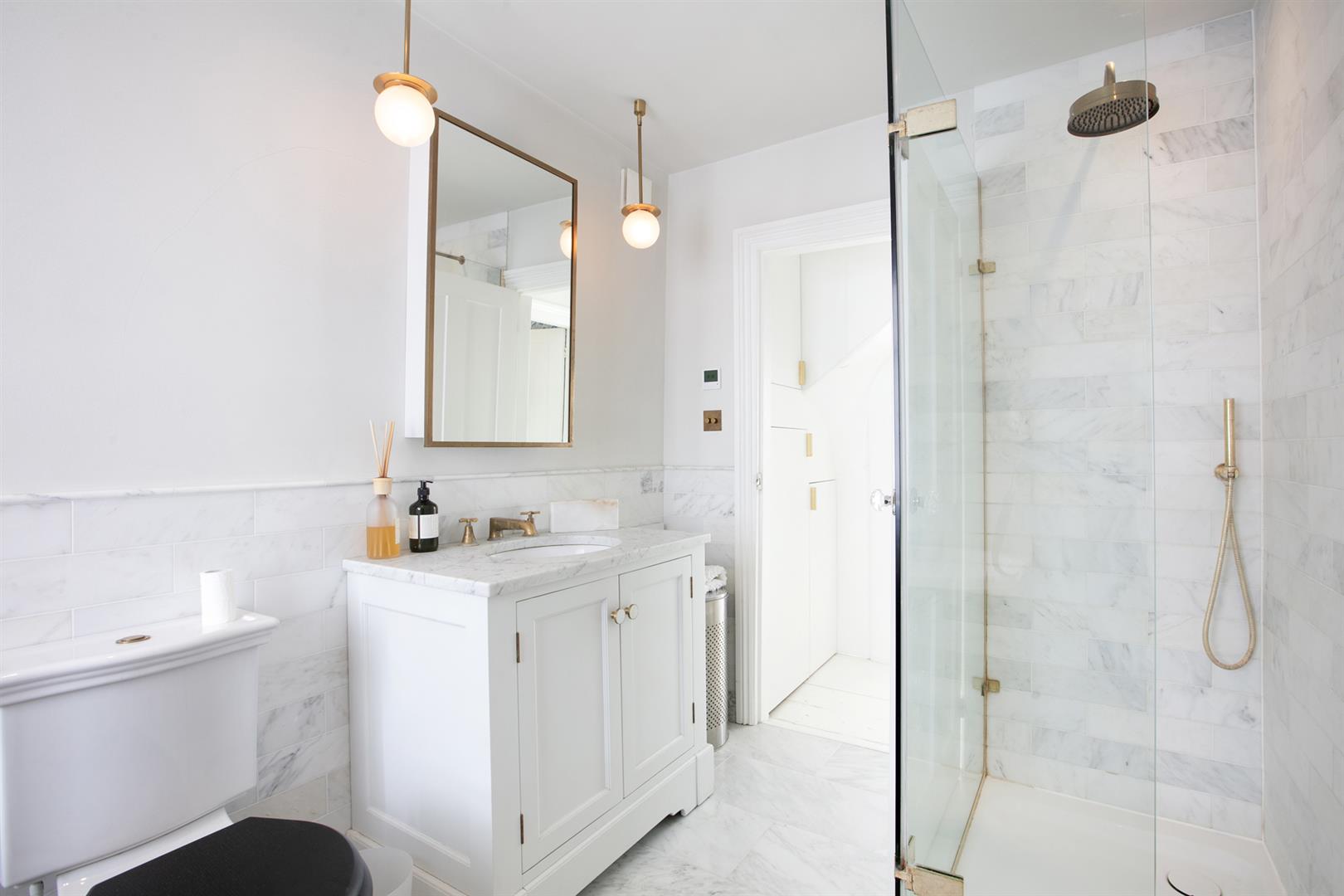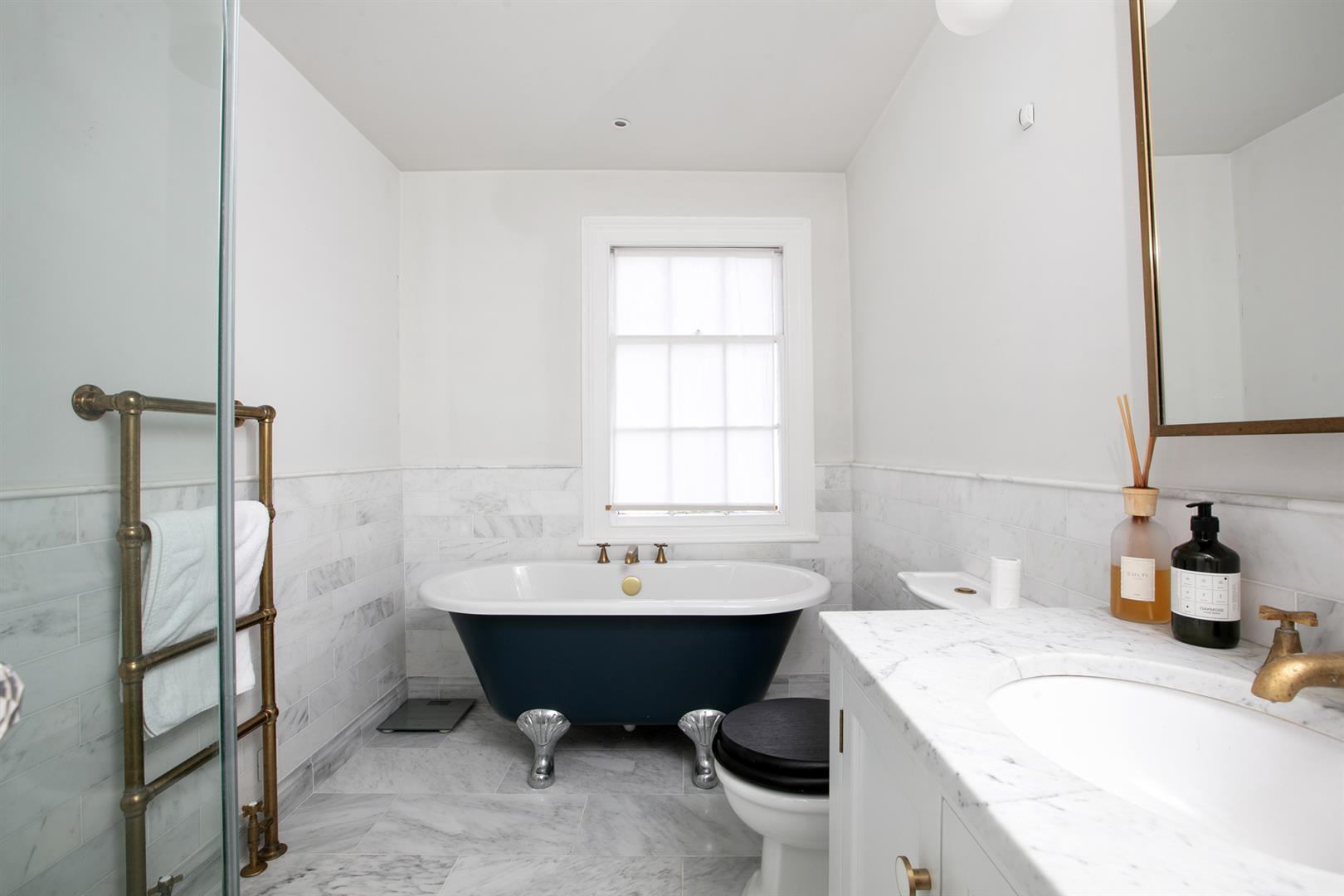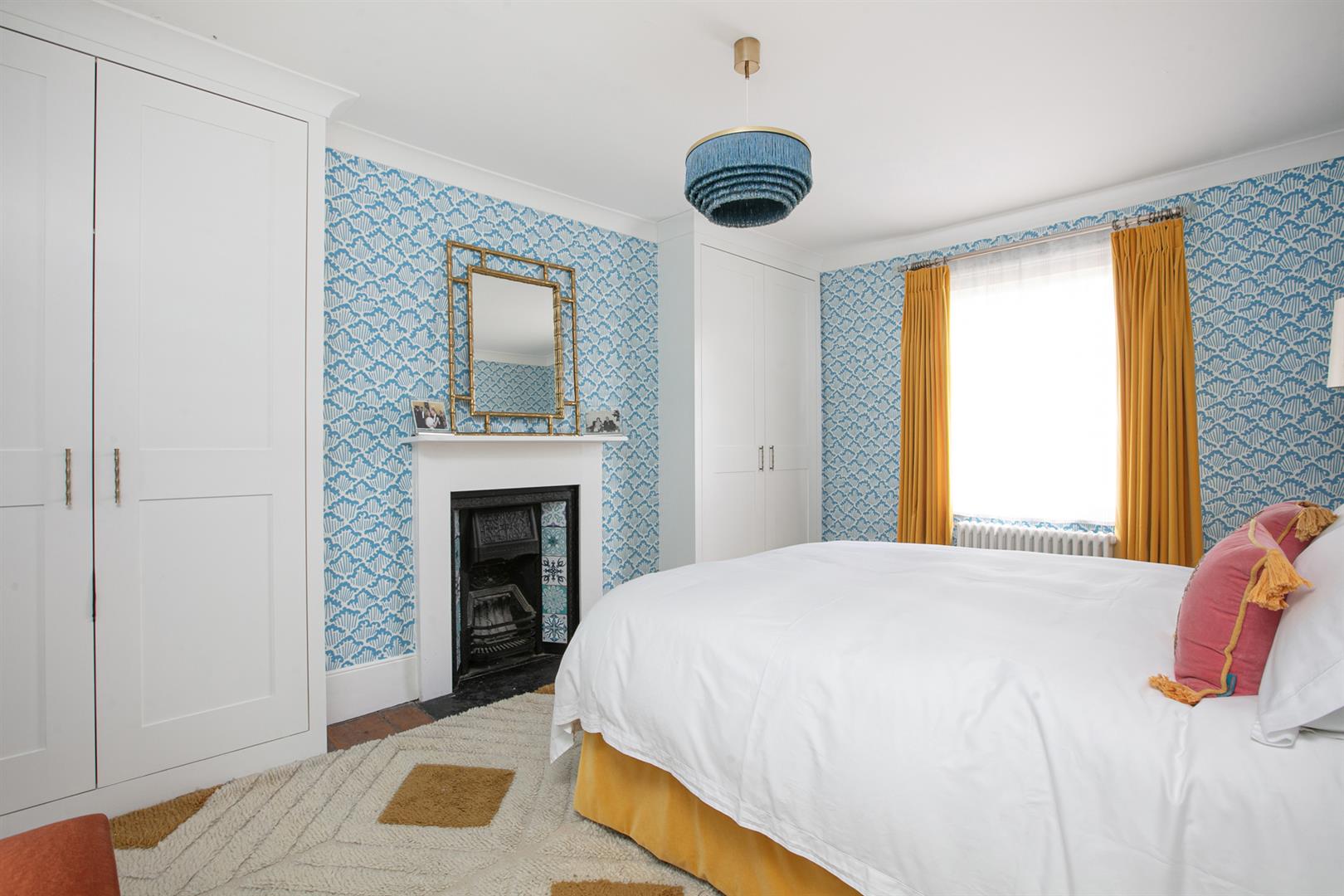 Upward to your wonderfully airy landing you find another rear facing sash window presiding over the rear leafy expanse. Bedroom one fronts the street with a gorgeous feature fireplace. This is flanked on either side by bespoke floor-to-ceiling wardrobes. The designer wallpaper complements perfectly the tiling - it's such a thoughtful combination. Bedroom two is another fine double with more tasteful wallpaper, a feature fireplace, bespoke storage and more glorious garden views. Recessed storage on the landing precedes your semi-tiled 'Porter' bathroom which has a neat roll top bath, period style suite and modern walk-in shower. The heated towel rail, taps and shower head are beautiful brushed brass. Last but not least comes a lovely loft room accessed from the landing up a cute staircase. It's a dual aspect room with wrap-around loft storage.
