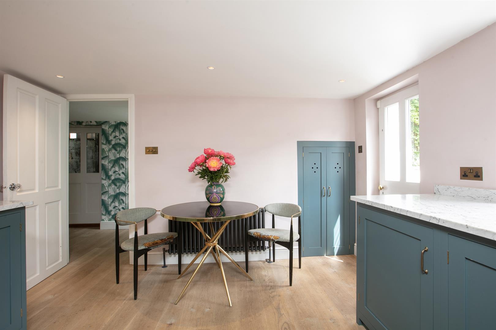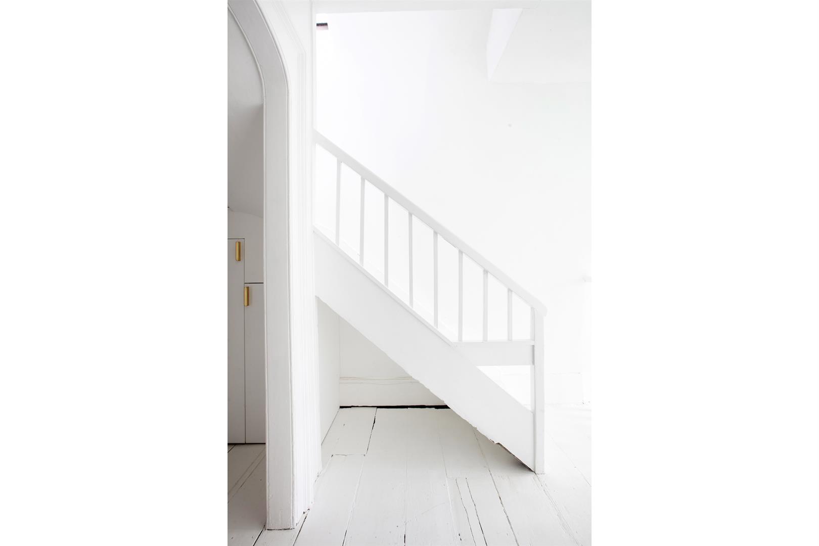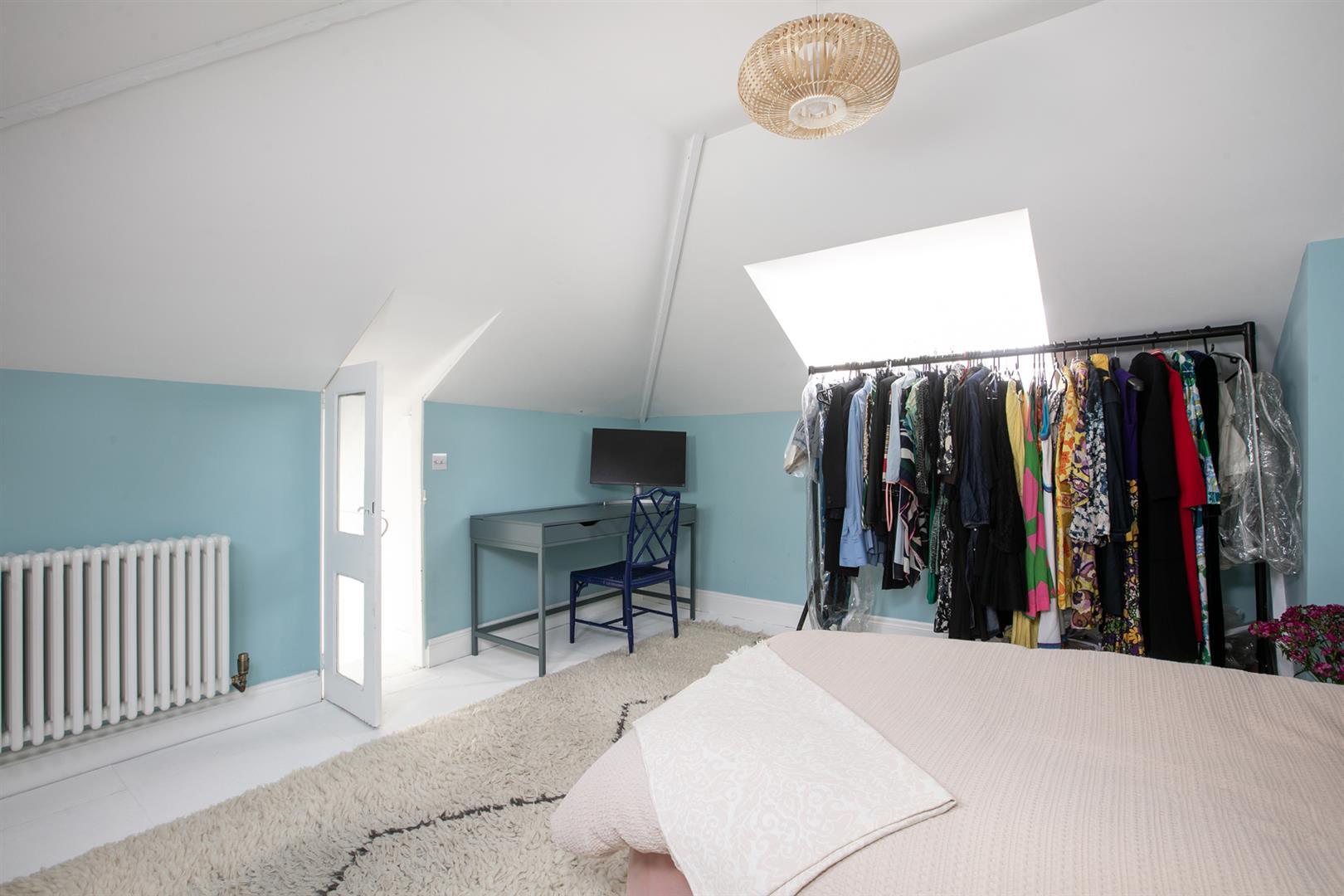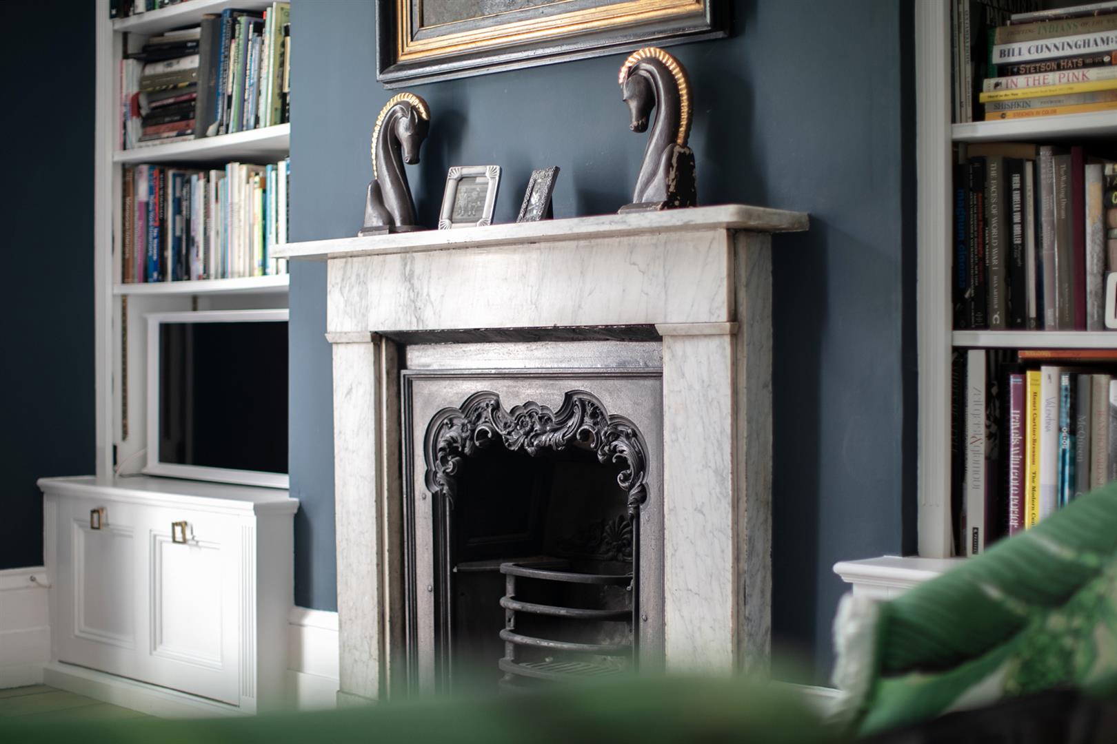 Upward to your wonderfully airy landing you find another rear facing sash window presiding over the rear leafy expanse. Bedroom one fronts the street with a gorgeous feature fireplace. This is flanked on either side by bespoke floor-to-ceiling wardrobes. The designer wallpaper complements perfectly the tiling - it's such a thoughtful combination. Bedroom two is another fine double with more tasteful wallpaper, a feature fireplace, bespoke storage and more glorious garden views. Recessed storage on the landing precedes your semi-tiled 'Porter' bathroom which has a neat roll top bath, period style suite and modern walk-in shower. The heated towel rail, taps and shower head are beautiful brushed brass. Last but not least comes a lovely loft room accessed from the landing up a cute staircase. It's a dual aspect room with wrap-around loft storage.