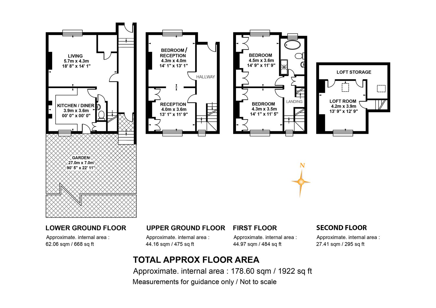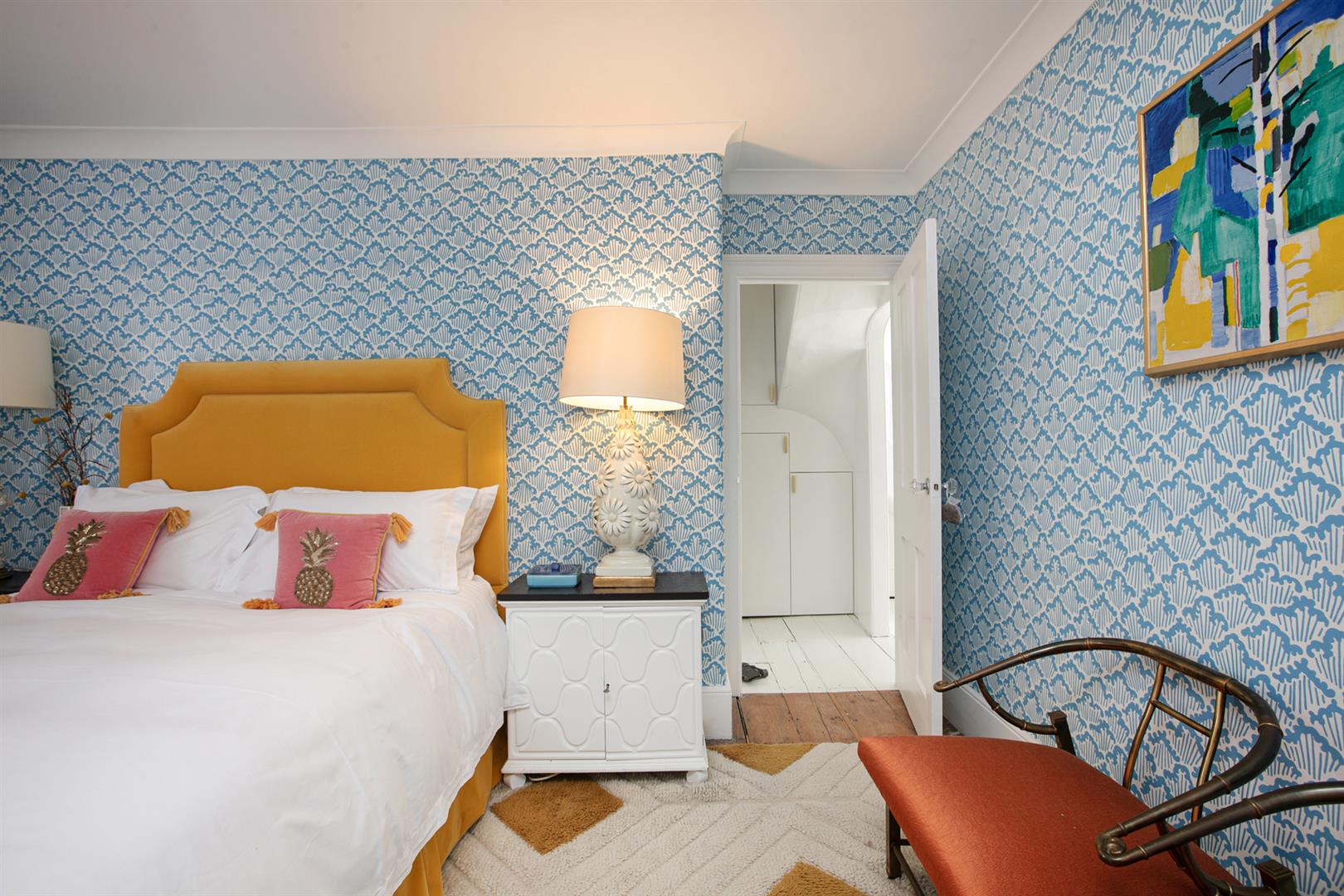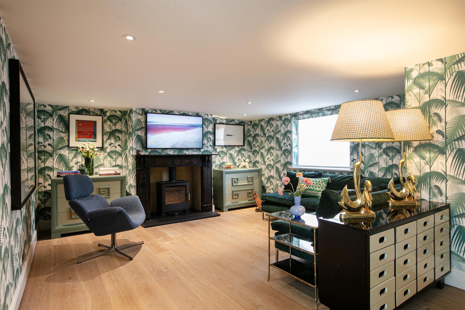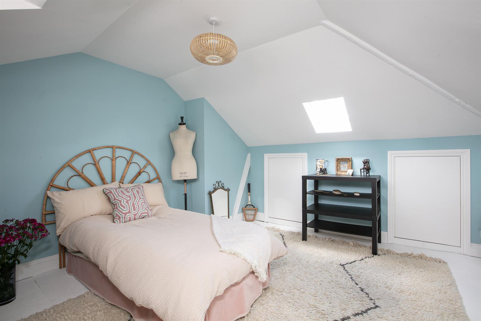 Upward to your wonderfully airy landing you find another rear facing sash window presiding over the rear leafy expanse. Bedroom one fronts the street with a gorgeous feature fireplace. This is flanked on either side by bespoke floor-to-ceiling wardrobes. The designer wallpaper complements perfectly the tiling - it's such a thoughtful combination. Bedroom two is another fine double with more tasteful wallpaper, a feature fireplace, bespoke storage and more glorious garden views. Recessed storage on the landing precedes your semi-tiled 'Porter' bathroom which has a neat roll top bath, period style suite and modern walk-in shower. The heated towel rail, taps and shower head are beautiful brushed brass. Last but not least comes a lovely loft room accessed from the landing up a cute staircase. It's a dual aspect room with wrap-around loft storage.