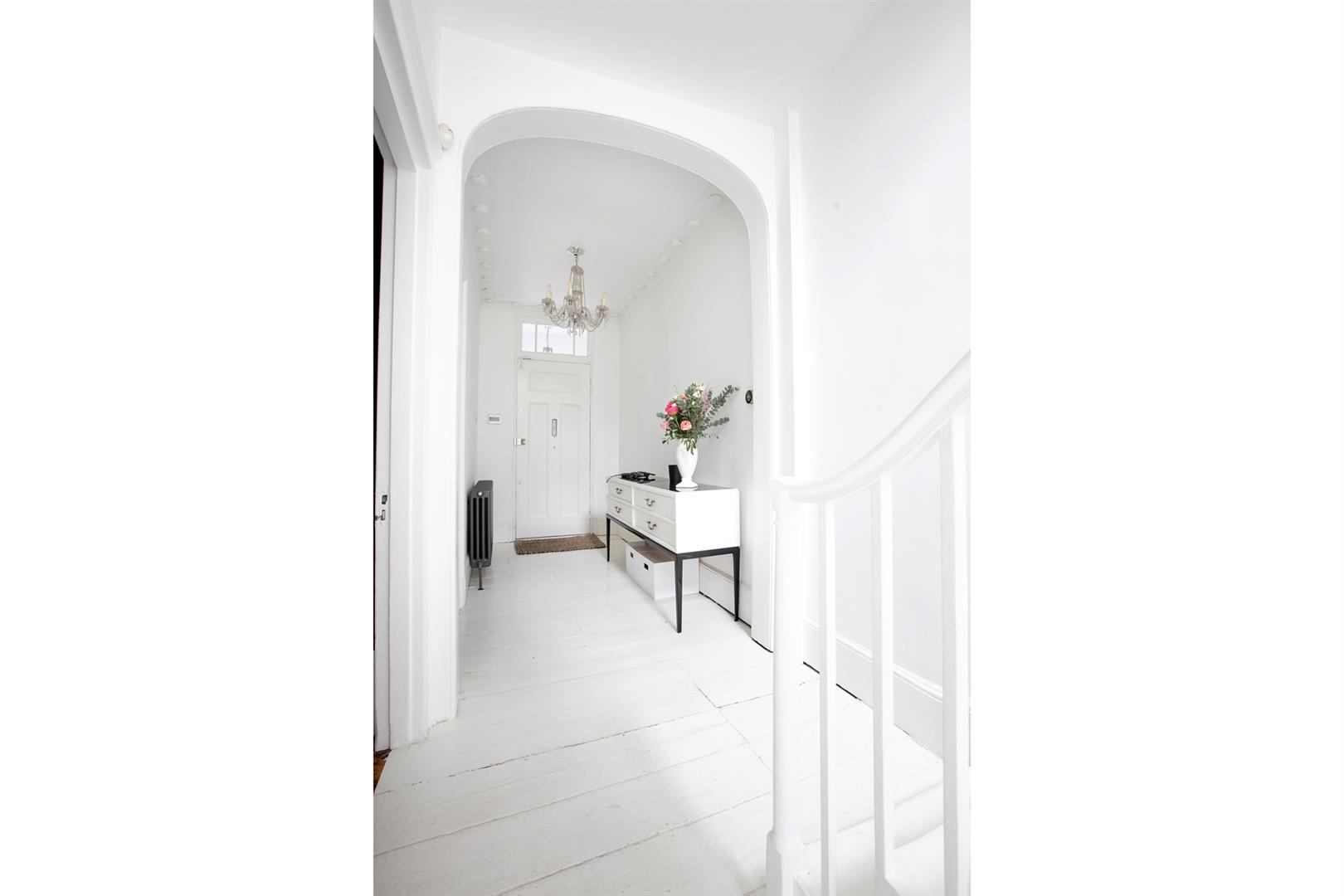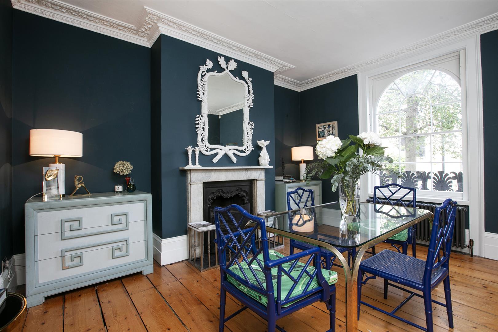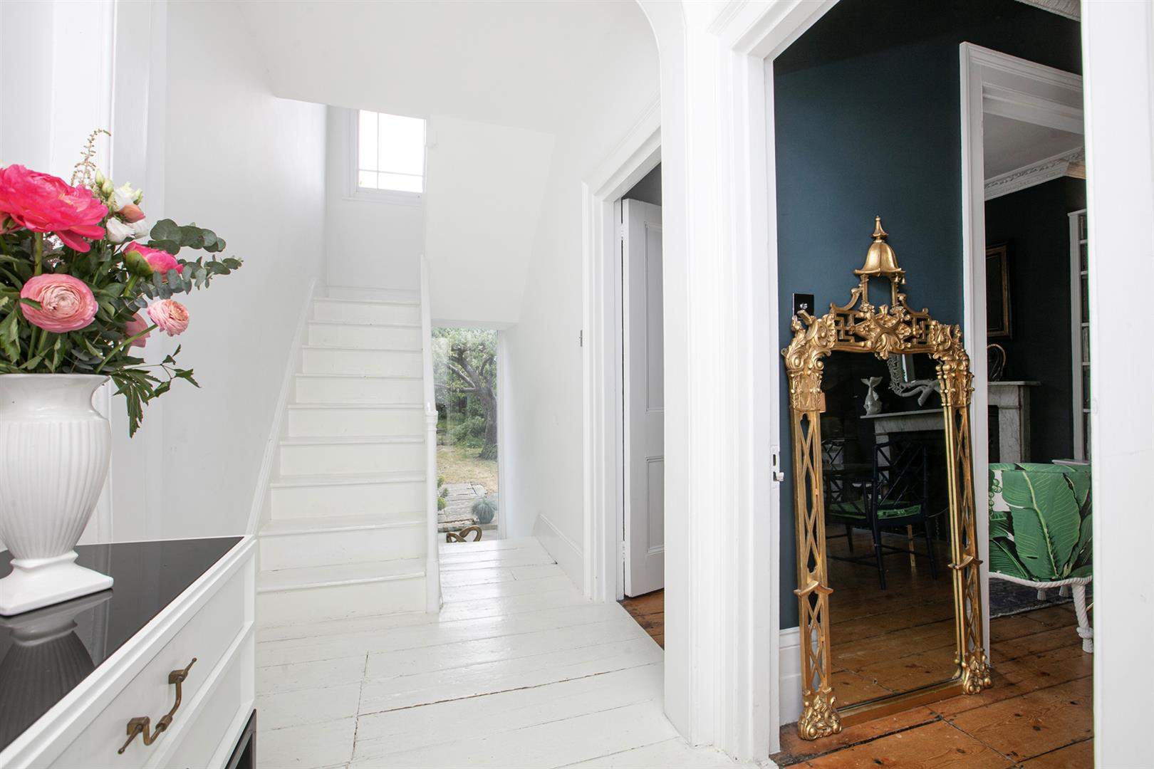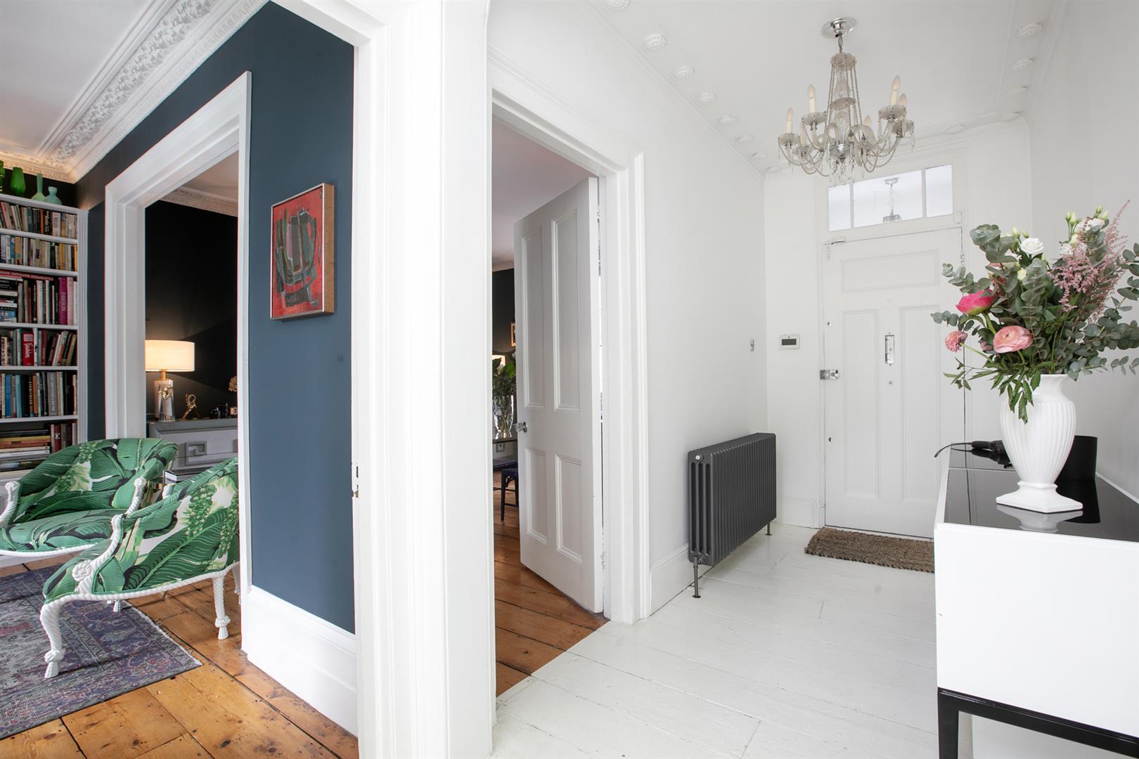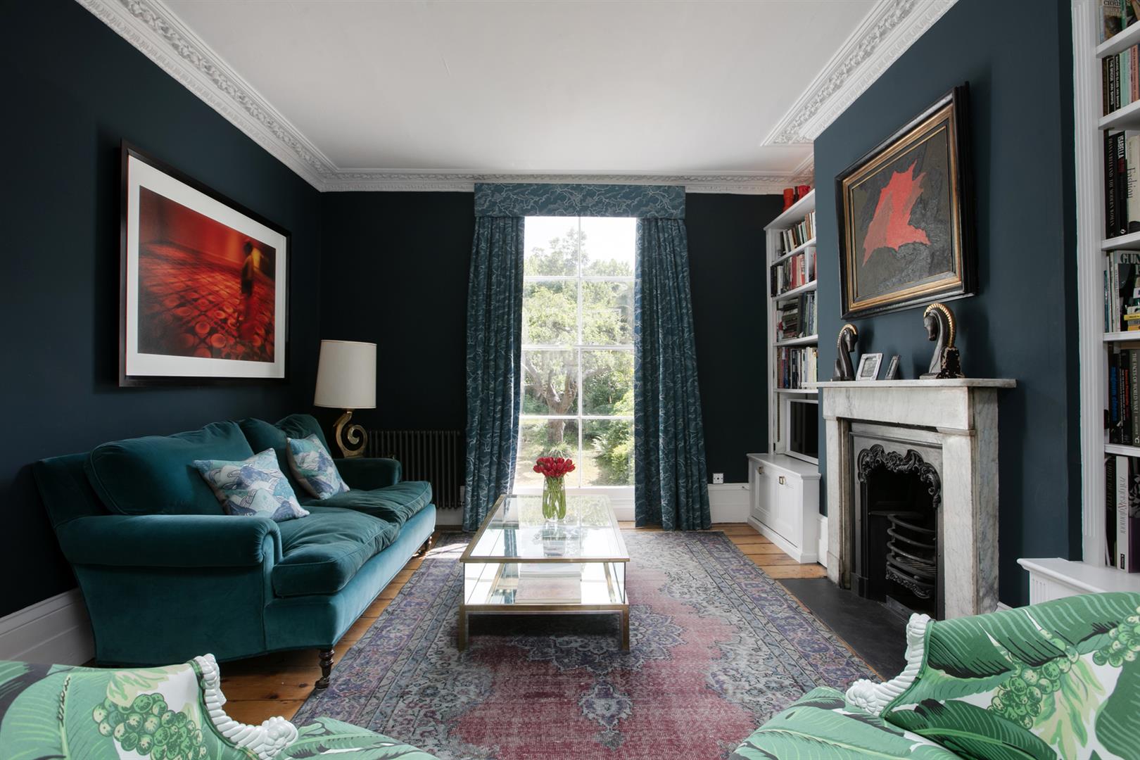 The exterior is delightful with well maintained brickwork, a ground floor arched sash window and neat walled front garden. A recessed portico leads inward to the entrance hall which is wide and bright. Delicate floral original cornicing combine with crisp neutral décor, original floorboards and original staircase for a wonderful first impression. A wide arch draws your eyes rear to that floor-to-ceiling picture window which frames the first of numerous calming garden views. The double reception sits to the right and is presented in a moody squid ink colour. Original ornate cornicing and high skirting boards, each painted white, offers a bracing contrast. An arched window to front and show-stopping floor-to-ceiling sash window to rear afford you yet more garden views. This room would make a fine double bedroom depending on requirements.