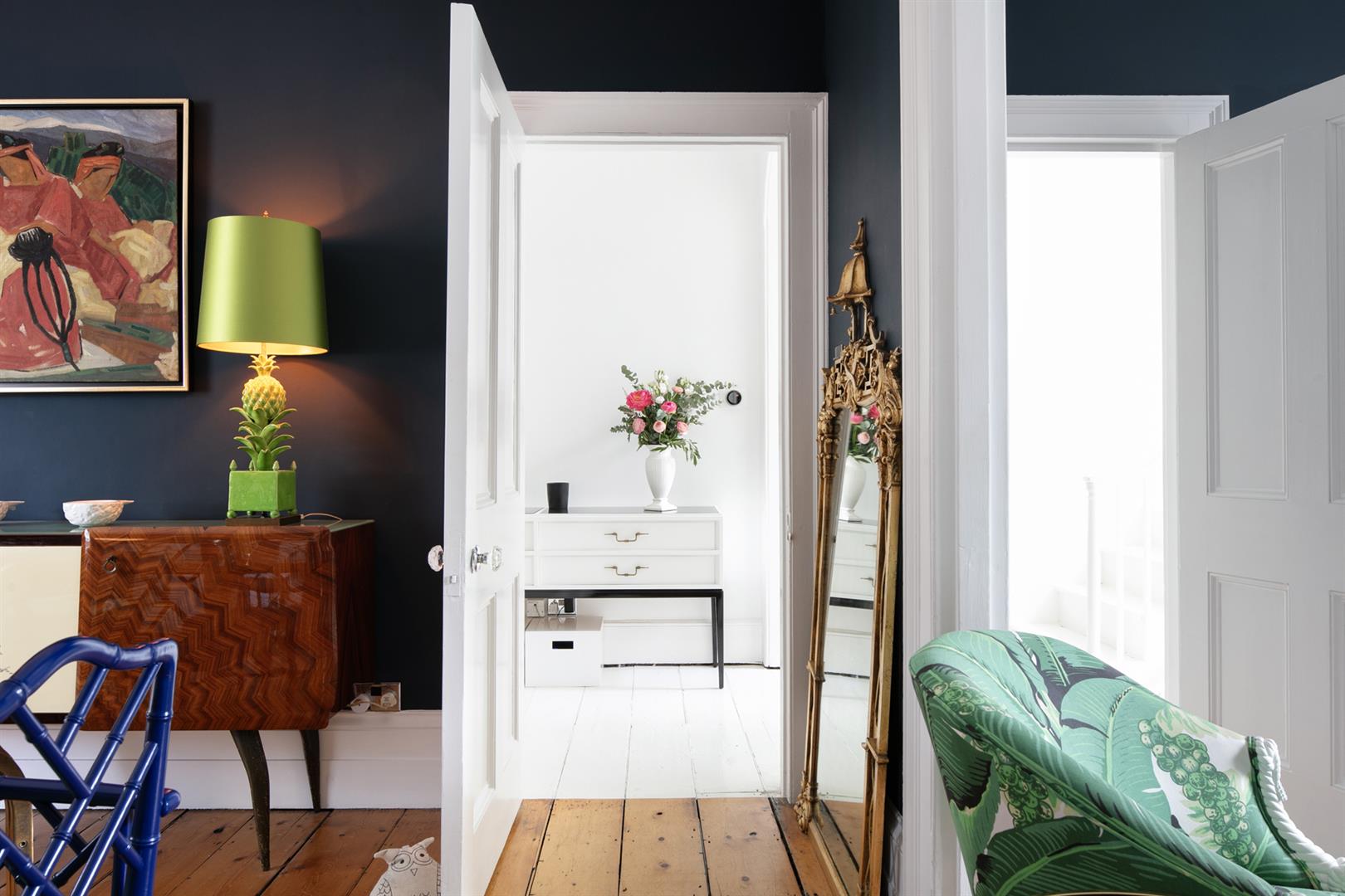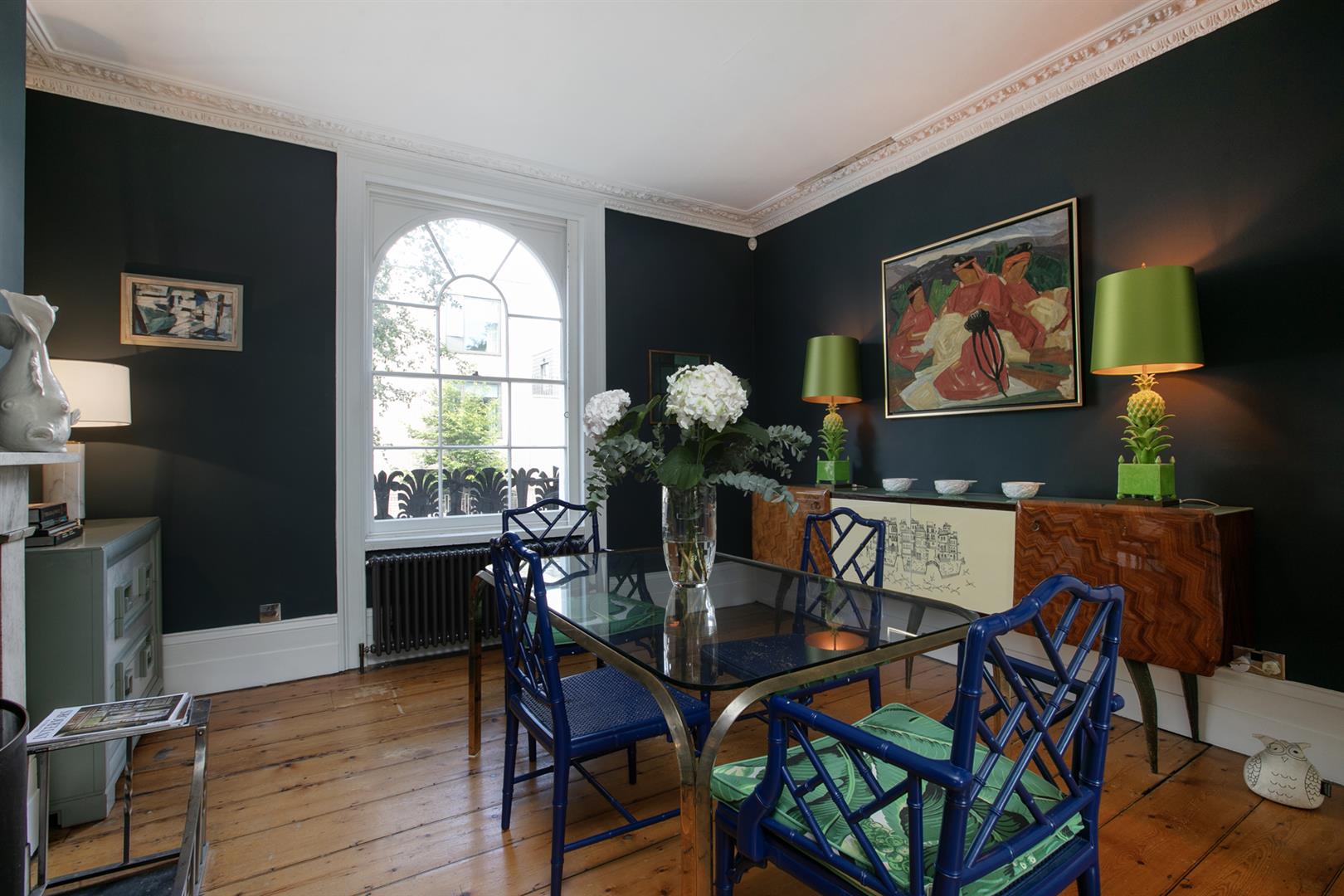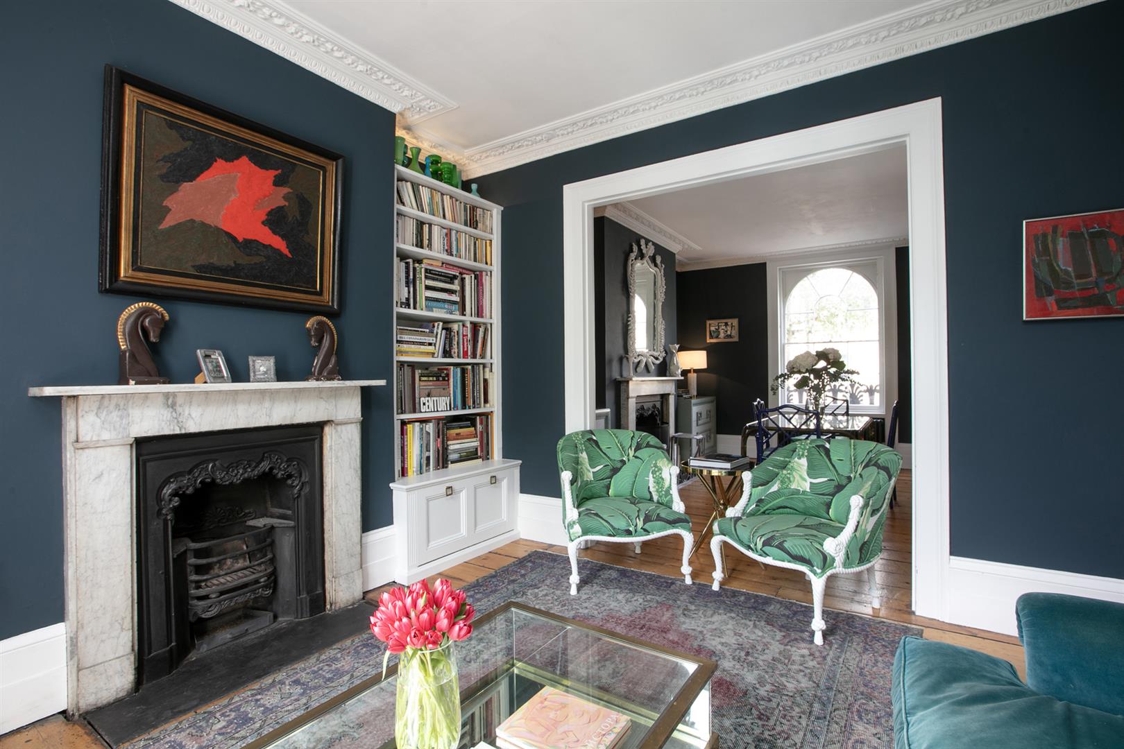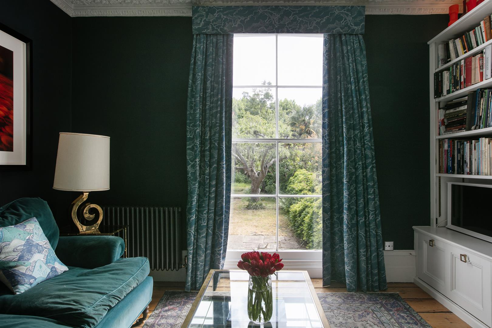 The exterior is delightful with well maintained brickwork, a ground floor arched sash window and neat walled front garden. A recessed portico leads inward to the entrance hall which is wide and bright. Delicate floral original cornicing combine with crisp neutral décor, original floorboards and original staircase for a wonderful first impression. A wide arch draws your eyes rear to that floor-to-ceiling picture window which frames the first of numerous calming garden views. The double reception sits to the right and is presented in a moody squid ink colour. Original ornate cornicing and high skirting boards, each painted white, offers a bracing contrast. An arched window to front and show-stopping floor-to-ceiling sash window to rear afford you yet more garden views. This room would make a fine double bedroom depending on requirements.