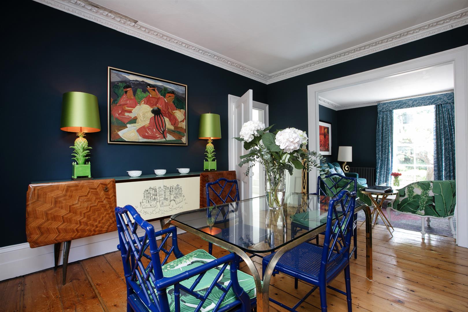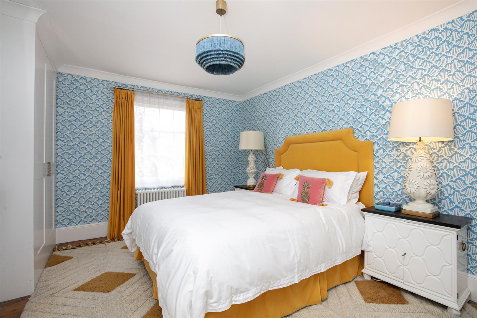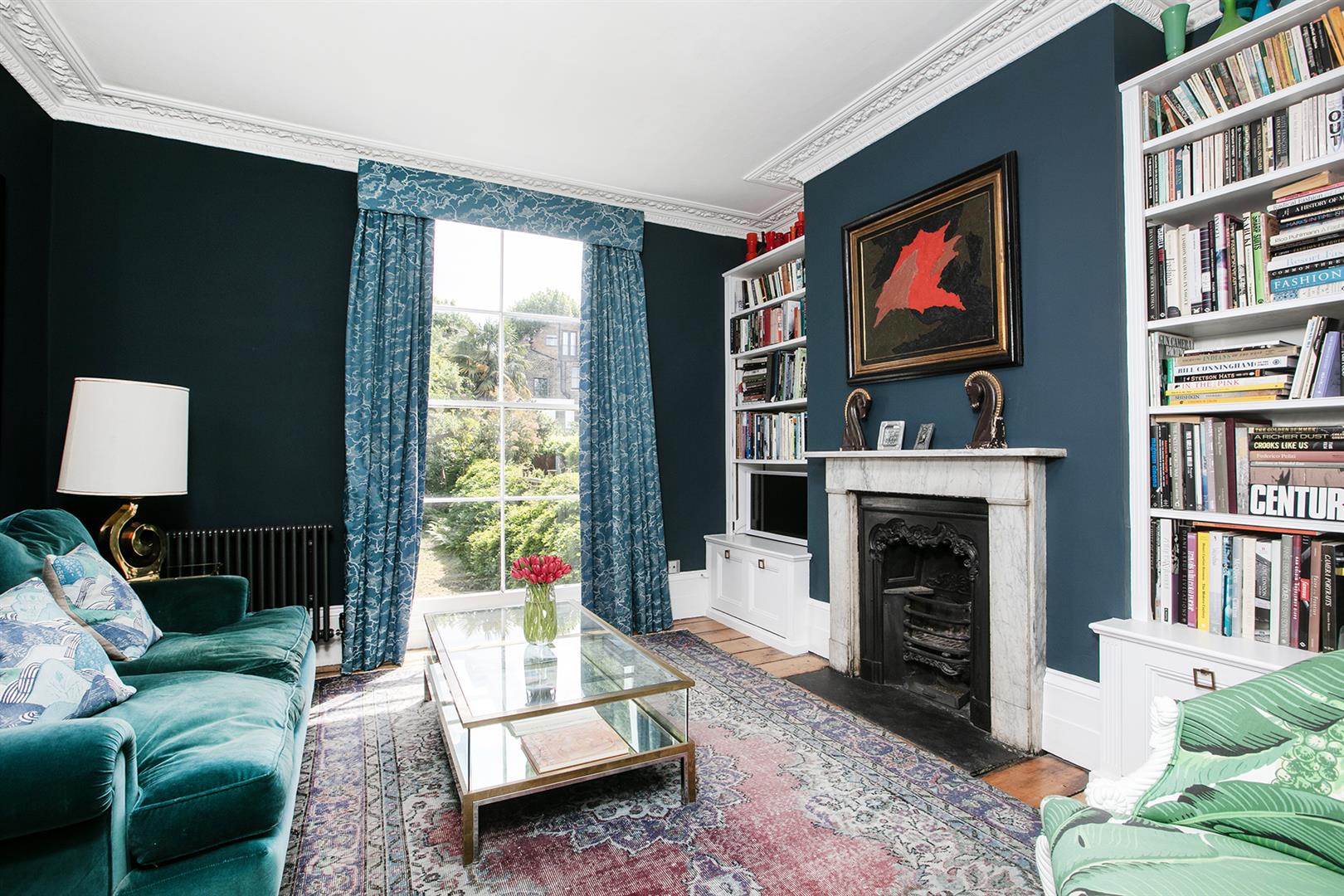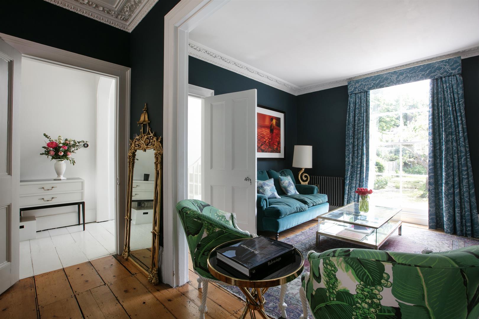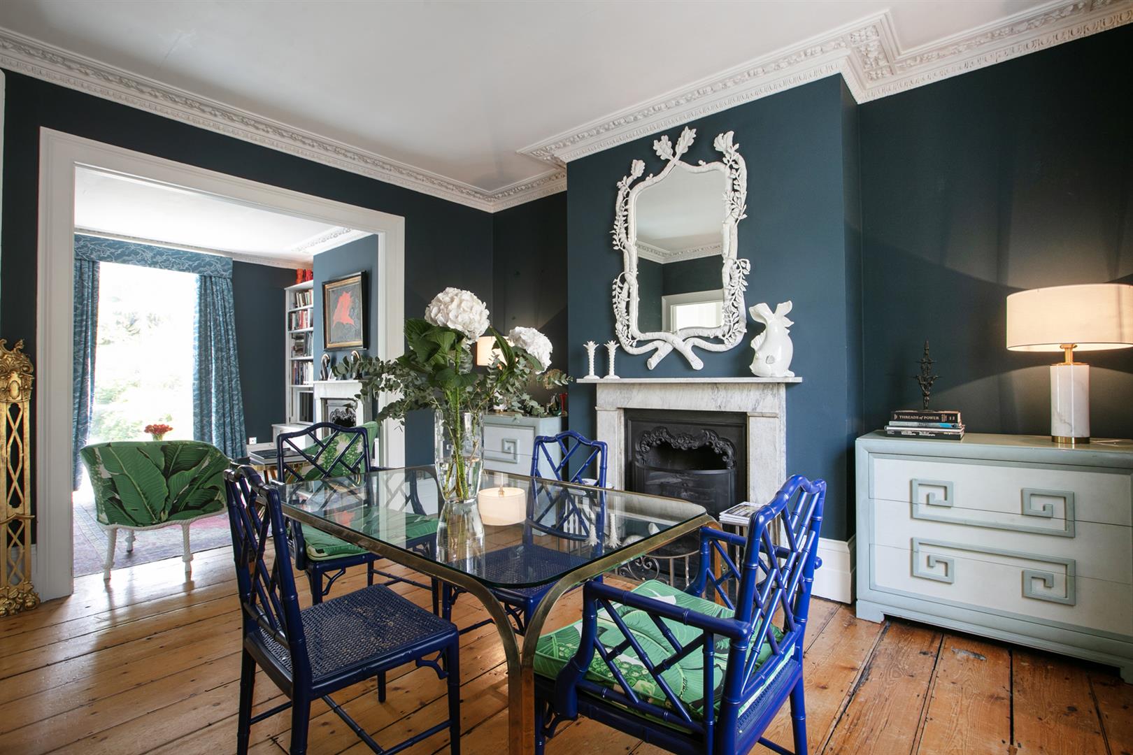 The exterior is delightful with well maintained brickwork, a ground floor arched sash window and neat walled front garden. A recessed portico leads inward to the entrance hall which is wide and bright. Delicate floral original cornicing combine with crisp neutral décor, original floorboards and original staircase for a wonderful first impression. A wide arch draws your eyes rear to that floor-to-ceiling picture window which frames the first of numerous calming garden views. The double reception sits to the right and is presented in a moody squid ink colour. Original ornate cornicing and high skirting boards, each painted white, offers a bracing contrast. An arched window to front and show-stopping floor-to-ceiling sash window to rear afford you yet more garden views. This room would make a fine double bedroom depending on requirements.