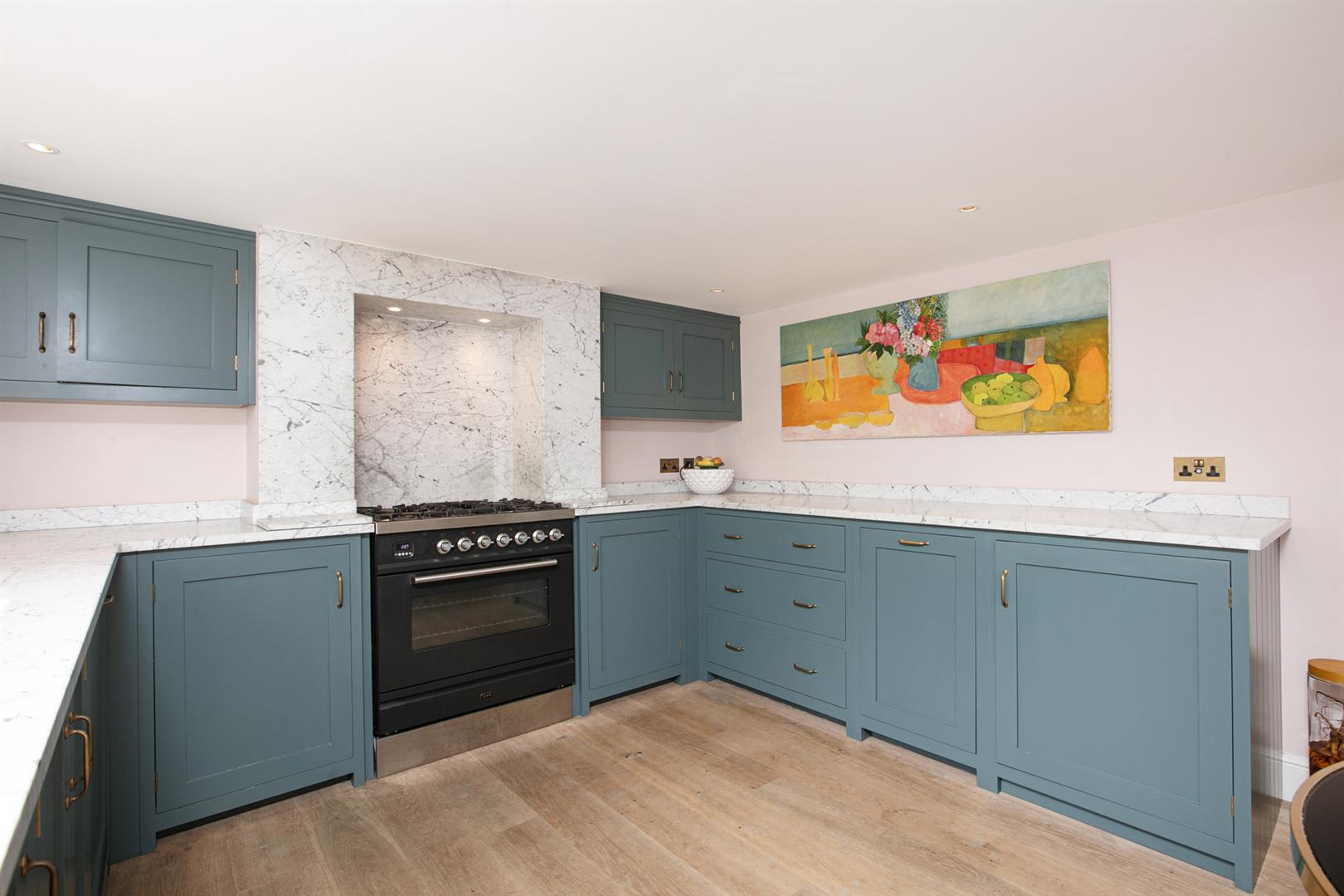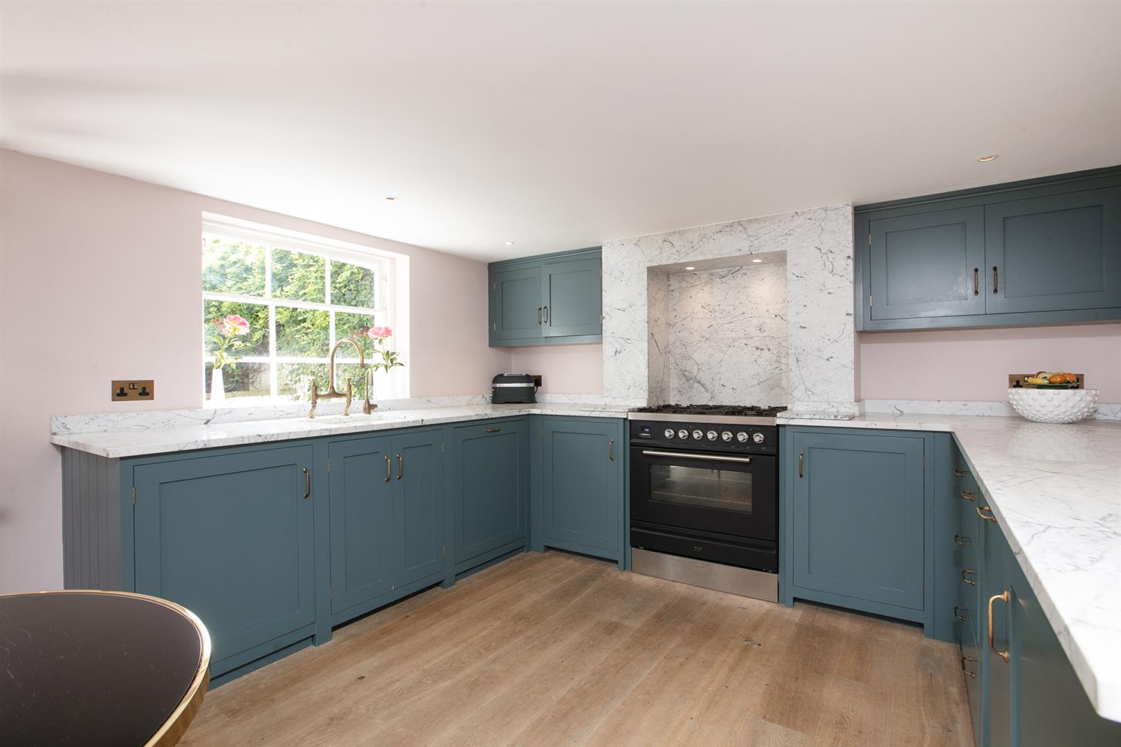 Heading down to the lower ground floor you meet a large open-plan living space with wonderful feature mantel and log burner. The DeVOL kitchen/diner adjoins with tasteful muted blue kitchen cabinets, Italian marble counters, five ring gas range, integrated dishwasher and fridge. There is a recessed pantry and garden access too. The living space also enjoys a side access point and adjoining laundry cupboard. Venturing outward to the garden you find a sunny patio which rises upward to a lush, generous lawn which enjoys dappled shade. The southerly aspect make it ideal for veg-growing, sun-baking and lavish summer gatherings.