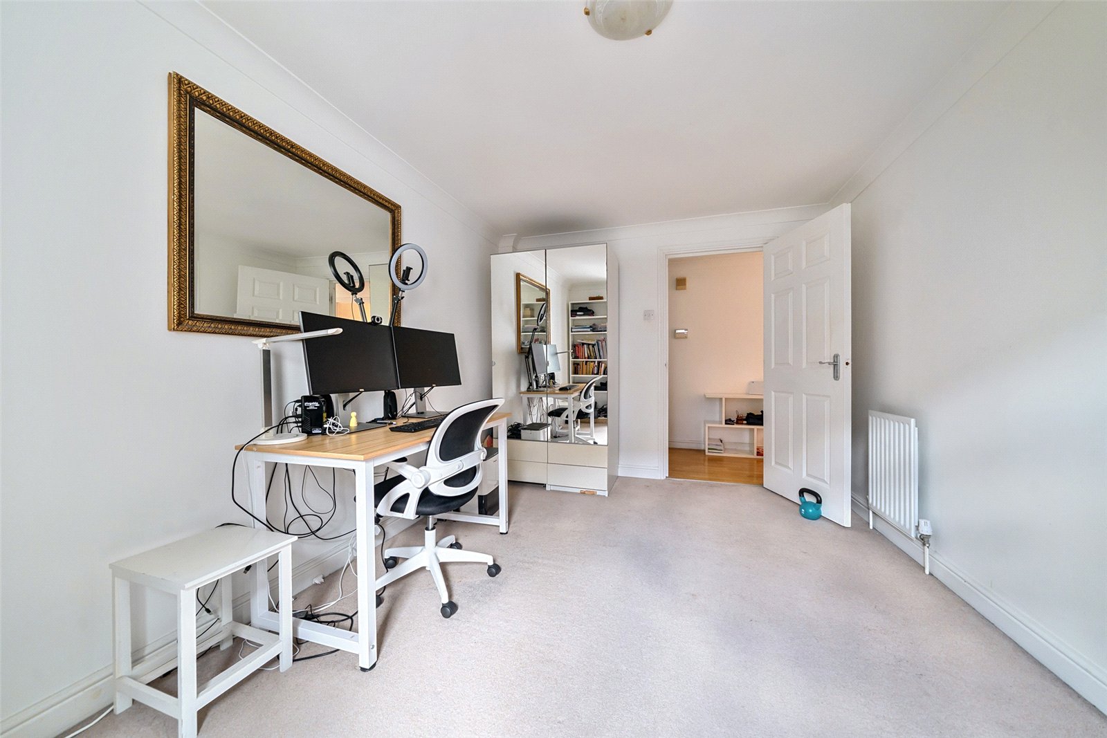 This wonderful home comprises 820sqft of living space. The two spacious bedrooms are on opposite sides of the welcoming entrance hall and the reception stretches the width of the building with balconies at each end. The primary bedroom benefits from an ensuite shower room, fitted wardrobes and a view over the garden. While the separate well-equipped kitchen has a window, integrated appliances and plenty of countertop space.