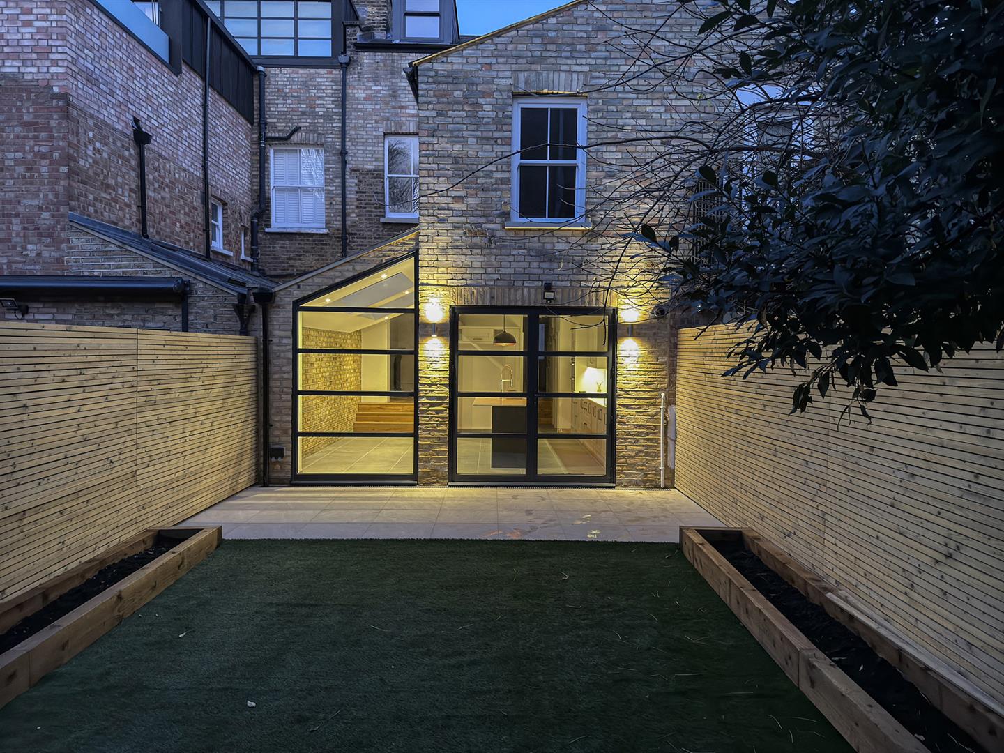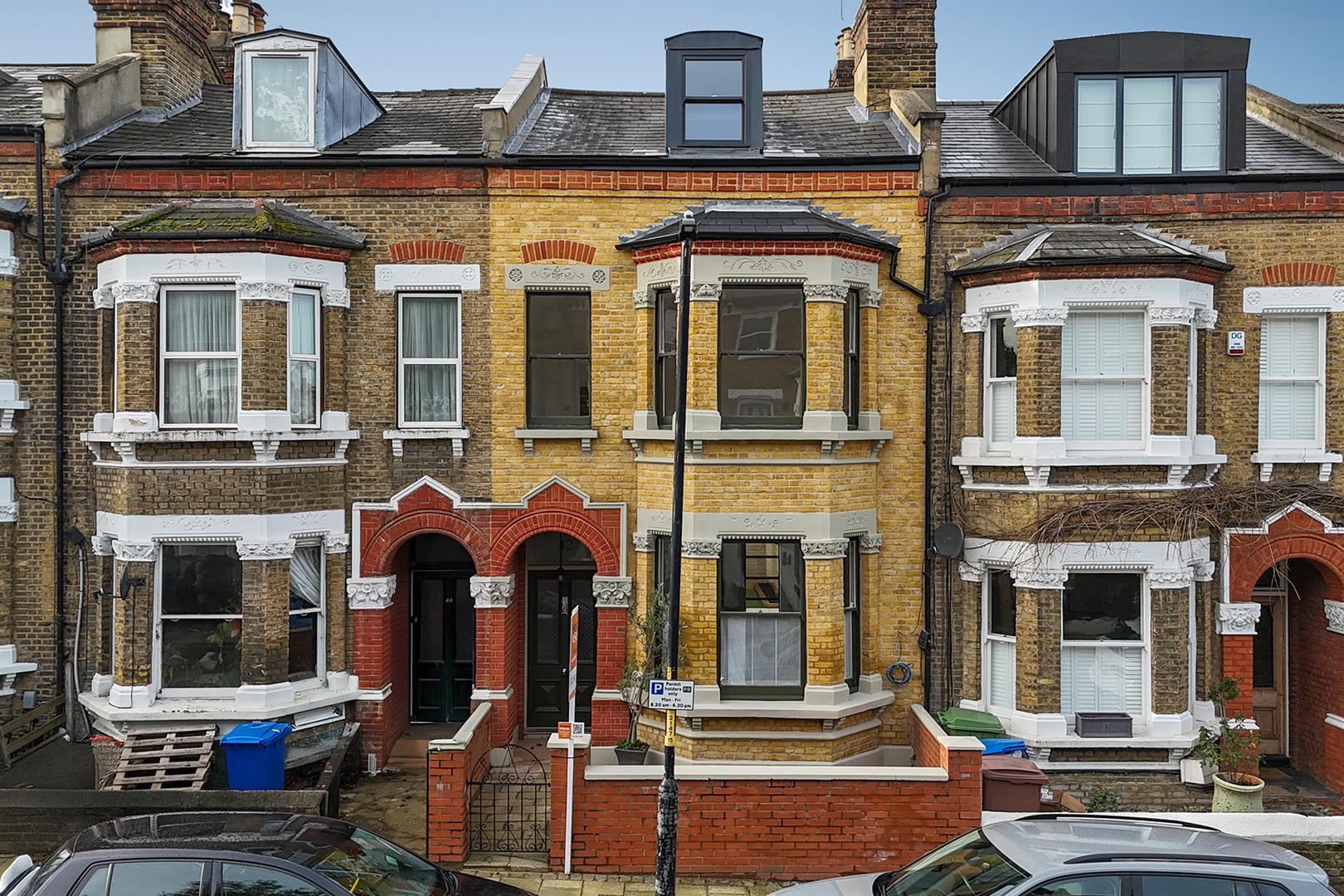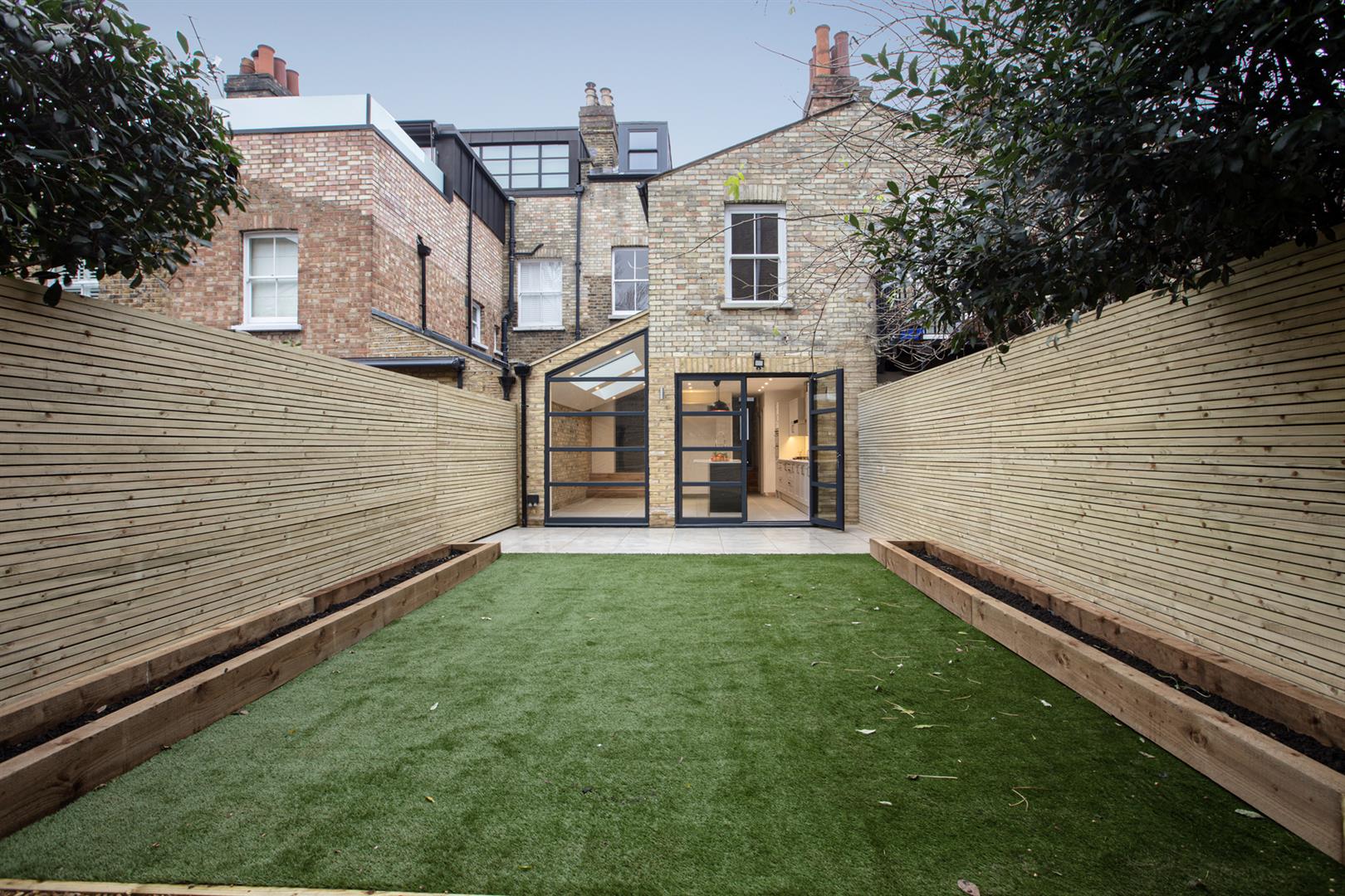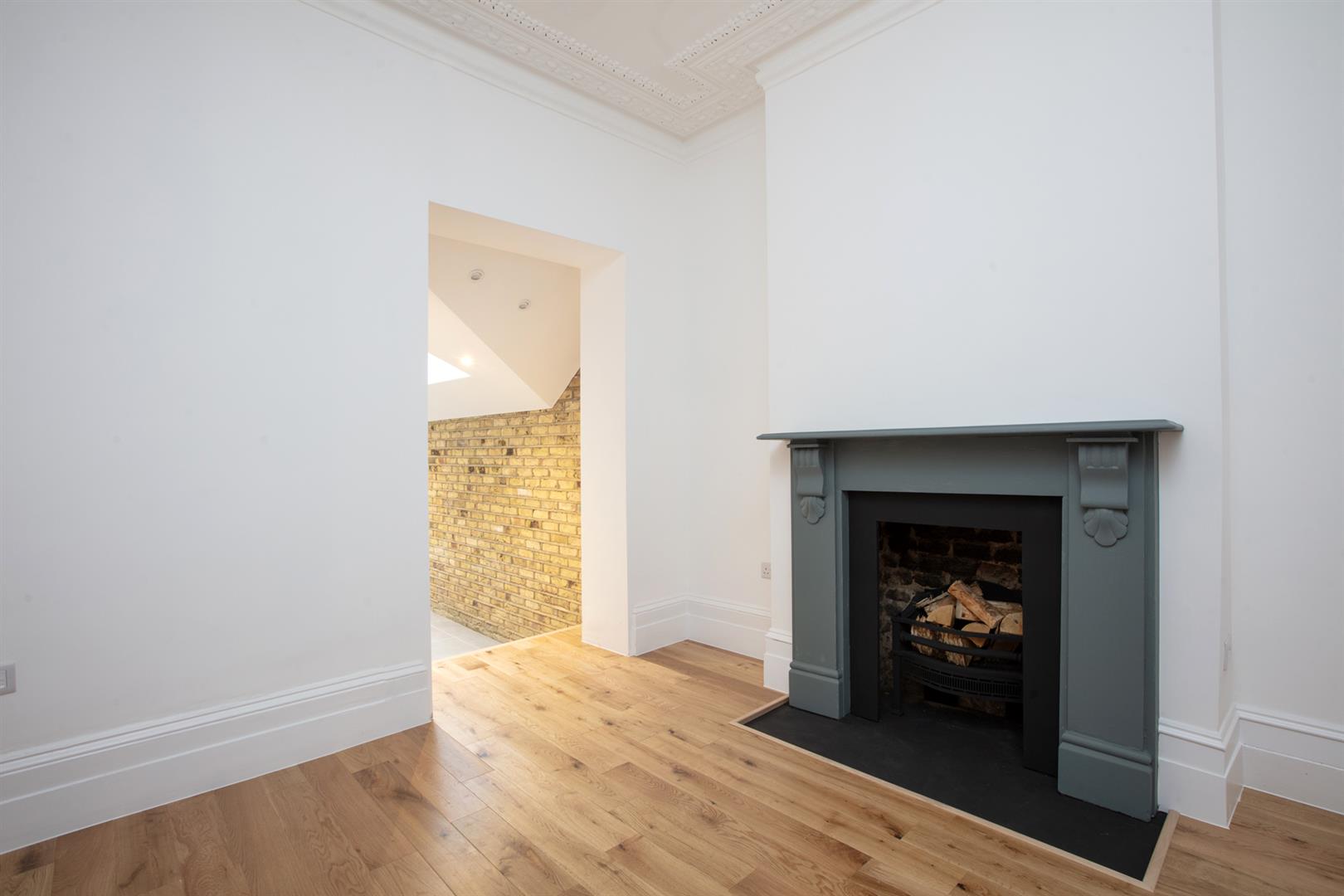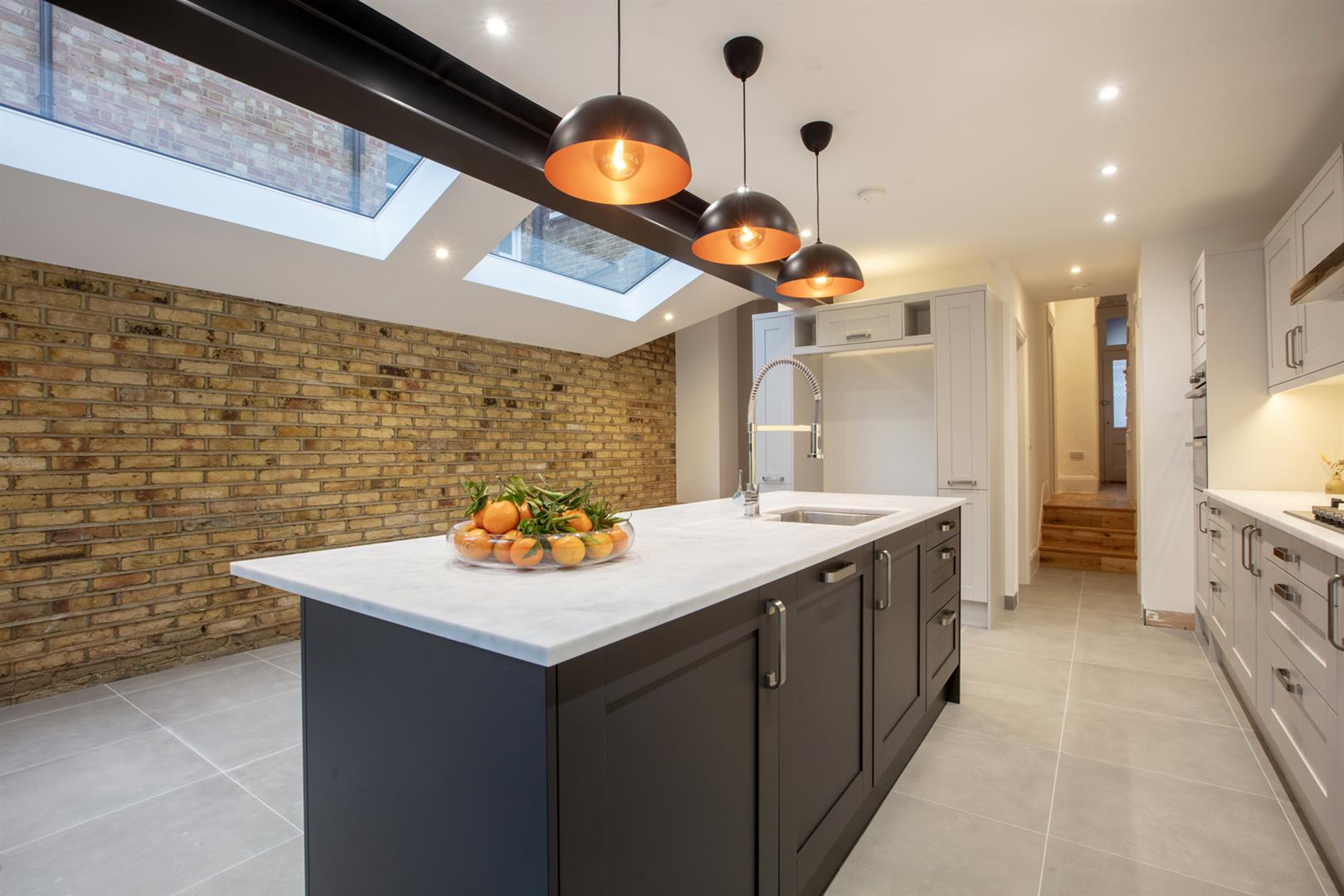 The handsome exterior presents very well with original stucco ornaments and well maintained brickwork. The inner hall has high ceilings, cornicing and corbels and some lovely stripped wooden original doors. Solid oak flooring continues to the double reception which has twin fireplaces and handsomely painted mantels. The rear room benefits from an original ceiling rose and stunning cornicing. An open arch leads rear down a wide half flight to the kitchen/diner which stretches full width to include impressive lounging, dining and cooking. Two huge vaulted skylights, wide Silestone island with breakfast bar, double oven, five ring gas hob, integrated dishwasher and space for a fancy American style fridge/freezer. A wall of glass to the rear affords the room yet more light and opens to a really pretty garden with bleached cedar fencing, sleeper planter beds, astro turf lawn and two separate patios.