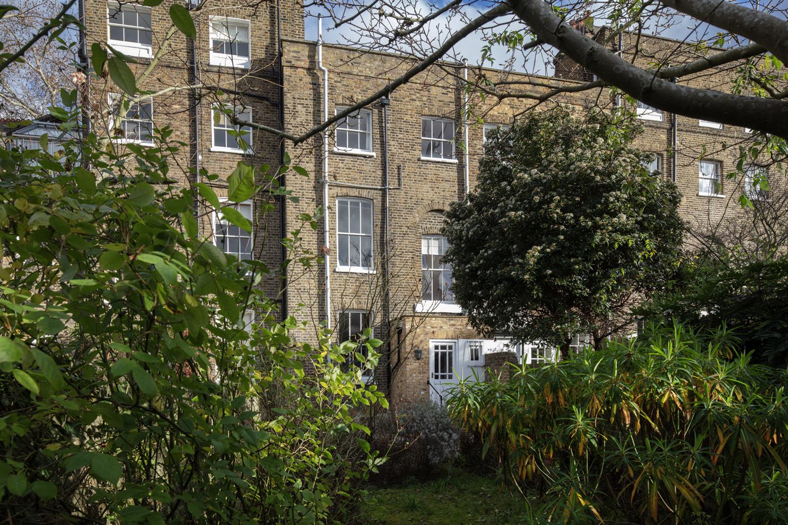 The generous York stone paved front garden invites you up a step from the Grove and onward to the original door which bears its original decorative fanlight. The inner hall is long with high ceiling and an arched cornice that leads to the handsome rear stairwell. To the right you find the double reception which has an aspect to both front and rear. The front-facing arched sash window enjoys original shutters looking out to the beautiful mature trees lining Camberwell Grove. There is a marble feature mantel piece, and hinged double doors connect you to the West facing room with a fine view over the walled garden that bathes in mellow evening sun. The rear of the entrance hall has fitted storage, a w/c and garden access.
