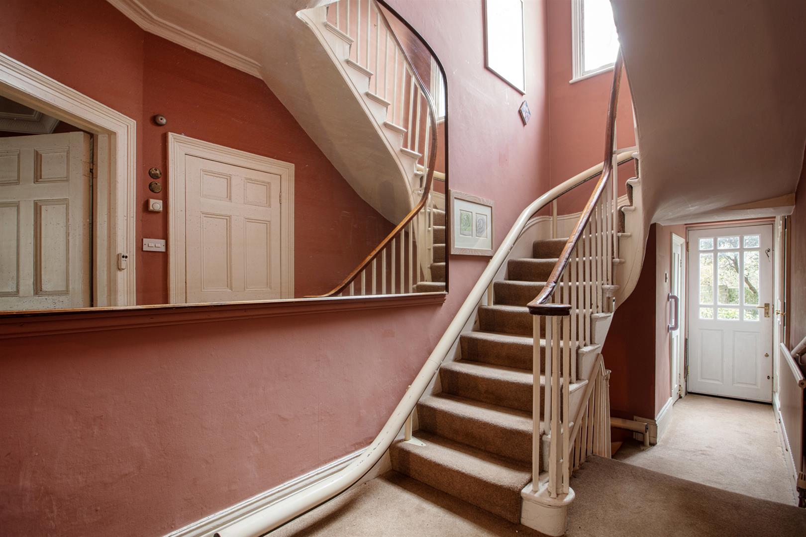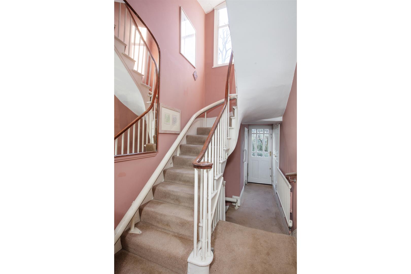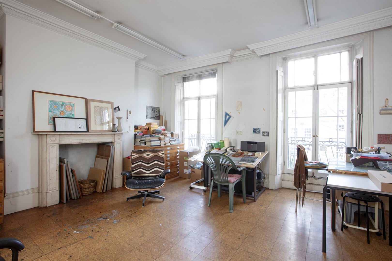 Back in the entrance hall you can pause to appreciate the fine original staircase with its charmingly curved original hardwood hand rail and original banisters. A rear-facing sash window floods the landing with light as you move up to the first floor piano nobile and enter a most impressive high ceilinged front facing room, currently an art studio (this house has nurtured creativity over recent years with an artist and a musician inspired to create their art there), which commands lovely views over the Grove through a duo of floor-to-ceiling windows with shutters and Juliette balconies. Boasting another feature mantel piece in marble, the space would make a fine drawing room or indeed a most-coveted master bedroom. An additional room adjoins to the rear, divided by period shutters for maximum flexibility.