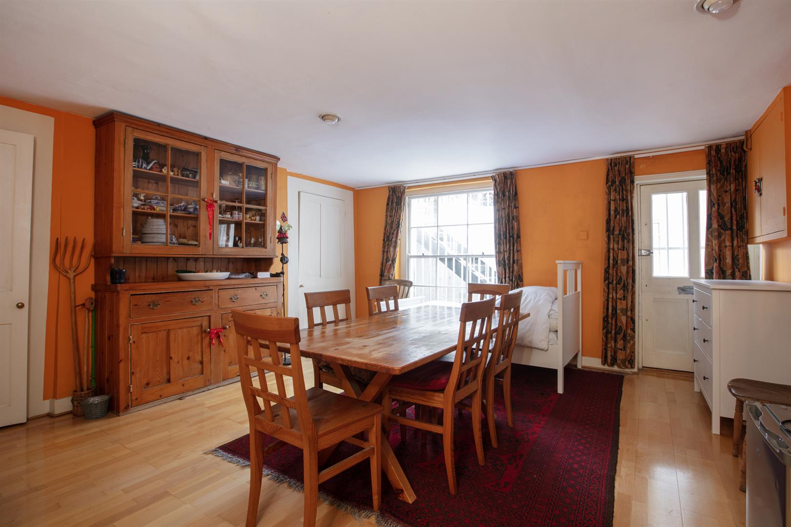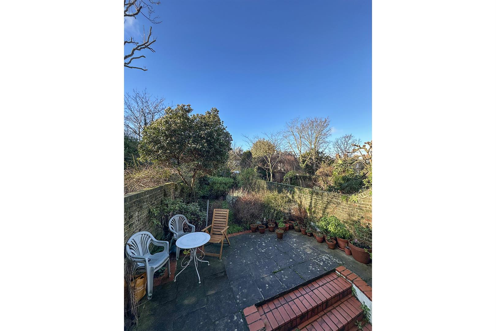 On the lower ground floor you find a large front-facing room which is currently used as a formal dining space but could also be used as a bedroom. It has more fitted storage and direct front access via external steps to the front garden that sits above external deep vault storage. The kitchen sits to the rear of the lower ground floor with opposing rows of cabinet and counter space. Double doors open to sweeping steps up to the rear garden paved patio and a pretty well-stocked garden. This floor is completed by a small bathroom.
