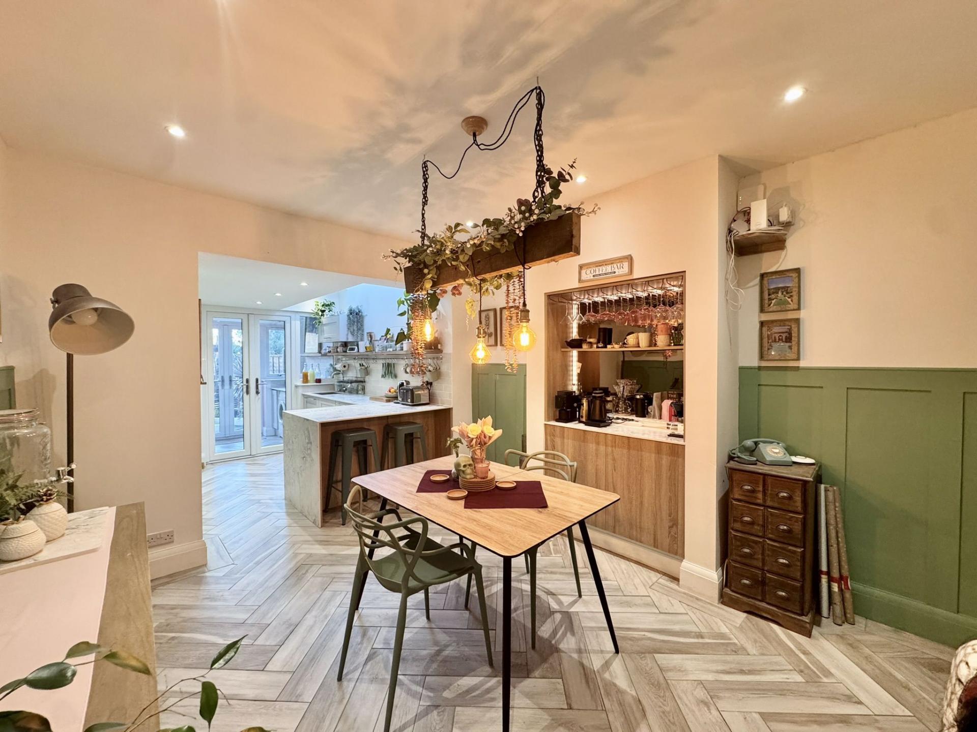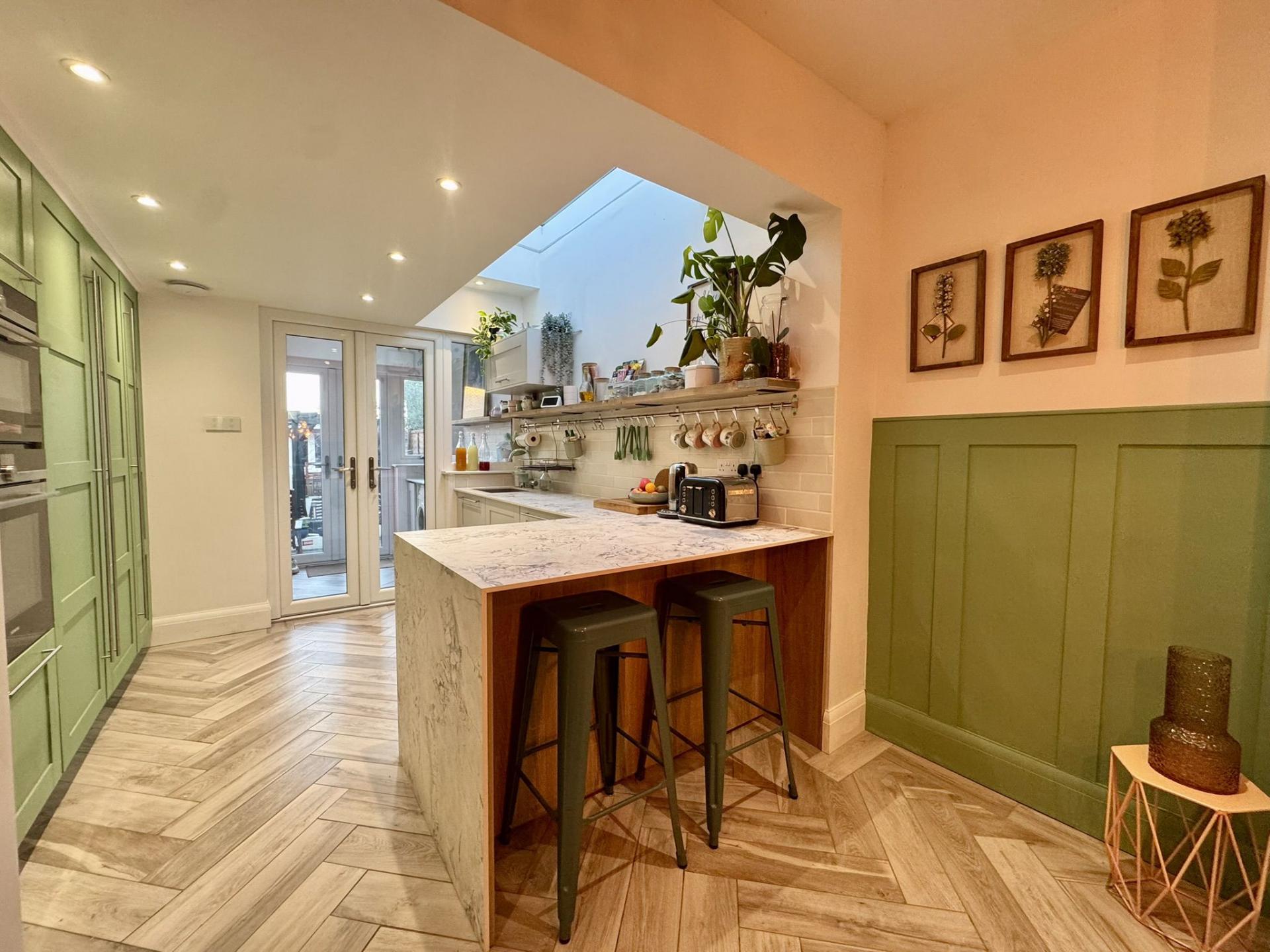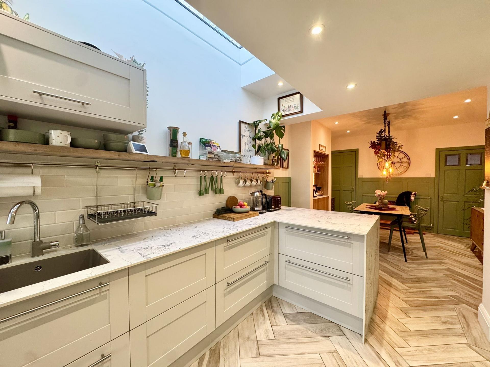 Fitted with a range of wall and base units, sink and drainer unit, electric WIFI, self cleaning oven with microwave combi. Underfloor heating, radiator, uPVC double doors to the rear elevation and a sky light. Integrated fridge, integrated freezer, and dishwasher. The kitchen also benefits from a breakfast bar, a door providing access to the first floor accommodation and under floor heating in the kitchen area