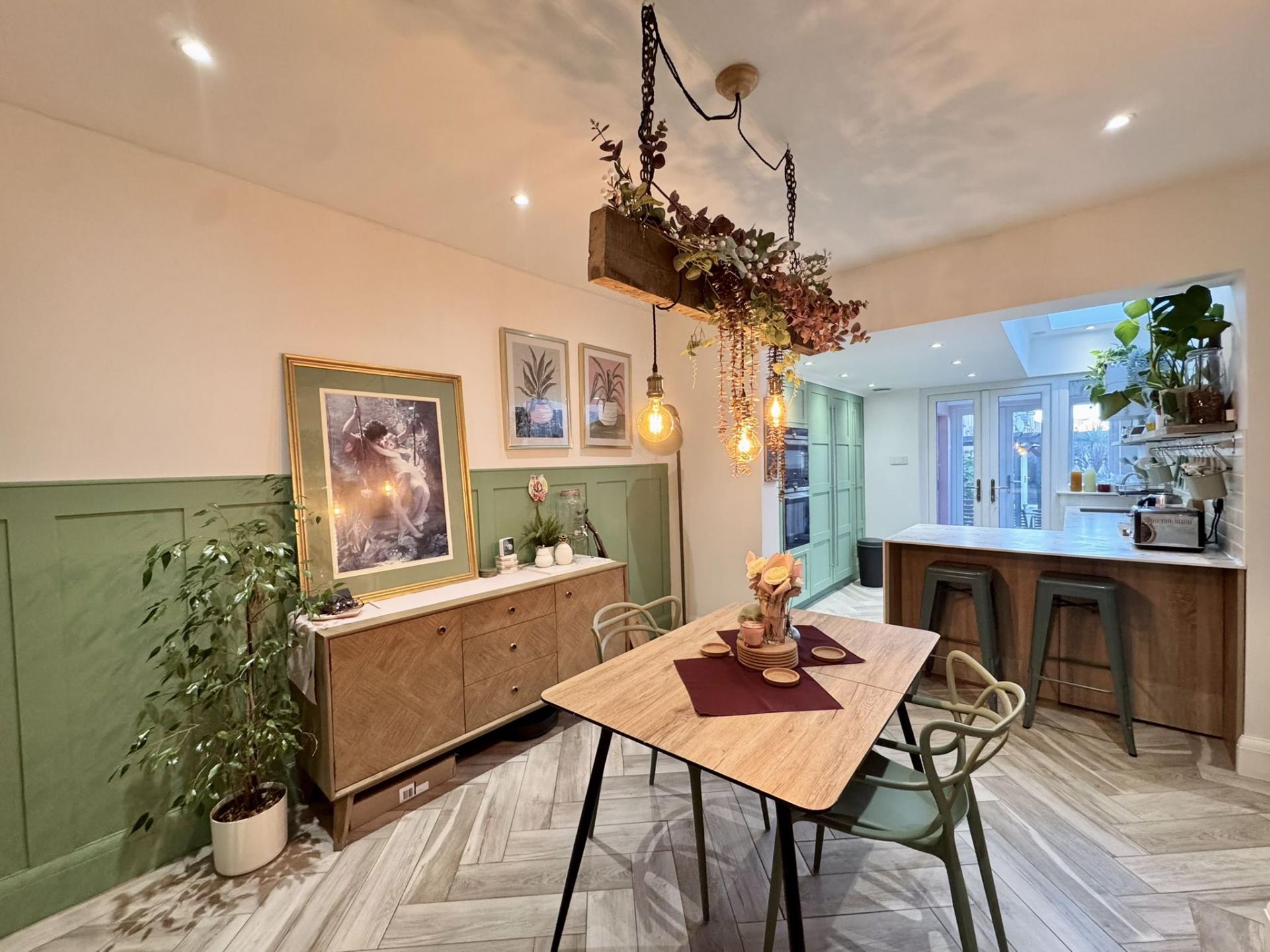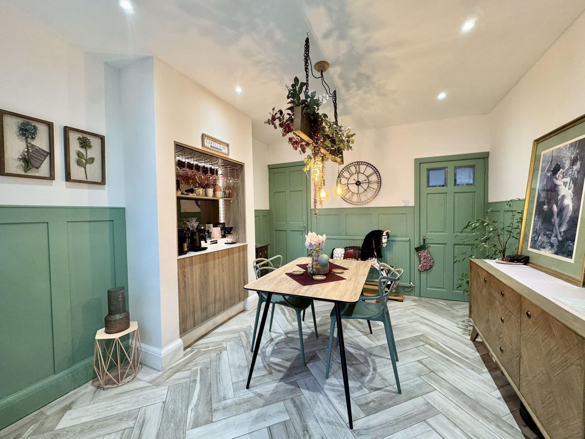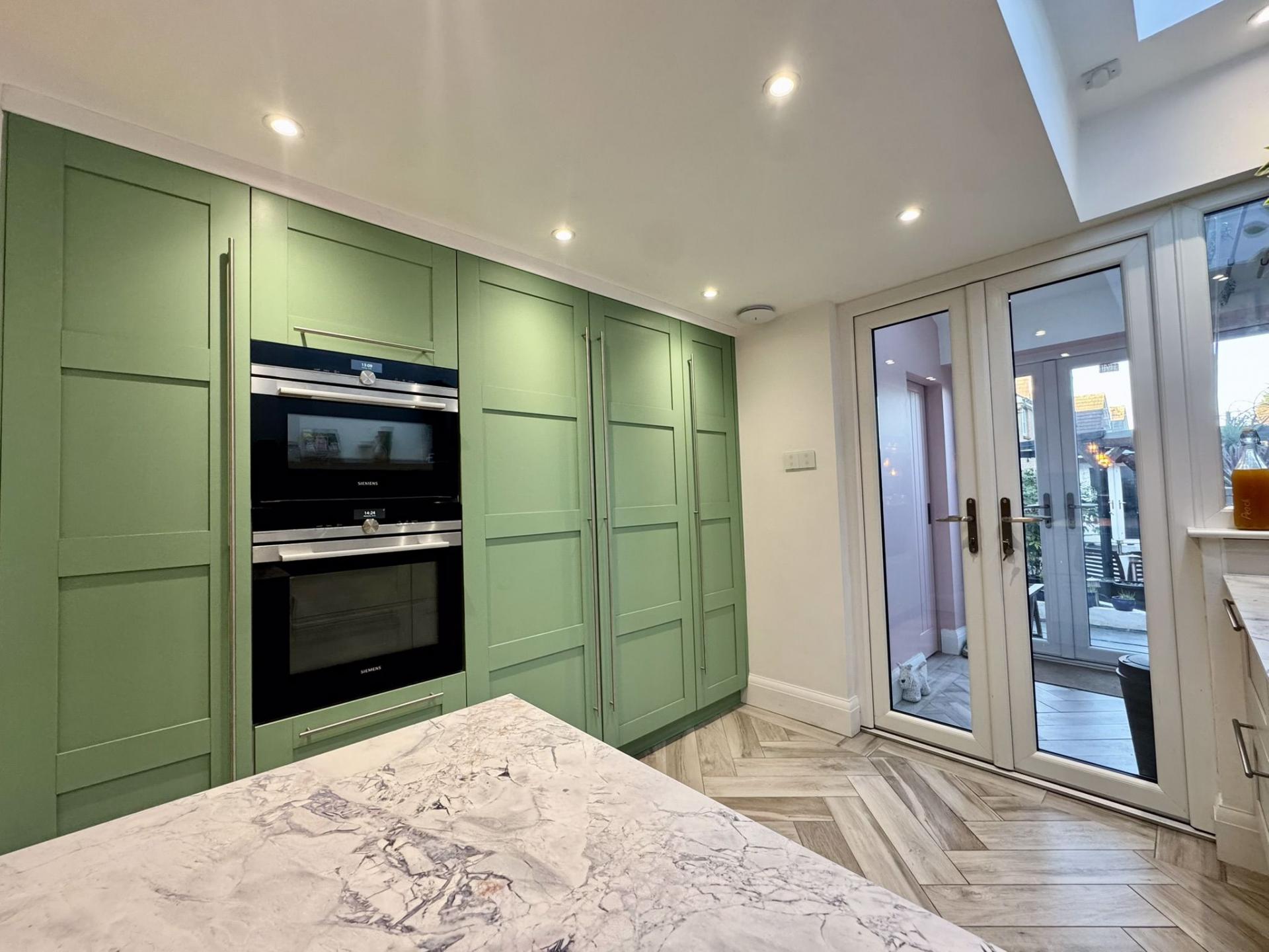 Fitted with a range of wall and base units, sink and drainer unit, electric WIFI, self cleaning oven with microwave combi. Underfloor heating, radiator, uPVC double doors to the rear elevation and a sky light. Integrated fridge, integrated freezer, and dishwasher. The kitchen also benefits from a breakfast bar, a door providing access to the first floor accommodation and under floor heating in the kitchen area