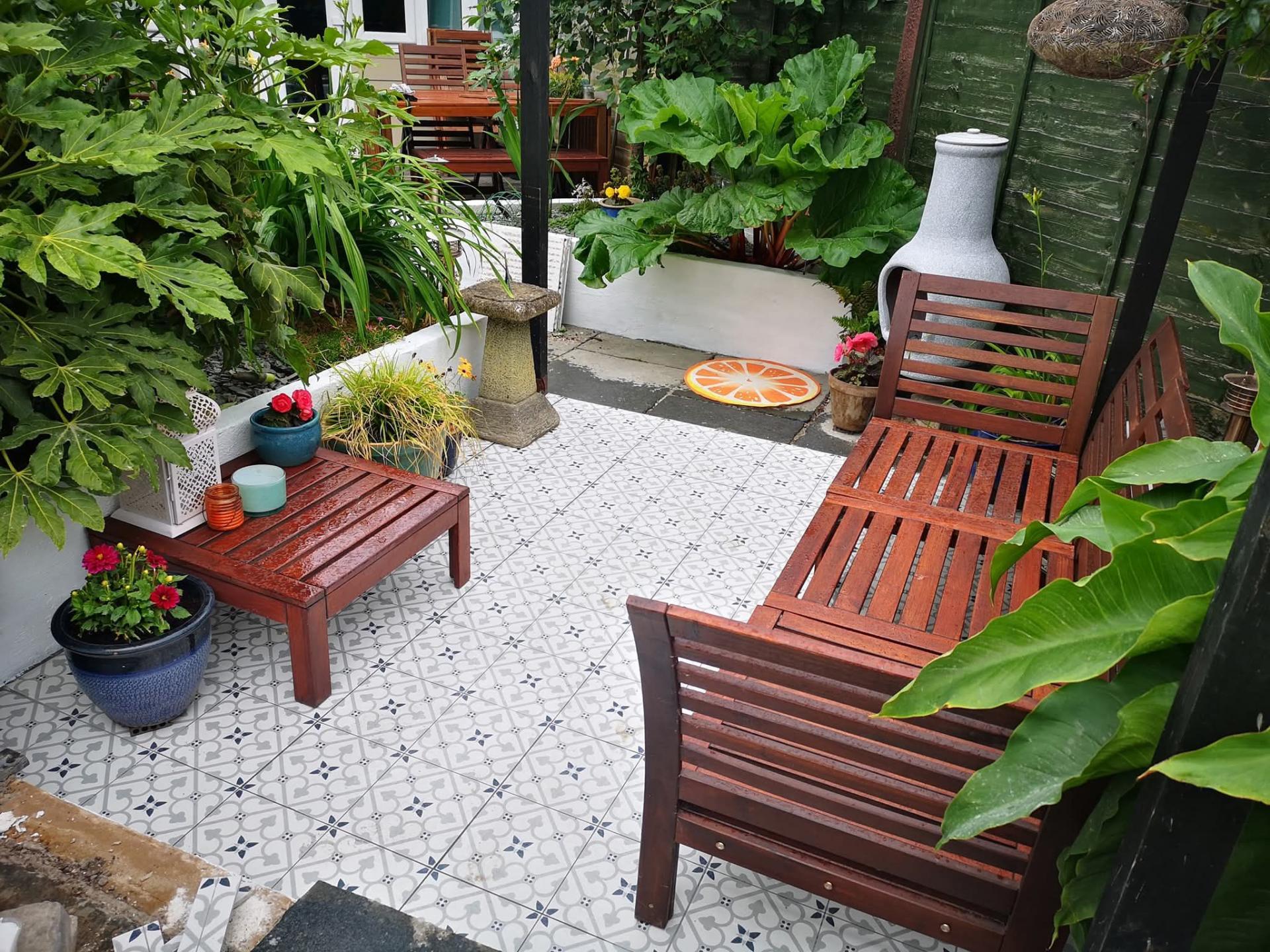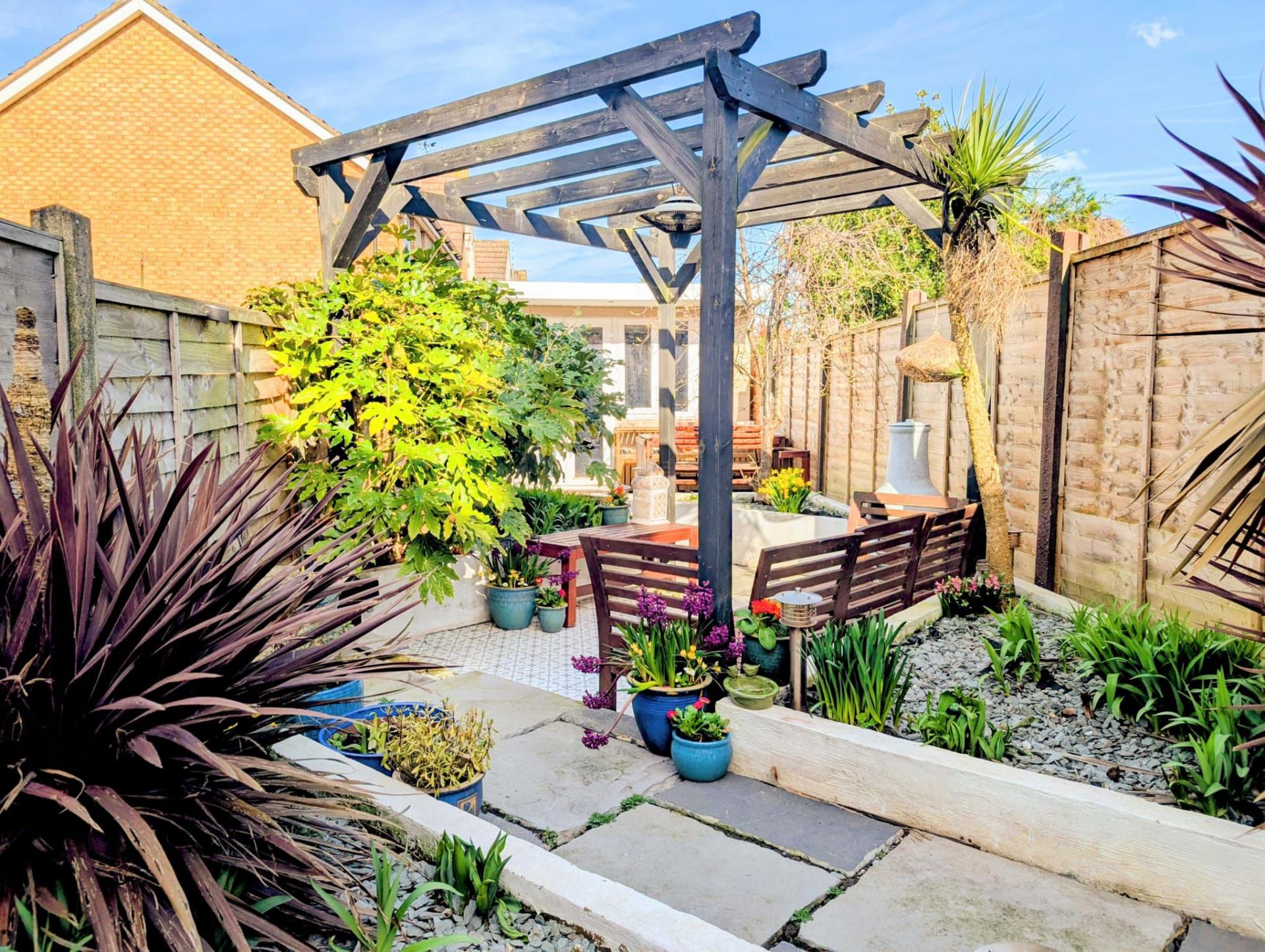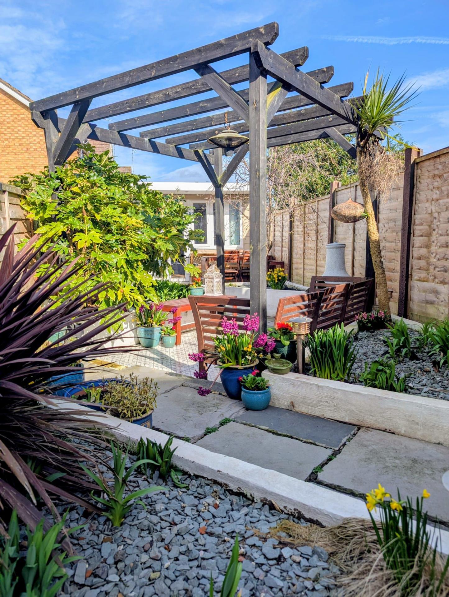 Landscaped garden with raised boarders and Meandering path way leading to the summer house