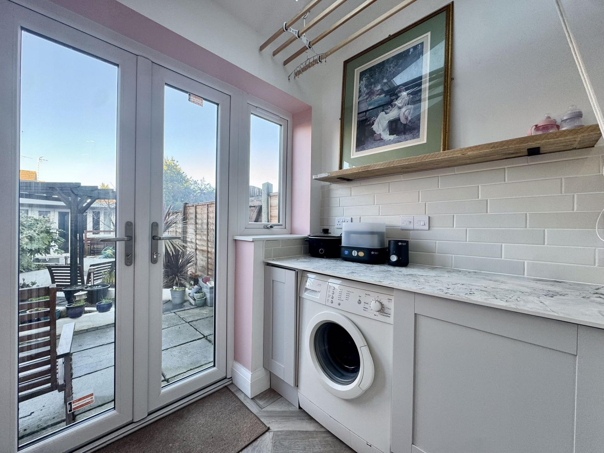 Plumbing space for a washing machine, base units for storage and uPVC double doors to the rear elevation