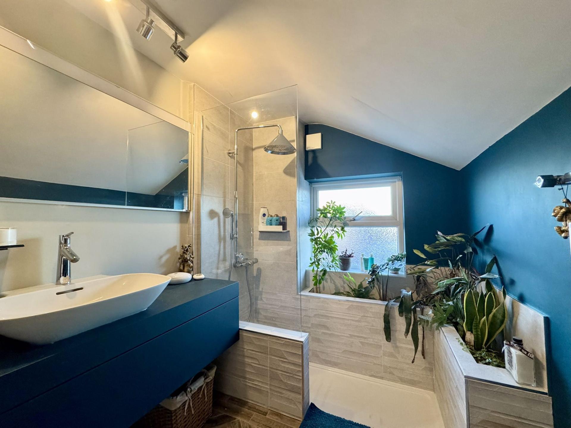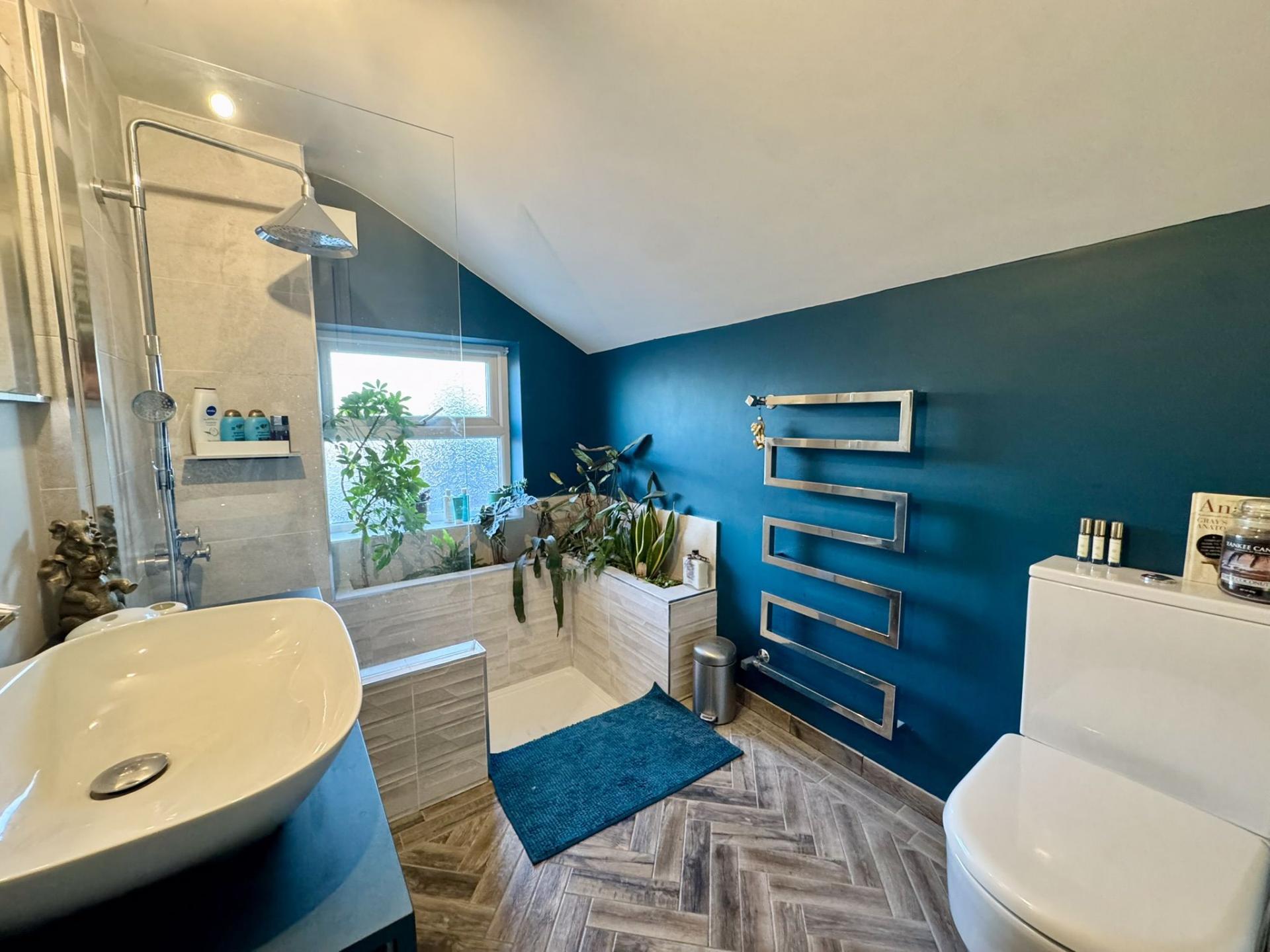 Beautifully designed bathroom with a low level WC, hand basin fitted unit and a radiator. Step down into the walk in shower and uPVC window
