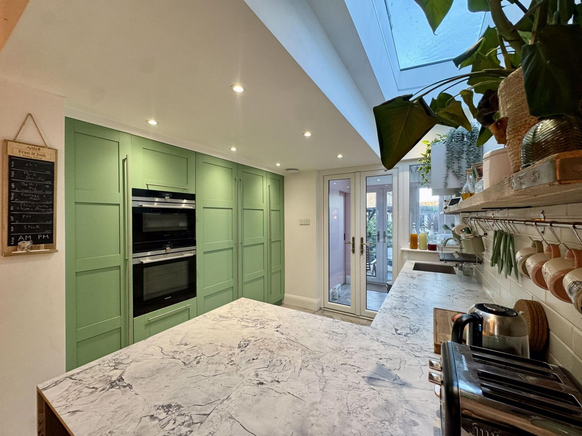 Fitted with a range of wall and base units, sink and drainer unit, electric WIFI, self cleaning oven with microwave combi. Underfloor heating, radiator, uPVC double doors to the rear elevation and a sky light. Integrated fridge, integrated freezer, and dishwasher. The kitchen also benefits from a breakfast bar, a door providing access to the first floor accommodation and under floor heating in the kitchen area